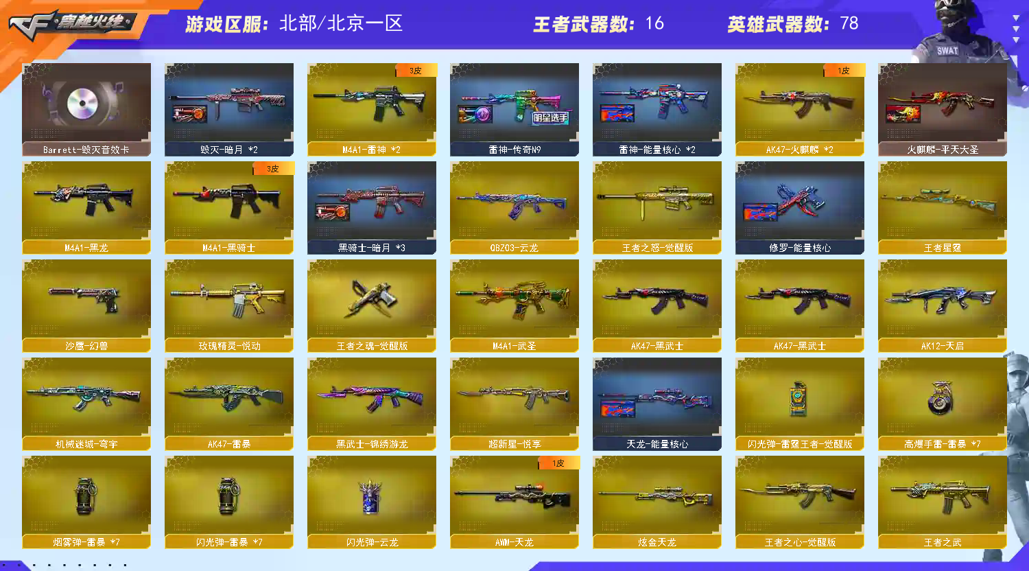 步枪:火麒麟 黑龙 雷神 黑骑士 黑武士 天启 武圣 雷暴 白虎 雲龙 金色蔷薇 王者之心 超新星悦享 玫瑰精灵悦动 王者之势 王者之武 炫金黑龙