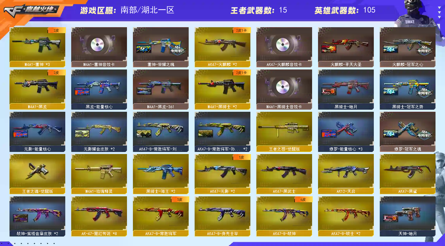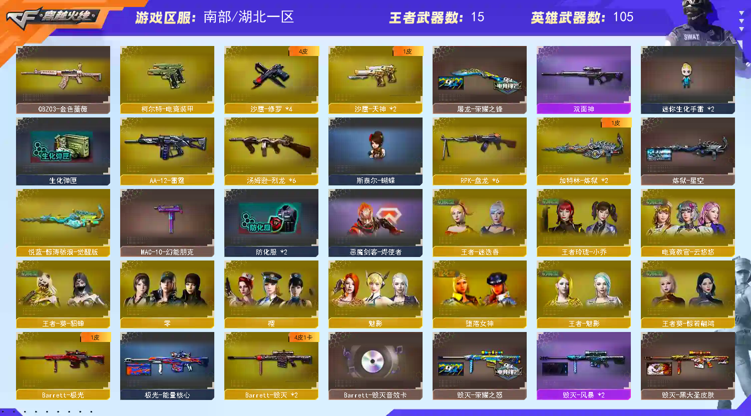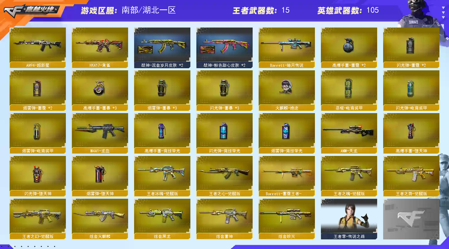 123V 8王者 4炫金 6盘龙 6烈龙+斯泰尔蝴蝶 【重要角色】_樱/魅影/_零/电竞教官-云悠悠/王者-魅影/王者-葵-貂蝉/王者玲珑-小乔/王者-迷迭香/王者葵-惊若翩鸿/堕落女神/王者零-传说之路/职业选手/零-热舞青春/铁骑荣耀/葵-赛博朋克/空/零-水下丽影/灵狐者-黄金海岸/兰-海滩派对【英雄武器】Barrett-毁灭(2)/Barrett-极光/Barrett-暗月传说/王者之怒-觉醒版/Barrett-雷霆王者-觉醒版/AWM-天龙/M4A1-雷神(3)/M4A1-黑龙/M4A1-龙血/M4A1-黑骑士(2)/黑骑士-海王(2)/M4A1-玫瑰精灵/王者之魄-觉醒版/王者之势-觉醒版/王者冰魄-觉醒版/王者之幻-觉醒版/HK417-朱雀/AK12-天启/AK47-火麒麟(2)/AK47-无影(2)/AK47-黑鲨/AK47-黑武士/AK-47-猩红传说(8)/AK47-B-身先士卒/AK47-B-常胜将军/AK47-B-战士(2)/AK47-B-战神/AN94-超新星/QBZ03-金色蔷薇/王者之心-觉醒版/9A91-烈火/RPK-盘龙(6)/汤姆逊-烈龙(6)/AA-12-雷霆/加特林-炼狱(2)/悦蓝-惊涛骇浪-觉醒版/沙鹰-天神(2)/沙鹰-修罗(4)/王者之魂-觉醒版/柯尔特-电竞装甲/麒麟刺/麒麟刺-堕天神/龙啸(8)/王者之啸-觉醒版(3)/擎天(2)/擎天-竞技荣光/王者之击-觉醒版(2)/屠龙(4)/雷霆之锋/斩神刀-雷暴/高爆手雷-雷暴(3)/高爆手雷-雷霆(2)/高爆手雷-堕天神/高爆手雷-竞技荣光/烟雾弹-雷暴(3)/烟雾弹-雷霆(2)/烟雾弹-堕天神/烟雾弹-竞技荣光/烟雾弹-电竞装甲/恶棍-电竞装甲/闪光弹-雷暴(3)/闪光弹-雷霆(2)/闪光弹-堕天神/闪光弹-竞技荣光/闪光弹-电竞装甲/屠龙-云海游龙【重要武器皮肤】毁灭-荣耀之怒/毁灭-风暴/毁灭-黑大圣皮肤/毁灭-青帝皮肤/极光-能量核心/AWM-天龙-传奇70KG/天龙-CFSTAR/火麒麟-CFSTAR/火麒麟-AG/火麒麟-平天大圣/火麒麟-枪娘凯特琳/火麒麟-冠军之心/无影-能量核心/无影耀金皮肤/AK47-B-常胜将军-刘备/AK47-B-常胜将军-孙权/M4A1-千变-孔明皮肤/雷神-荣耀之魄/黑骑士-冠军之势/黑骑士-暗月/黑龙-能量核心/M4A1-黑龙-361/战神-流金岁月皮肤/战神-紫绶金章皮肤/战神-粉色甜心皮肤/炼狱-星空/修罗-冠军之魂/修罗-CFSTAR/修罗-能量核心/天神-暗月/屠龙-荣耀之锋【重要音效卡】M4A1-黑骑士音效卡/M4A1-雷神音效卡/Barrett-毁灭音效卡/AK47-火麒麟音效卡