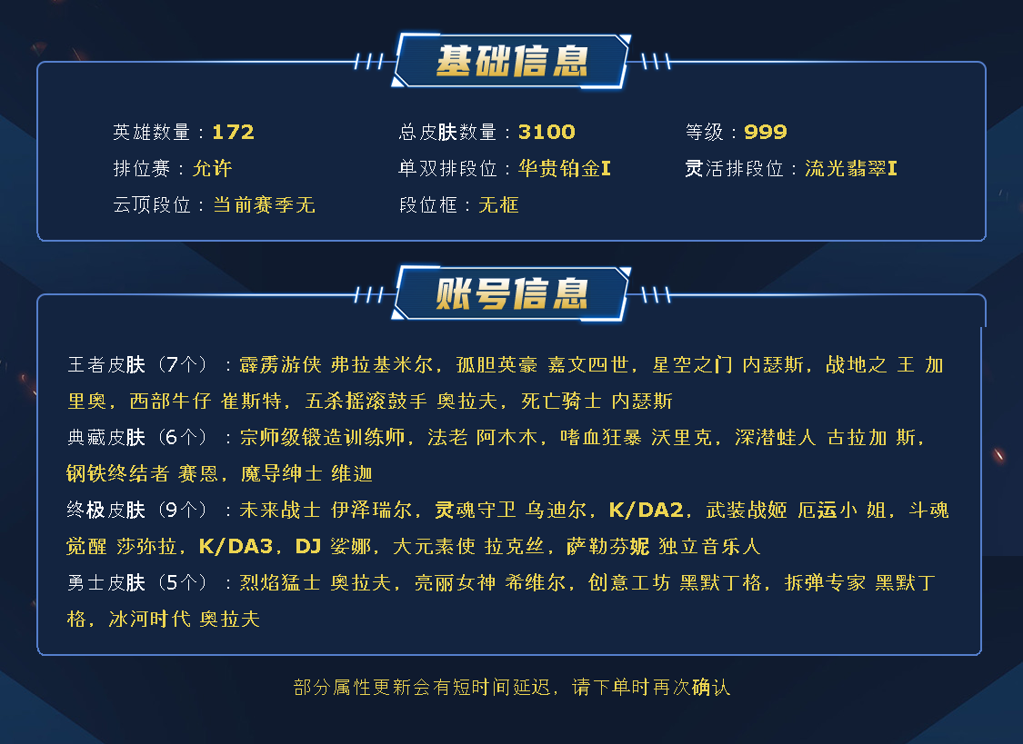 ~~喜欢记得收藏~~可排位~~3000皮全英雄丨1415原皮1520炫彩丨110神话/至臻/海克斯丨46臻彩丨IG套丨灵魂莲华套丨神龙尊者套丨斗魂觉醒套丨幻灵套丨星之守护者套丨EDG套丨DRX套丨FPX套丨KDA套丨青花瓷套丨北极星套丨花仙子套丨至高天套丨玉剑传说套丨女帝无双套丨太空律动套丨光明哨兵套丨破败军团套丨净雪之月套丨水晶玫瑰套丨幽梦玫瑰套丨龙瞎/龙的传人丨黑夜吸血鬼~~租之前尽量查一下游戏ID,确保段位是您需要的,避免浪费您的时间~~请勿挂机逃跑故意送人头,谢谢合作,谢谢~~