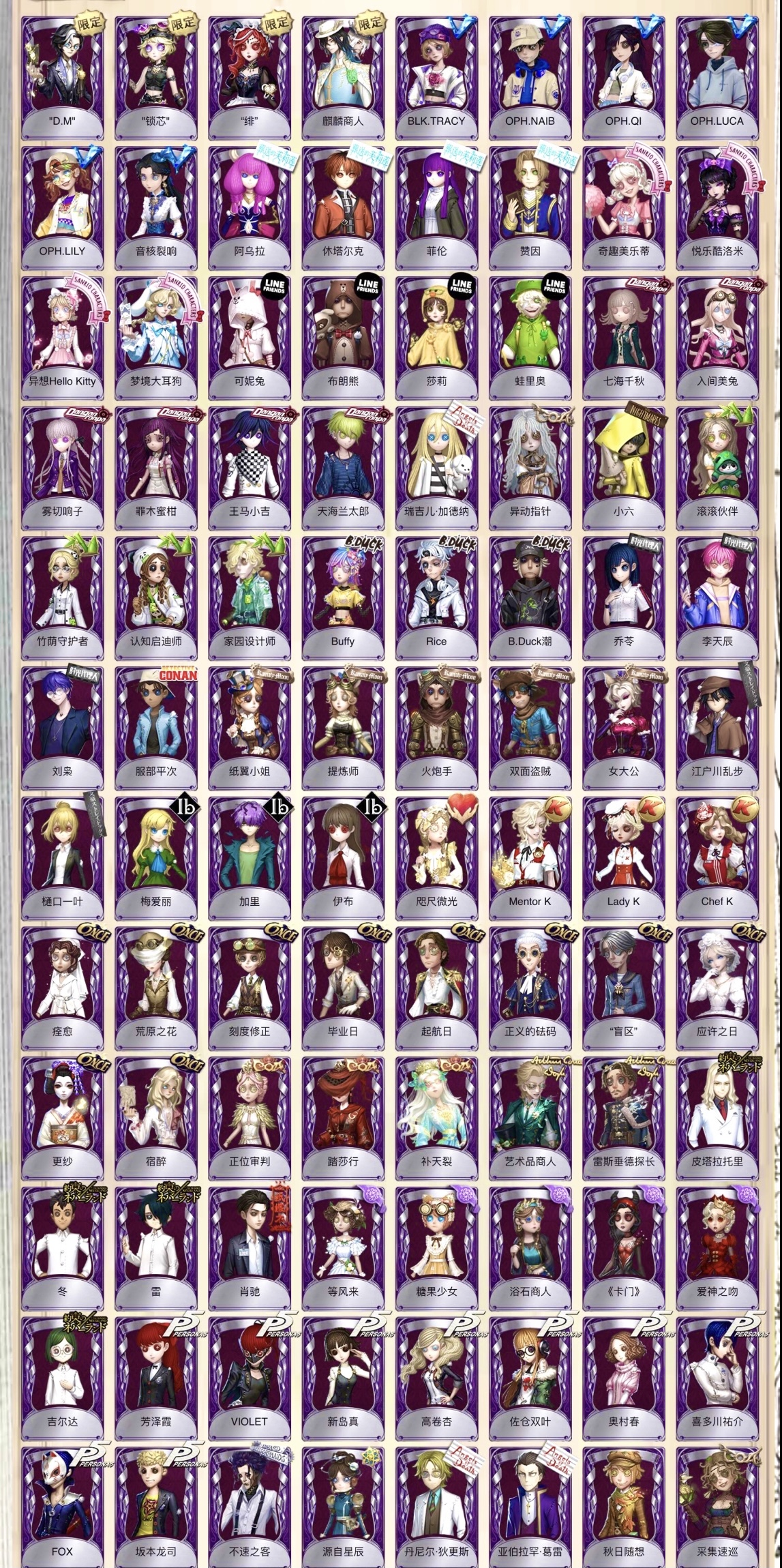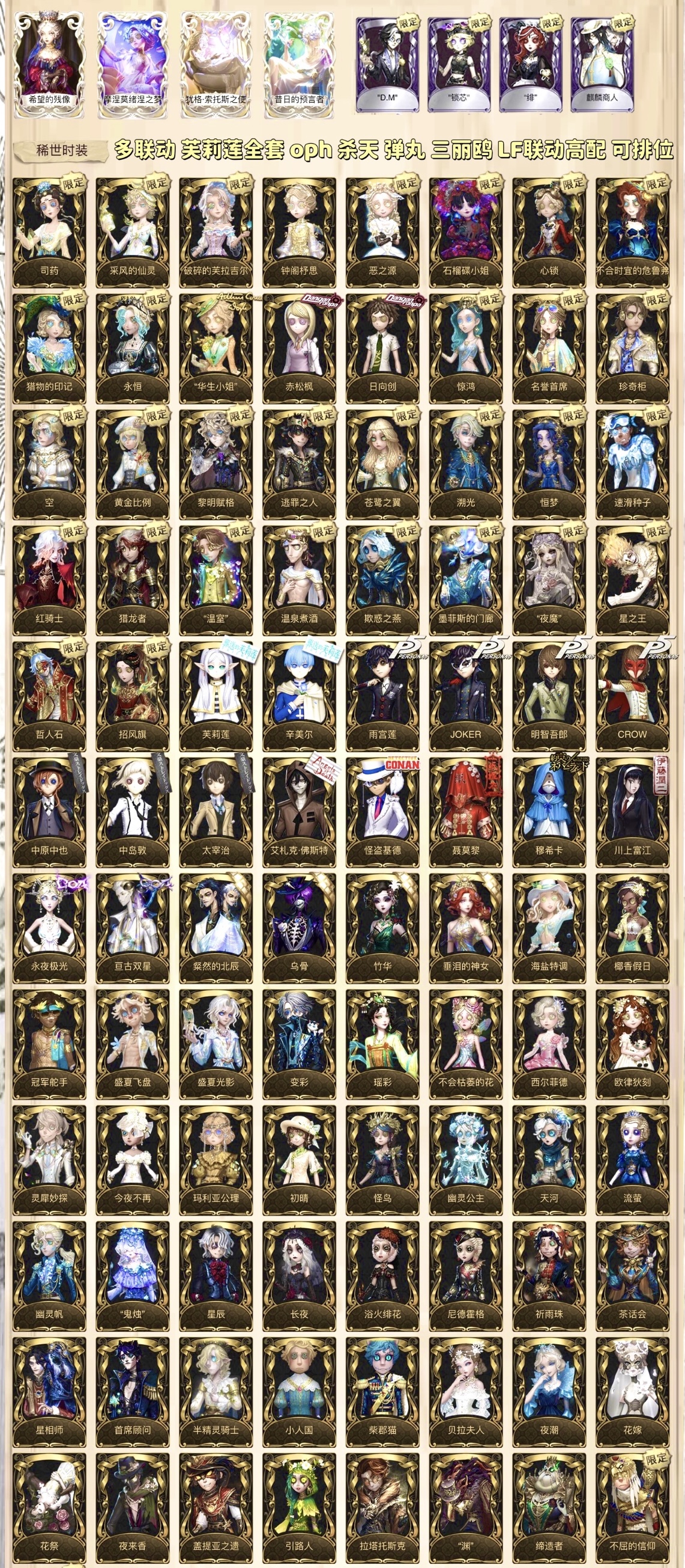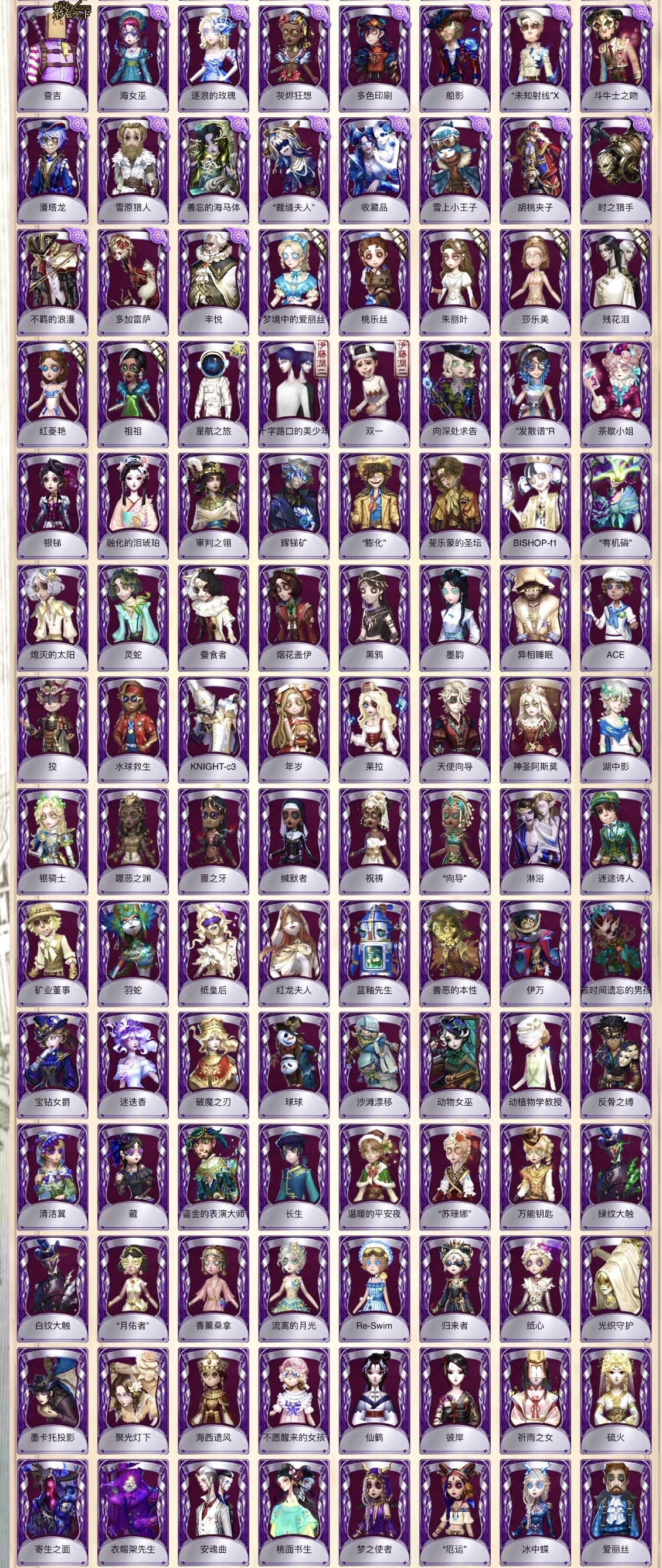 ❤️新增红蝶-胧夜 幻灯师-于此岸赴宴 勘探员-璀璨的孤狼 观唐联动-钟阁杼思 囚徒二限-黎明赋格 气象学者-芙莉莲 骑士-辛美尔 祭司-阿乌拉 心理学家-菲伦 病患-休塔尔克 玩具商-认知启迪师 医生-银锑 调酒二限-破碎的芙拉吉尔 LineFriend联动全皮 小女孩-石榴碟小姐 气象学家-茶歇小姐 拉拉队员-oph电竞套 心理学家金皮-恒梦 病患金皮-溯光 弓箭手金皮-不合时宜的危鲁弗 昆虫学者冠军紫皮-踏莎行