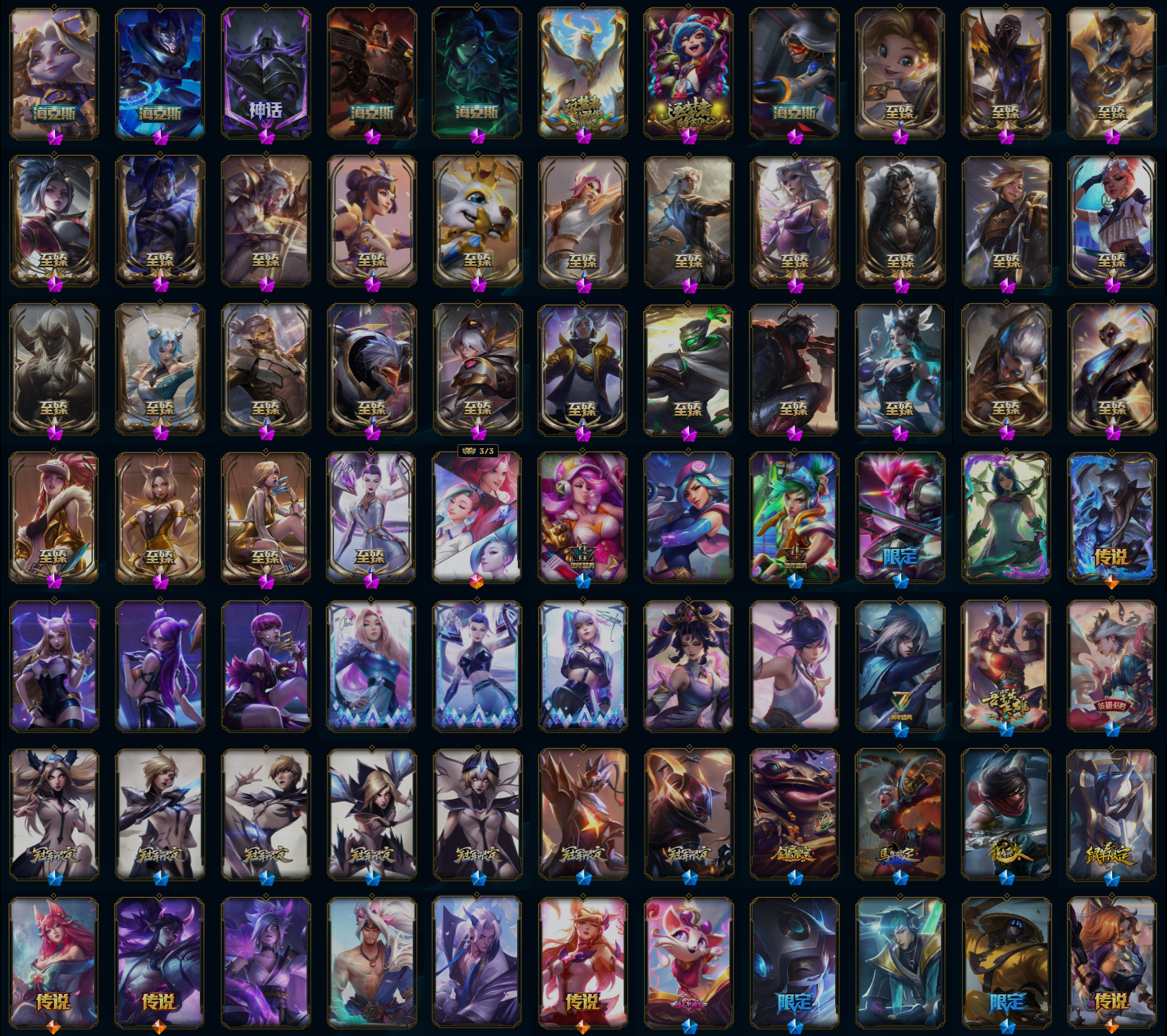 【重要皮肤】狼神英灵斯维因至臻 魔女阿卡丽至臻 玉剑传说琴仙子至臻 斗魂觉醒派克至臻 墨之影武者亚索至臻 花仙使者卡特琳娜至臻 星之守护者辛德拉至臻 西部魔影猎天使恶魔泰隆至臻 青花瓷拉克丝至臻 女帝黛安娜至臻 奥术师佐伊至臻 真实伤害亚索至臻 灵能特工伊泽瑞尔至臻 福牛守护者菲奥娜至臻 源计划逆流塞拉斯至臻 源计划阴劫至臻 神龙尊者炎龙瑟提至臻 黑夜使者凯隐至臻 征服者贾克斯至臻 飞升战神潘森至臻 KDA二代卡莎至臻 KDA阿狸至臻 KDA伊芙琳至臻 KDA阿卡丽至臻 KDA阿卡丽2022至臻 源计划正义艾瑞莉娅至臻 真实伤害奇亚娜至臻 绒毛菲兹至臻 腥红之月亚托克斯至臻 未来战士锤石至臻 未来战士锤石2022至臻 灰烬骑士莫德凯撒 海克斯科技嘉文四世 海克斯科技崔丝塔娜 永恒之森奥恩 恐惧新星德莱厄斯 摄魂使者薇恩 新创战纪希维尔 胜利之王泰达米尔 胜利巨口克格莫 创星之灵璐璐 电玩女神厄运小姐 电玩勇者锐雯 电玩女神阿狸 玉剑传说无影 玉剑传说舞龙卫 玉剑传说翼剑仙 银龙裁决泰隆 天龙之子斯莫德 替父从军花木兰 你看见过我的熊猫吗安妮 南天之怒沃里克 玉净夜叉凯特琳 紫金罗刹莫甘娜 张辽文远 司马懿仲达 烈焰美人薇恩 纳财大帝塔姆 王国机神苍狼瑟提 胜利女神瑟庄妮 胜利枪神卢锡安 觅心之翼奎因 觅心猫猫悠米 寒冬精灵璐璐 圣诞捣蛋鬼金克丝 持胡萝卜的雪人易 冰雪女神辛德拉 魄罗骑士瑟庄妮 平安夜女神娑娜 魅惑女巫厄运小姐 魅惑女巫莫甘娜 魅惑女巫伊莉丝 大魔王提莫 小恶魔菲兹 南瓜头王子阿木木 泳池派对辛德拉 泳池派对奥莉安娜 泳池派对嘉文四世 泳池派对塔里克 泳池派对菲奥娜 泳池派对李青 泳池派对雷克顿 电玩战魂赫卡里姆 克格汪 制胜金球拉莫斯 DWG凯南 FPX锤石 FPX薇恩 FPX李青 FPX普朗克 FPX墨菲特 iG卡蜜尔 iG洛 iG卡莎 iG艾瑞莉娅 iG乐芙兰 iG菲奥娜 SSG霞 SSG洛 SSG纳尔 SSG塔莉垭 SSG嘉文四世 SSG伊泽瑞尔 SKTT1扎克 SKTT1烬 SKTT1辛德拉 SKTT1娜美 SKTT1艾克 SKTT1奥拉夫 SKTT1阿利斯塔 SKTT1卡莉丝塔 SKTT1瑞兹 SKTT1阿兹尔 SKTT1伊莉丝 SKTT1雷克顿 SSW锤石 SSW雷恩加尔 SSW泰隆 SSW图奇 SSW辛吉德 SKTT1贾克斯 SKTT1劫 SKTT1婕拉 SKTT1李青 SKTT1薇恩 暗杀星奥莉安娜 暗杀星蒙多 暗杀星努努和威朗普 暗杀星伊泽瑞尔 暗杀星慎 Fnatic迦娜 Fnatic库奇 Fnatic古拉加斯 Fnatic嘉文四世 Fnatic卡尔萨斯 冰雪节辛吉德 防暴士兵辛吉德 冠军典狱长锤石 冠军掠夺者卡兹克 冠军蔷薇乐芙兰 冠军之矛卡莉丝塔 冠军之刃锐雯2016 冠军之血希瓦娜 冠军之隐劫 冠军之志瑞兹 鬼影重重魔腾 胡桃夹子萨科 警用试作体K9内瑟斯 南瓜头费德提克 圣诞精灵崔丝塔娜 圣诞开心鬼提莫 圣诞狂欢基兰 圣诞狂欢努努和威朗普 圣诞老人古拉加斯 圣诞玩偶波比 圣诞驯鹿克格莫 外星装甲库奇 卧虎藏龙贾克斯 喜庆之树茂凯 邪恶圣诞老人维迦 幸福女神乐芙兰 雪默丁格 英勇玩具兵普朗克 永恒之森乐芙兰 征服者卡尔玛 征服者韦鲁斯 冠军之箭艾希 阿木木主人不要我了 波比的巧克力工坊 地底世界崔斯特 十五周年纪念希维尔 十周年纪念安妮 源代码乐芙兰 神凰行者瑞羽圣凰艾尼维亚 胜利凤凰艾尼维亚 武装战姬厄运小姐 KDAALLOUT萨勒芬妮独立音乐人 KDAALLOUT萨勒芬妮明日新星 KDAALLOUT萨勒芬妮超级巨星 绝息圣堂洛