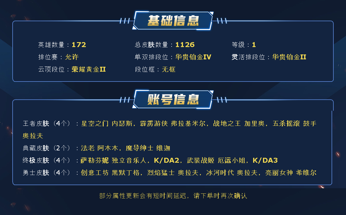 ~~喜欢记得收藏~~可排位~~1200皮全英雄丨681原皮209炫彩丨90神话/至臻/海克斯丨IG套丨灵魂莲华套丨FPX套丨KDA套丨替父从军丨银龙裁决丨鼠年瑟提丨星守狐狸丨觅心悠米丨卧虎藏龙丨幻灵女枪丨玉剑男刀剑姬丨心之刚厄斐琉斯丨神龙尊者李青艾希丨电玩女警女枪瑞文人马~~租之前尽量查一下游戏ID,确保段位是您需要的,避免浪费您的时间~~请勿挂机逃跑故意送人头,谢谢合作,谢谢~~