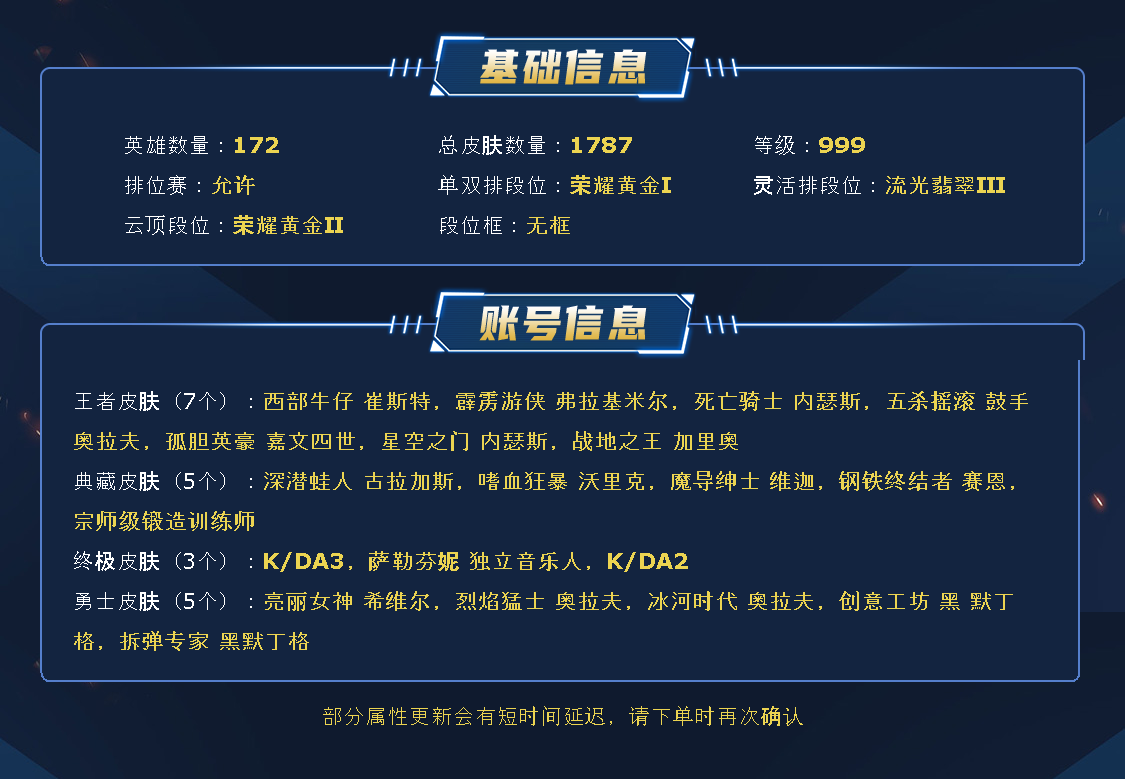~~喜欢记得收藏~~可排位~~1800皮全英雄丨100神话/至臻/海克斯丨龙瞎/龙的传人丨神龙尊者套丨灵魂莲华套丨星之守护者套丨KDA套丨至高天套丨斩星剑圣丨创星璐璐丨御星艾希丨替父从军丨勇敢的心丨泳池佐伊丨丨卧虎藏龙丨女帝卡特丨咖啡甜心格温丨IG卡莎卡密尔丨情人节琴女金克斯洛丨玉剑男刀女刀剑圣丨神凰行者萨勒芬妮霞丨鼠年武器瑟提德莱文丨电玩女枪卡莎瑞文人马~~租之前尽量查一下游戏ID,确保段位是您需要的,避免浪费您的时间~~请勿挂机逃跑故意送人头,谢谢合作,谢谢~~