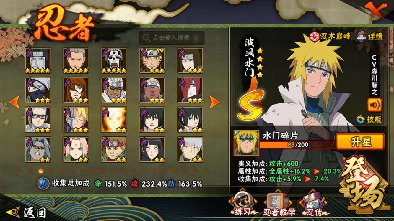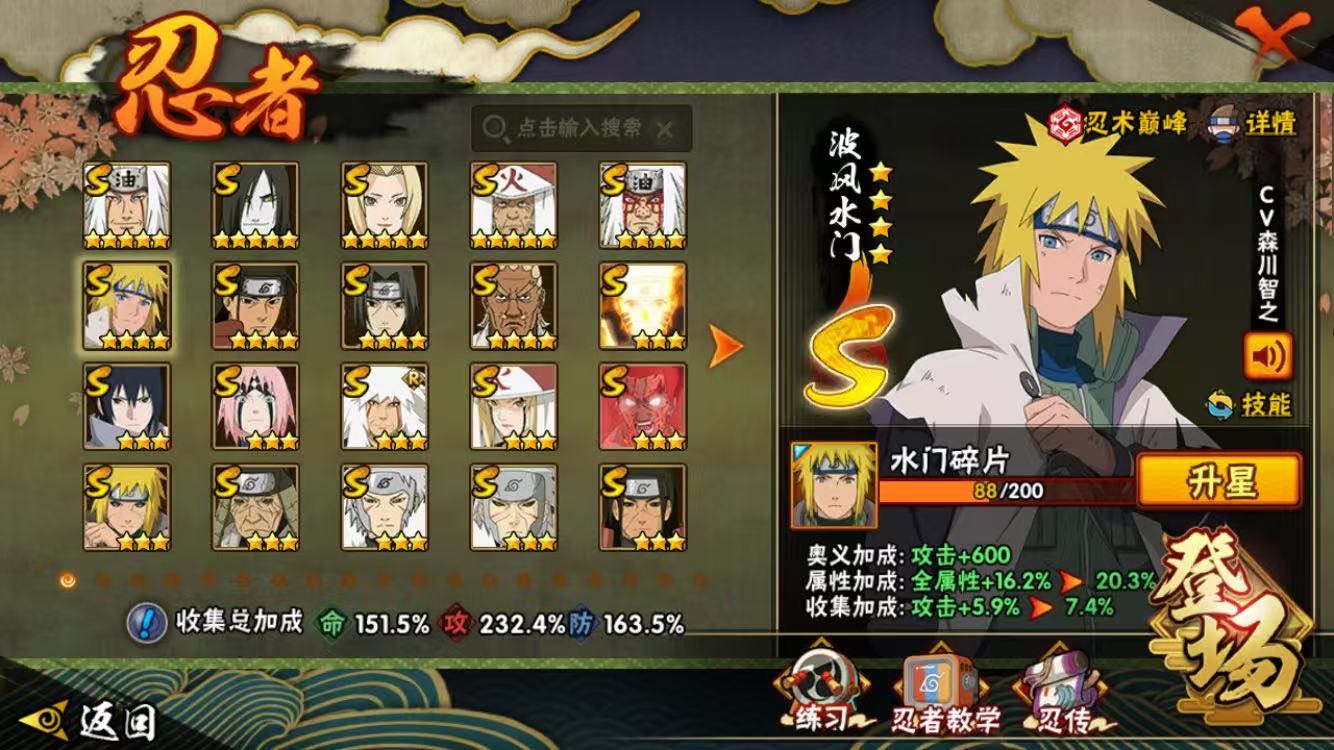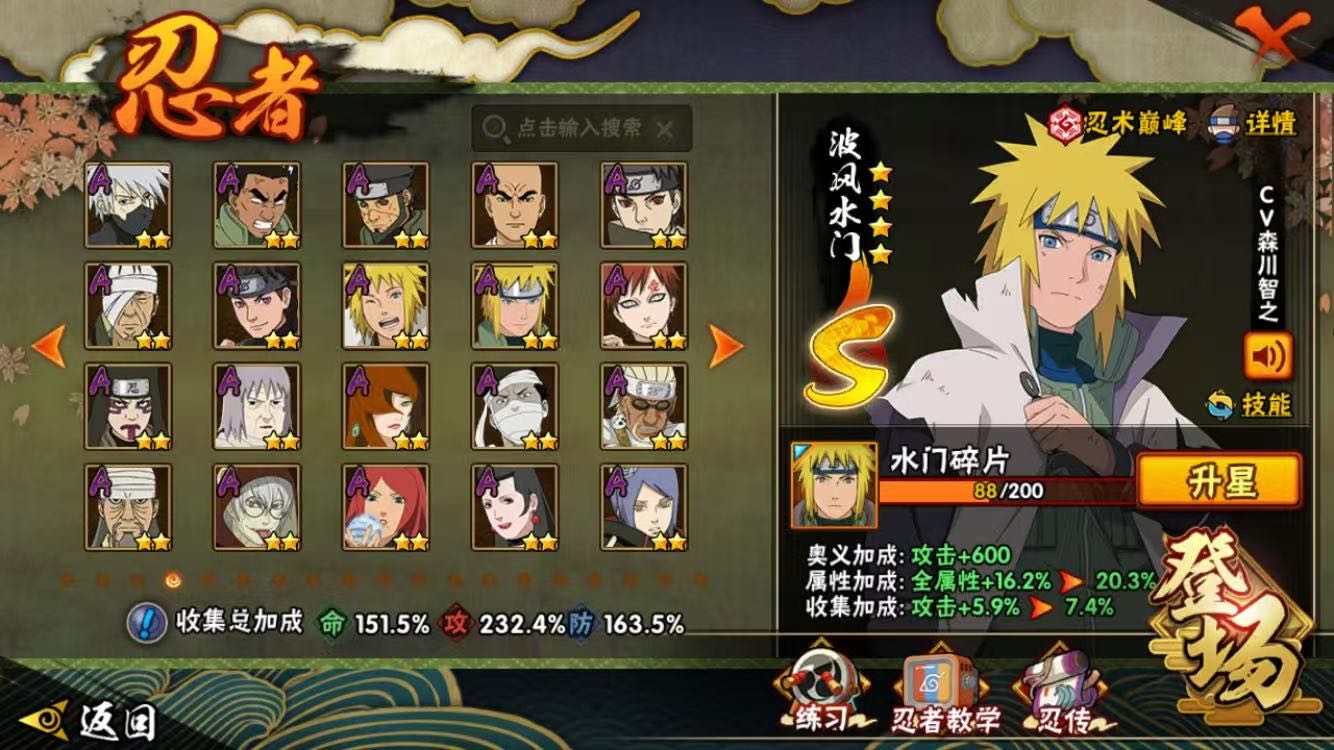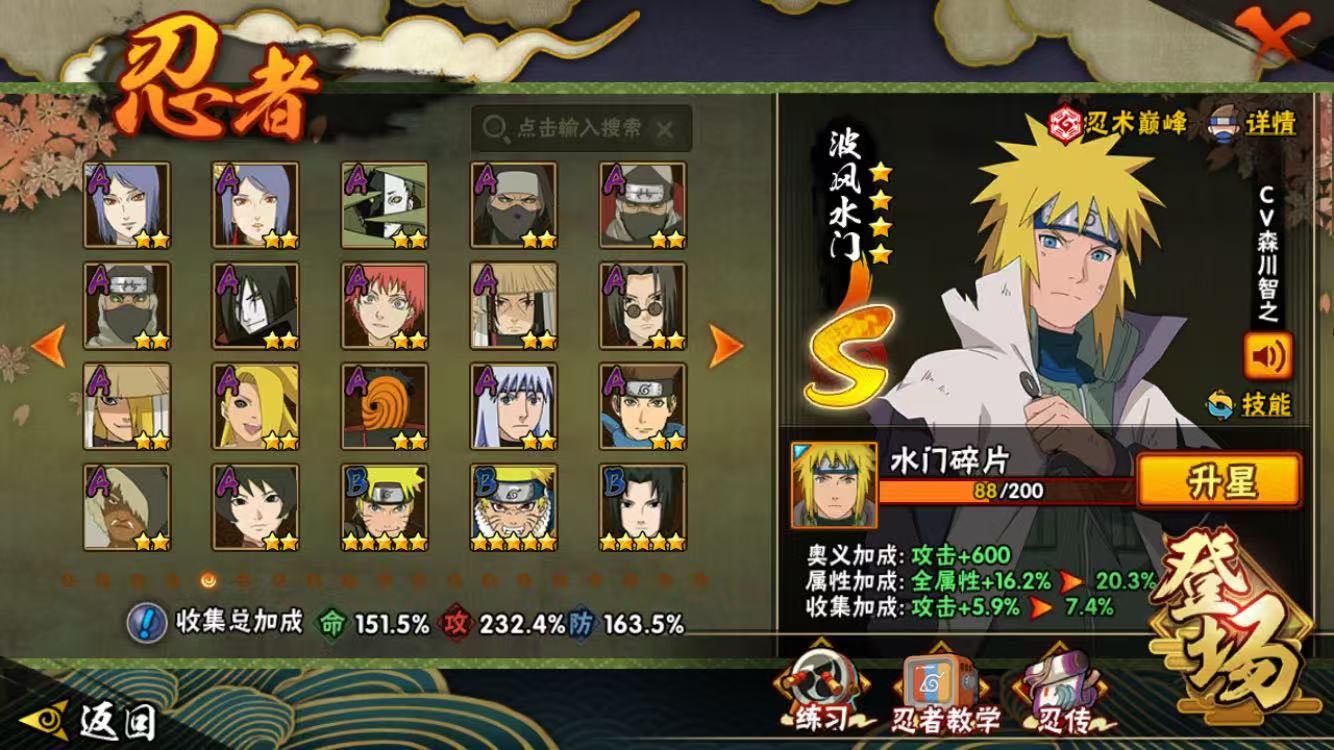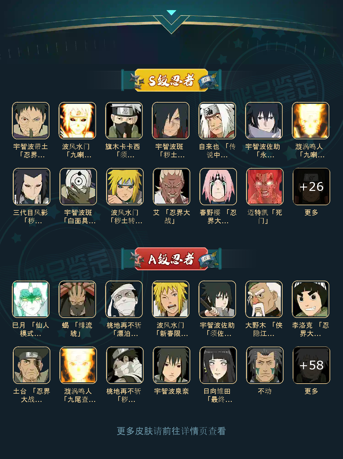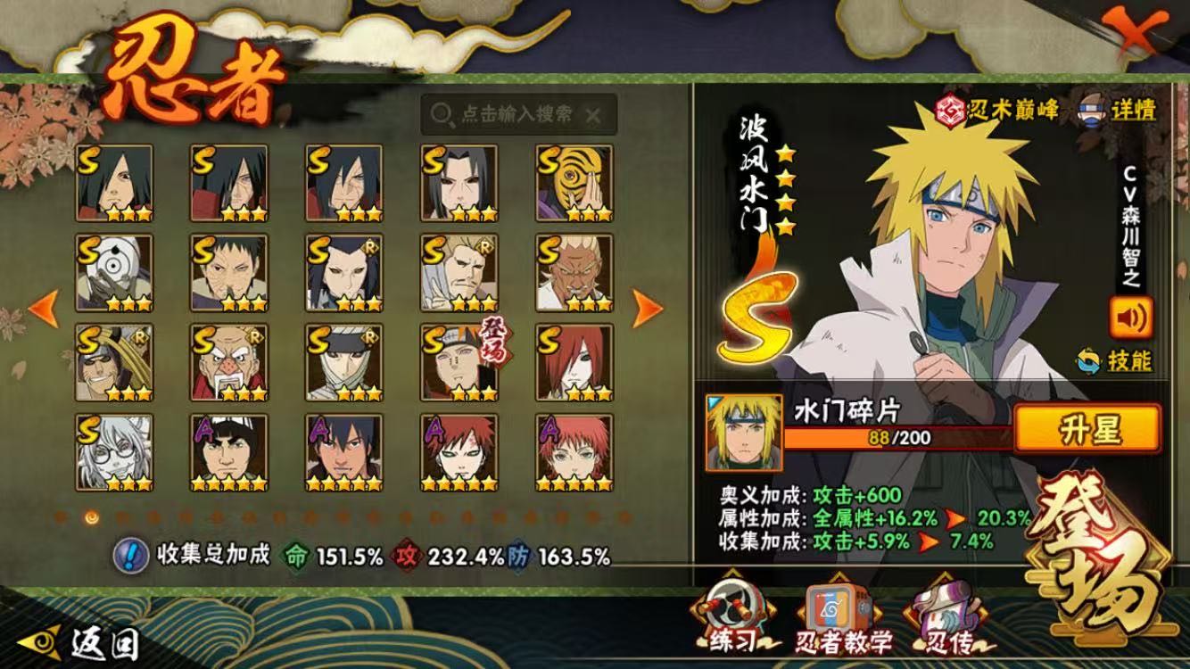 巳月「仙人模式」/旗木卡卡西 「须佐能乎」/自来也「传说中的三忍」/桃地再不斩「漂泊武士」/波风水门「新春限定」/宇智波斑 「秽土转生·解」/波风水门「秽土转生」/漩涡鸣人 「九喇嘛连结」/宇智波斑「白面具」/艾 「忍界大战」/宇智波带土「忍界大战」/三代目风影 「秽土转生」/宇智波佐助 「永恒万花筒」/桃地再不斩「秽土转生」/波风水门「九喇嘛连结」