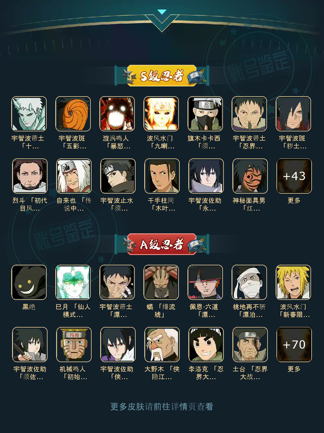 白面具 须佐卡卡西 小胡子鬼灯幻月 雷影 土影 无 佩恩 百战佩恩 青年柱间 创立初代 秽土斑 青年斑 解斑 须佐止水 虎皮 破面带土 红夜带土 罗砂 秽土三代风影 忍战雷影 三代雷影 金角银角 秽土半藏 忍战大野木 小土豆 天道超 大筒木桃式 大筒木金式 钢铁之躯凯 桀骜之刃阿斯玛 狂野之鲨鬼鲛 飞段 黑飞段 百豪樱 忍战李 大卡卡西 五代水影照美冥 宇智波鼬 仙鸣 九尾查克拉鸣人 樱佐 奇拉比 青年艾 半蛇兜 晓蛇 新春鼬 面麻 须佐佐助 疾风咒印佐助 忍战宁次 忍战天天 最终章雏田 幻容卡卡西 神卡 忍战卡卡西 泳装卡卡西 忍战凯 青春哥 惊门凯 爱情哥 新春止水 新春水门 青年水门 青水 侠隐兜 漂泊再不斩 漂泊佩恩 漂泊佩恩 三船 青年长门 泳装南 新春南 新春大蛇丸 晓创生角度 晓创生蝎 晓创生飞段 泳装鼬 鲛肌融合鬼鲛 秽土迪达拉 恶灵之影飞段 暴怒带土 忍战黄土 卑留呼 桃博 黑土