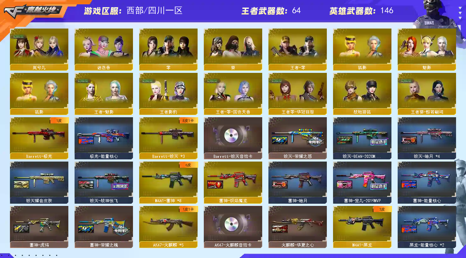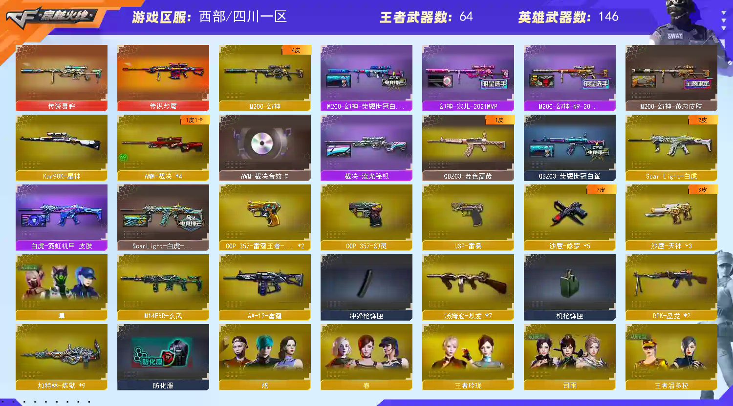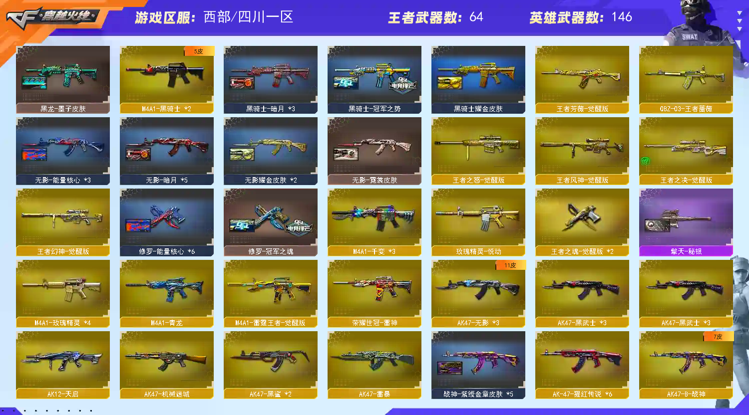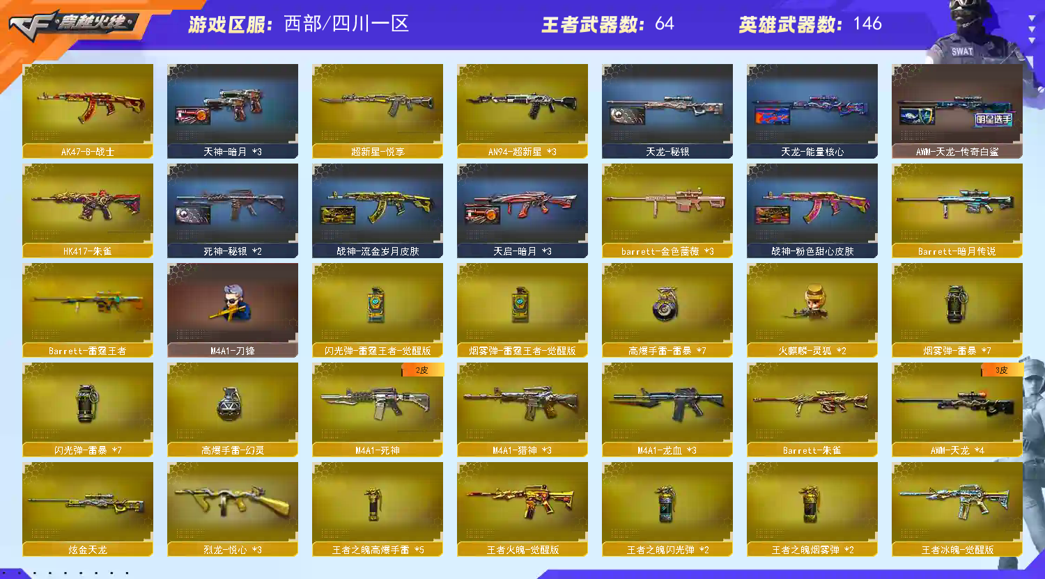 【其他重要武器】炫金千变/炫金雷神/炫金火麒麟/炫金无影/炫金武士/炫金骑士/炫金黑龙/炫金毁灭(2)/炫金天龙/黑武士-能量核心(3)/火麒麟-能量核心(3)/火麒麟-暗月(4)/激光毁灭者III/联想锋行黄金AK/M14EBR-赤血龙魂/HK417-赤血龙魂/M4A1-樱落/M4A1-紫狱/M4A1-S-十周年员/红龙AK47/黄金AK-47/AK47-B-十周年/M4CQBR-AP-孔明/神罚/M200-赤血龙魂(3)/AWM-银月/M82A1-水枪/破天九龙/AWM-Red/M82A1-夏日/黄金AWM/Barrett-麟龙/M200 CheyTac-大圣/巨龙咆哮Ⅲ(2)/MK5-枪王排位/EVO III-赤血龙魂/斯泰尔-CFS2017纪念版/神圣爆裂者/SPAS-12-雷电核心/AA-12-圣龙/Spas-12-黑金/柯尔特双枪-2017万圣节/Anaconda-雷电核心(2)/沙鹰-枪王排位/COP 357-平天大圣/Anaconda-炽焰核心/迷彩沙鹰-70KG/沙鹰-雷蛇/COP 357-青龙/毛瑟-庆典-CFS 2021/新USP-枪王排位奖励/丛林匕首-枪王排位(2)/匕首-幻能朋克/Laser Sword-夏日/丛林匕首-卧龙/无畏之矛/胜利奖杯手雷-枪王排位/红色诅咒娃娃手雷