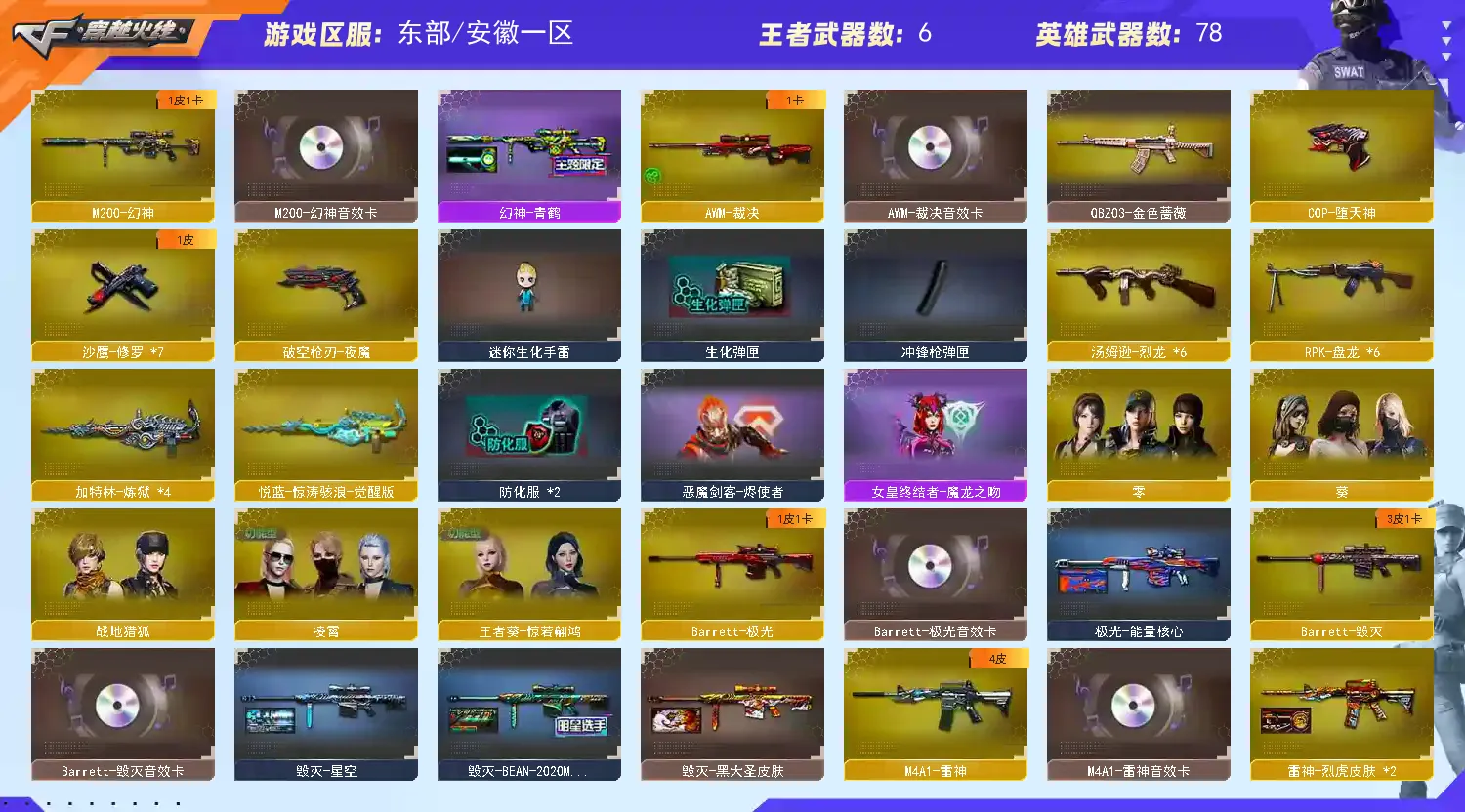 86V 4王者 4防 王者葵惊若翩鸿 M200幻神+青鹤皮肤+音效卡 6盘龙+6烈狱 6烈龙 QBZ金色蔷薇 王者之戮 王者风势 巴雷特毁灭 AWM裁决 COP357堕天神 破空枪刃夜魔 皮肤 幻神青鹤皮肤 火麒麟传奇EVEN皮肤 毁灭BEAN2020MVP皮肤 极光能量核心皮肤 火麒麟CFSTAR 音效卡 裁决音效卡 极光音效卡 好了音效卡 回收音效卡 雷神音效卡 毁灭音效卡