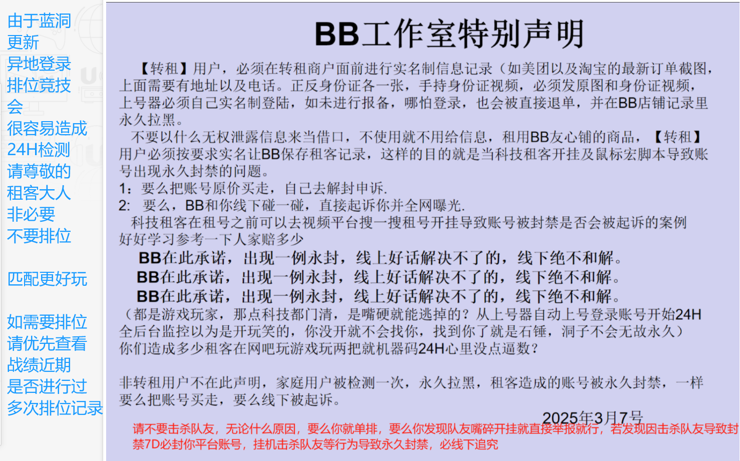 机器码问题:家庭用户上线前,请前往抖音、淘宝花费少量金额解除机器码后再进入游戏。电脑一旦被机器码锁定,无论登录多少账号都会在 24 小时内受限。号主会 24 小时后台监控记录,若您首次出现此类问题,BB也会全程记录信息进行资料存档进行分析;您账户第二次使用BB商品时将被重点关注;若出现第三次,会对您永久拉黑,即使您通过其他渠道租赁 BB 商品,也会在后台直接维权让您退出游戏,请大家务必绿色游戏。