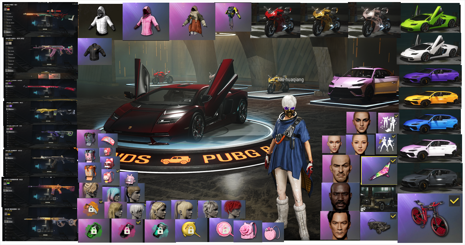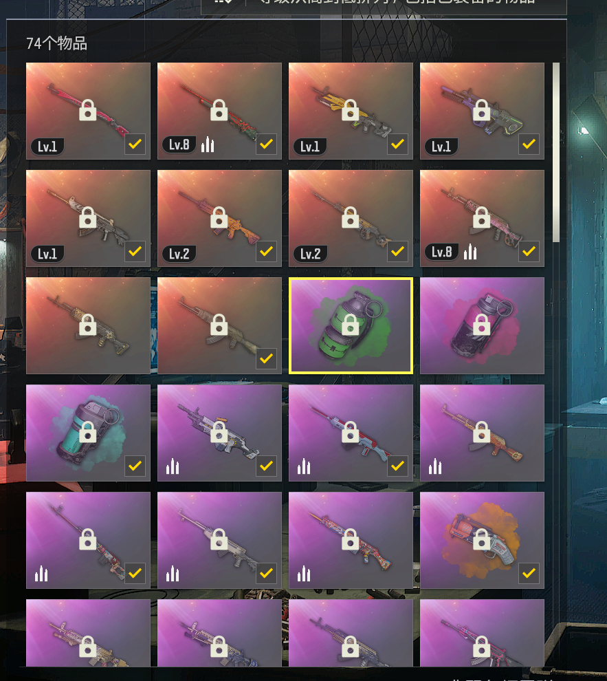 近双10级武器-----8级火麒麟,8级孙悟空,3级异色AWM,3级南瓜,2级锯齿收割者SLR,2级AUG。1级烈日1897,2级恶魔猎手ACE,1级午夜98K,橙色烟枪,翡翠品红青色三色烟雾弹,新增1级妖魔ACE