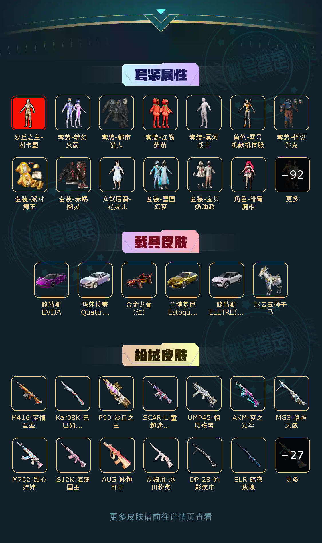 100粉,6载具,40特效枪,386套装,14王牌印记 SCAR-L-梦幻火箭/SCAR-L-童趣迷兔/SKS-碧影闪光/M416-风花雪月/AUG-星之彼岸/M762-甜心娃娃/Vector-红伞翩翩/GROZA-香水柠檬/AWM-橘柚倾心/M416-心之恋语/平底锅-林间仙鹿/M24-暗星紫秘/DP-28-幻梦音符/Mini14-绚金瑰梦/MG3-洛神天依/SCAR-L-青春物语/SLR-暗夜玫瑰/S12K-海渊国主/UMP45-相思残雪/UMP45-恐龙拽拽/M249-蓝莓炮弹/野牛-流星咚咚/AKM-梦之光华/Kar98K-绿意幻情/兰博基尼Estoque(炫光金)/路特斯ELETRE(花绽灰)/合金龙骨(红)