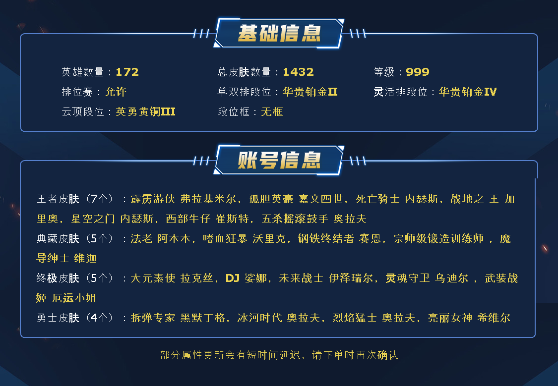 ~~喜欢记得收藏~~可排位~~1185皮全英雄丨860原皮325炫彩~~租之前尽量查一下游戏ID,确保段位是您需要的,避免浪费您的时间~~请勿挂机逃跑故意送人头,谢谢合作,谢谢~~