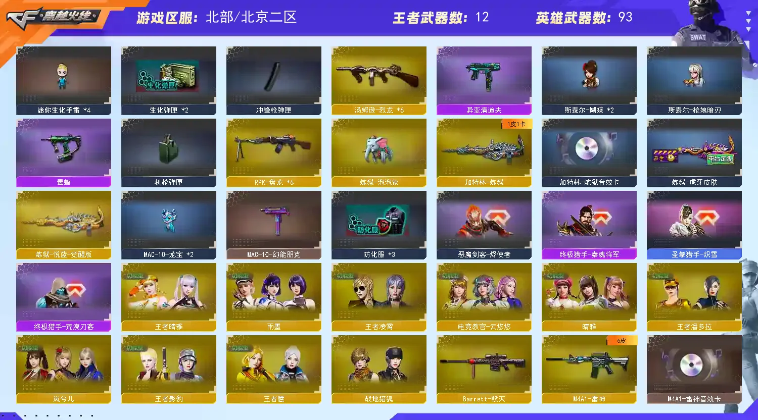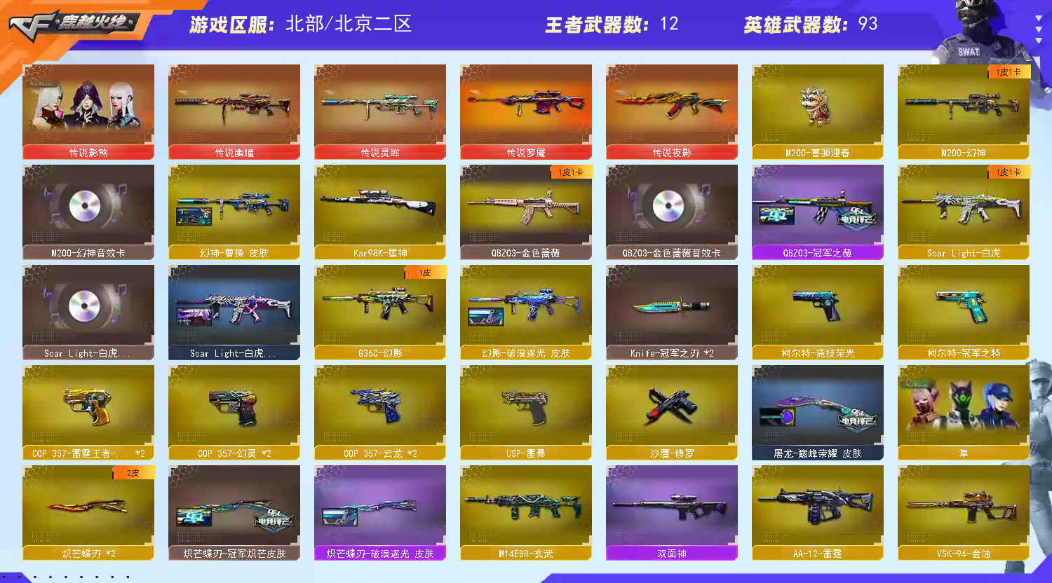 【主武器】M200-喜狮迎春/M200-幻神/王者幻神觉醒/②幻神竞技荣光/王者风神觉醒/M4A1-小神龙/②炼狱泡泡象/98K星神/传说幽瞳/传说灵眸/传说夜影/传说梦魇/白虎/G36c幻影/玄武/朱雀/火麒麟/雷神/超新星/无影/金色枪王-古蛇迷踪/蔷薇qbz/烈火动感闪耀/王者蔷薇qbz觉醒/王者之武觉醒/毁灭/VSK-94-金蚀/炼狱/炼狱悦蓝觉醒/⑥烈龙⑥盘龙/aa12雷霆/HK417朱雀蛇隐宗/白虎-枪娘安妮/毁灭孙三炮/炼狱枪娘擎电/双面神/毒蜂/异变清道夫/HK21-领域立场/KAC狂怒咆哮/MK5-炽火炎龙/神圣爆裂者3/②斯太尔蝴蝶/斯太尔枪娘暗刃/死亡之眼庆典CFS2021/EVO赤血龙魂/