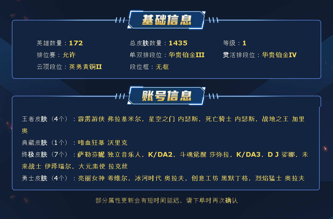 ~~喜欢记得收藏~~可排位~~1267皮全英雄丨828原皮439炫彩~~租之前尽量查一下游戏ID,确保段位是您需要的,避免浪费您的时间~~请勿挂机逃跑故意送人头,谢谢合作,谢谢~~