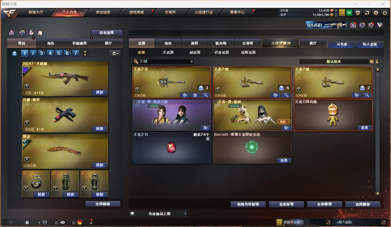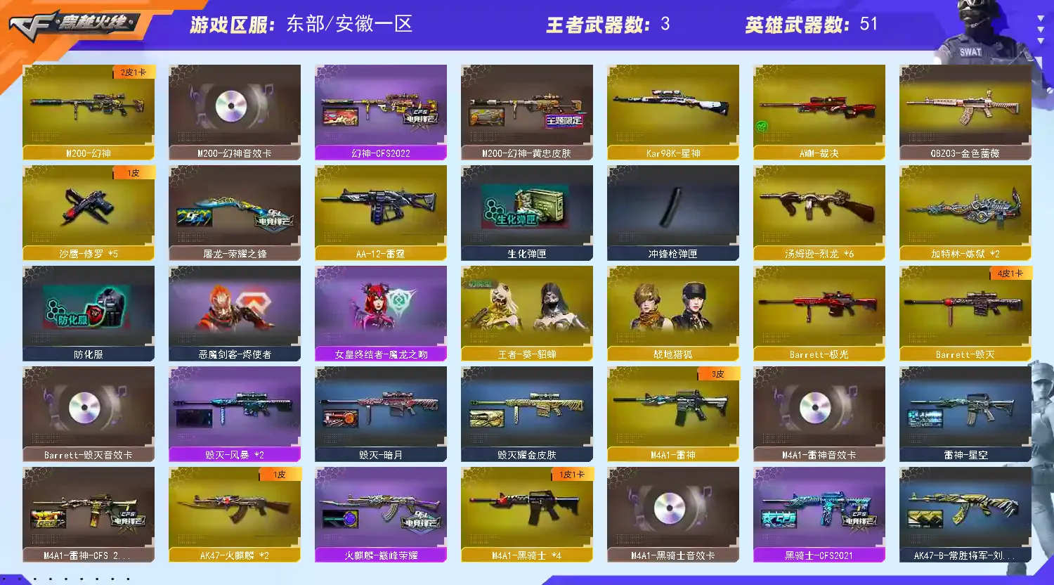 Lv.102 荣耀元帅,0传说/9王者/0炫金/51英雄/CF点1548/【重要角色3】王者零传说之路/铁骑荣耀/角色-职业经理【王者武器8】王者之心-觉醒版/QBZ-03-王者蔷薇-觉醒版/王者之魄高爆手雷*3/王者之魄烟雾弹/王者之魄闪光弹*2【热门武器21】M200-幻神/荣耀世冠-火麒麟/荣耀世冠-雷神/6烈龙/6盘龙/5修罗/炼狱【英雄武器51】无影-神兵利器/AK47-火麒麟/QBZ03-金色蔷薇/AK47-B-战神/AK-47-猩红传说/AK47-B-常胜将军/AK47-B-战士/AK47-B-身先士卒/M4A1-雷神/荣耀世冠-雷神/荣耀世冠-火麒麟/黑骑士-海王*2/M4A1-黑骑士/Barrett-极光/M200-幻神/Barrett-暗月传说/Barrett-毁灭/烈龙-云海游龙/汤姆逊-烈龙*6/RPK-盘龙*6/加特林-炼狱/擎天-云海游龙/龙啸-烈火龙威/幻灵之锋/麒麟刺/龙啸/擎天/屠龙*2/手雷-云海游龙/高爆手雷-幻灵*4/烟雾弹-幻灵/沙鹰-修罗*5【热门皮肤16】M200-幻神-黄忠/幻神-AG-CFPLS17冠军/M4A1-雷神-CFS 2019/毁灭-冠军之怒/白虎-AG-CFPLS20冠军/天龙-CFSTAR*2/火麒麟-CFSTAR*3/修罗-CFSTAR*2/火麒麟-百城/火麒麟-平天大圣/火麒麟-心动糖果/炼狱-星空【人偶武器4】灵狐娃娃手雷/闪光弹-貂蝉/高爆手雷-大乔/AWM-灵狐-15周年嘉年华【暴走生化武器12】汤姆逊-烈龙*6/RPK-盘龙*6【挑战武器3】M4A1-黑骑士/机甲撕裂者III/神圣爆裂者-末日III【音效卡武器3】M4A1-黑骑士音效卡/M200-幻神音效卡/Barrett-毁灭音效卡【普通皮肤6】AK-47-雷神/AK47-B-常胜将军-刘备/AK47-B-常胜将军-曹操*2/AK47-B-常胜将军-孙权/极光-能量核心【光效3】巴雷特-毁灭蓝色光效/加特林-炼狱蓝色光效/AWM-天龙蓝色光效【玩偶9】枪娘阿敏玩偶/15周年玩偶/小兔姬玩偶/大乔玩偶/三国-吴国玩偶/三国-魏国玩偶/大乔玩偶/关羽玩偶/灵狐潜伏者玩偶【戒指武器12】25赛季纪念戒指-耀银(拇指)/25赛季纪念戒指-耀银(食指)/15周年限定戒指/24赛季纪念戒指-耀银(拇指)/24赛季纪念戒指-耀铜(食指)/23赛季纪念戒指-耀银(拇指)/22赛季纪念戒指-耀银(拇指)/22赛季纪念戒指-耀铜(食指)/21赛季纪念戒指-耀银(拇指)/21赛季纪念戒指-耀铜(食指)/20赛季纪念戒指-耀金/龙眼(鹰)