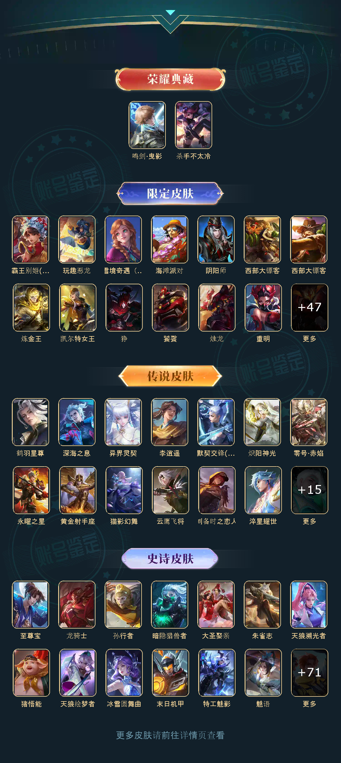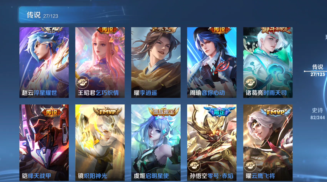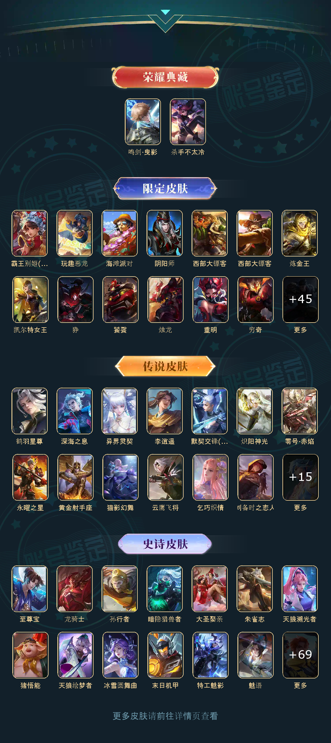 贵族等级V8,英雄数量123,典藏皮肤数2,皮肤数量311,杀手不太冷/鸣剑·曳影/异界灵契