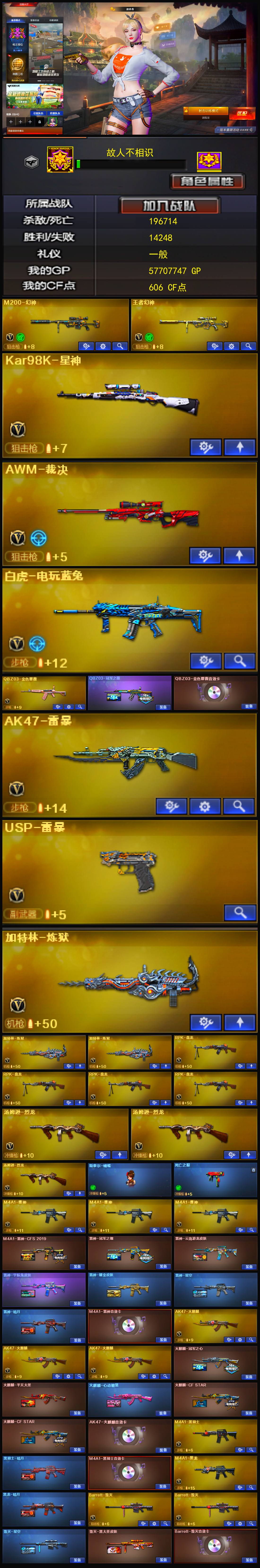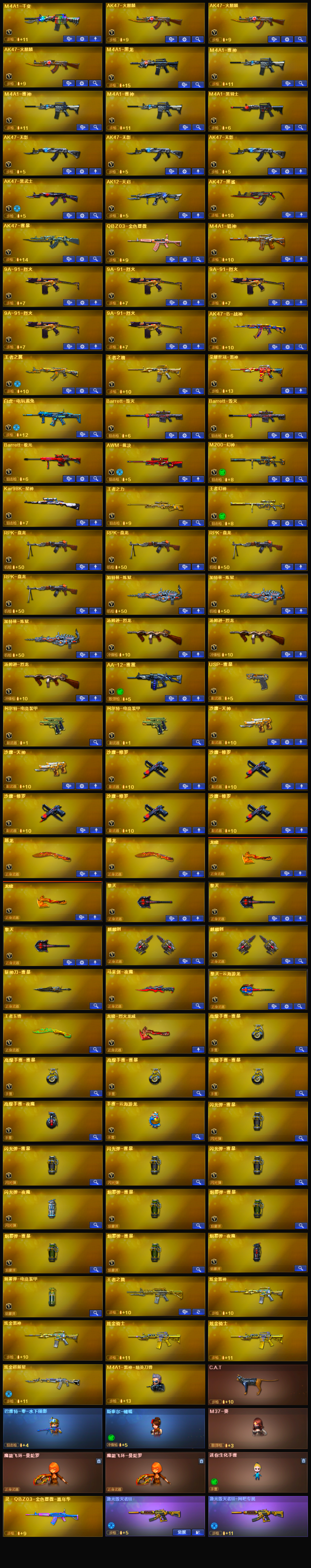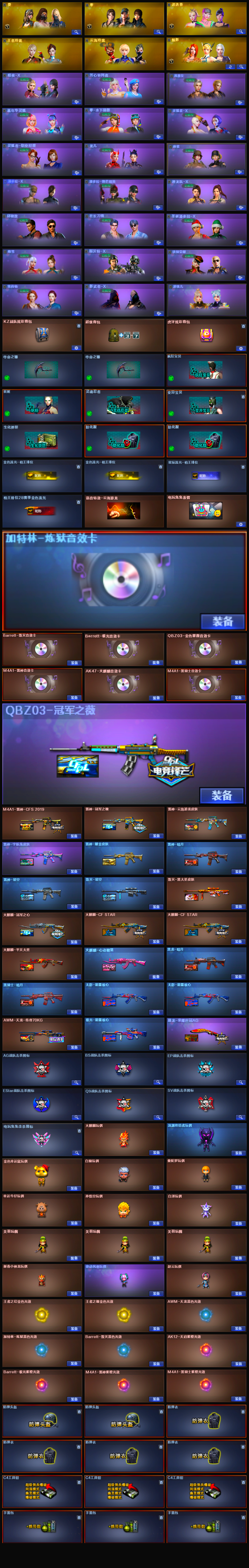 【王者幻神】 【m200幻神】 【98k星神】 【qbz金色蔷薇+音效卡+冠军之薇】 【小人呛 雷神刀锋 火麒麟灵狐】 【荣耀世冠雷神】 【火麒麟+音效卡+冠军之心】 【黑龙】 【雷神+音效卡+冠军之魄】 【黑骑士+音效卡】 【毁灭+音效卡】 【极光+音效卡】 【裁决】 【盘龙*4 炼狱+音效卡 烈龙】 【王者之力】 【千变 无影 黑武士 天启 黑鲨 猎神 烈火 猩红传说 战神】 【修罗 天神 屠龙 龙啸 擎天 麒麟刺】 【四防角色 职业经理】 【角色 葵 零 迷迭香 王者玲珑 云海玲珑 魅影】 【炫彩背包 云海游龙炫彩背包 kz炫彩背包 虎牙炫彩背包】