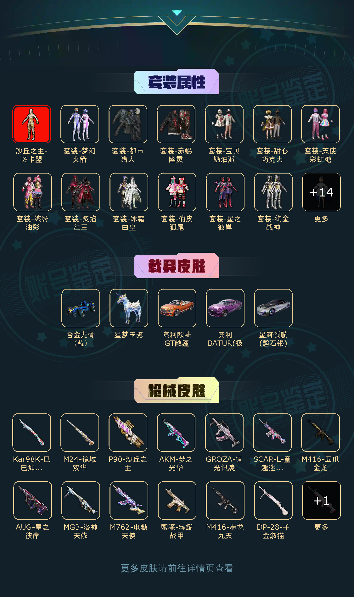 【粉色枪皮】M416-五爪金龙/AKM-梦之光华/SCAR-L-锦绣绵绵/SCAR-L-童趣迷兔/M416-墨龙九天/GROZA-镜光银凌/AUG-星之彼岸/M762-电糖天使/蜜獾-辉耀战甲/Kar98K-巳巳如意/M24-镜域双华/P90-沙丘之主/DP-28-千金淑猫/MG3-洛神天依