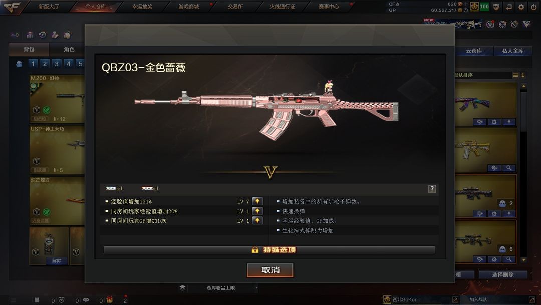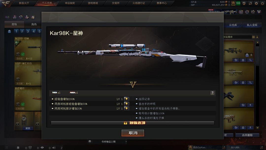 本游戏账号:英雄武器63个; 王者武器9个。 装备不多,但是主武器、副武器、近身武器够用 拥有完美游戏体验。重要的是,特殊装备有:烟雾弹-神工天巧、黑骑士-海王、闪光弹-神工天巧、高爆手雷-神工天巧、唐刀-神工天巧、USP-神工天巧、麒麟刺、AN94-超新星、QBZ03-金色蔷薇、AK47-火麒麟、M4A1-雷神、Kar98K-星神、Barrett-毁灭、加特林-炼狱、M200-幻神、M4A1-神工天巧、M4A1-黑骑士、烟雾弹-竞技荣光、高爆手雷-竞技荣光、闪光弹-竞技荣光、王者之魄闪光弹、王者玉锋、王者之势-觉醒版、王者之魄高爆手雷、王者之怒-觉醒版、炫金雷神、迷迭香、圣诞潘多拉-X、堕天使、M4A1-雷神音效卡、Barrett-极光音效卡、M200-幻神音效卡、M4A1-黑骑士音效卡、等,随意畅选。