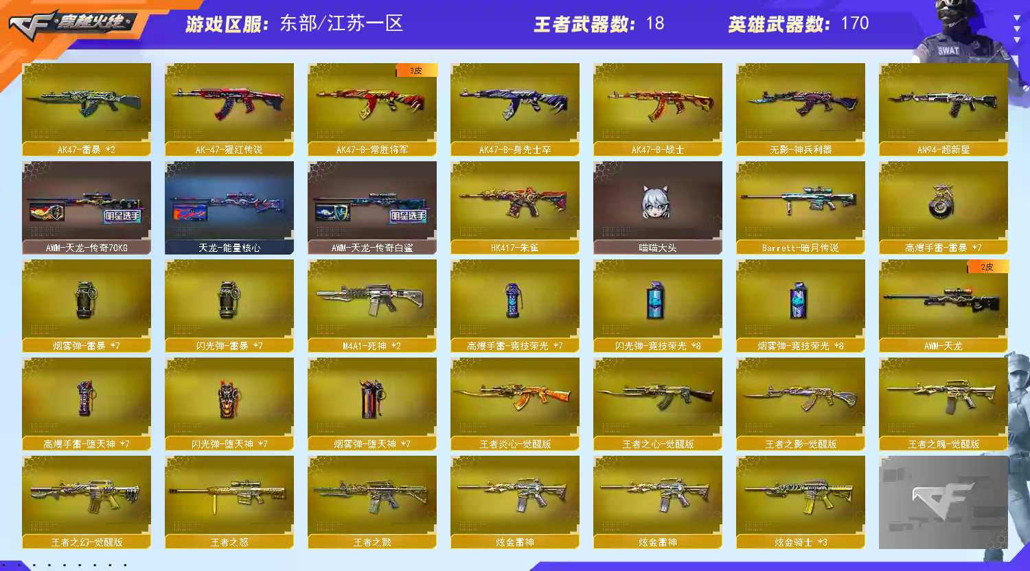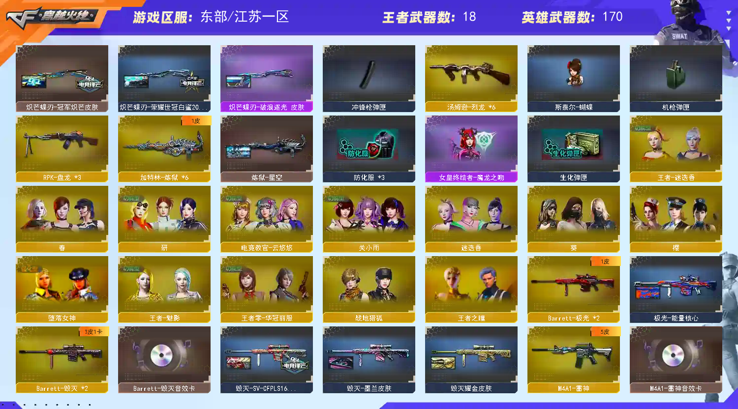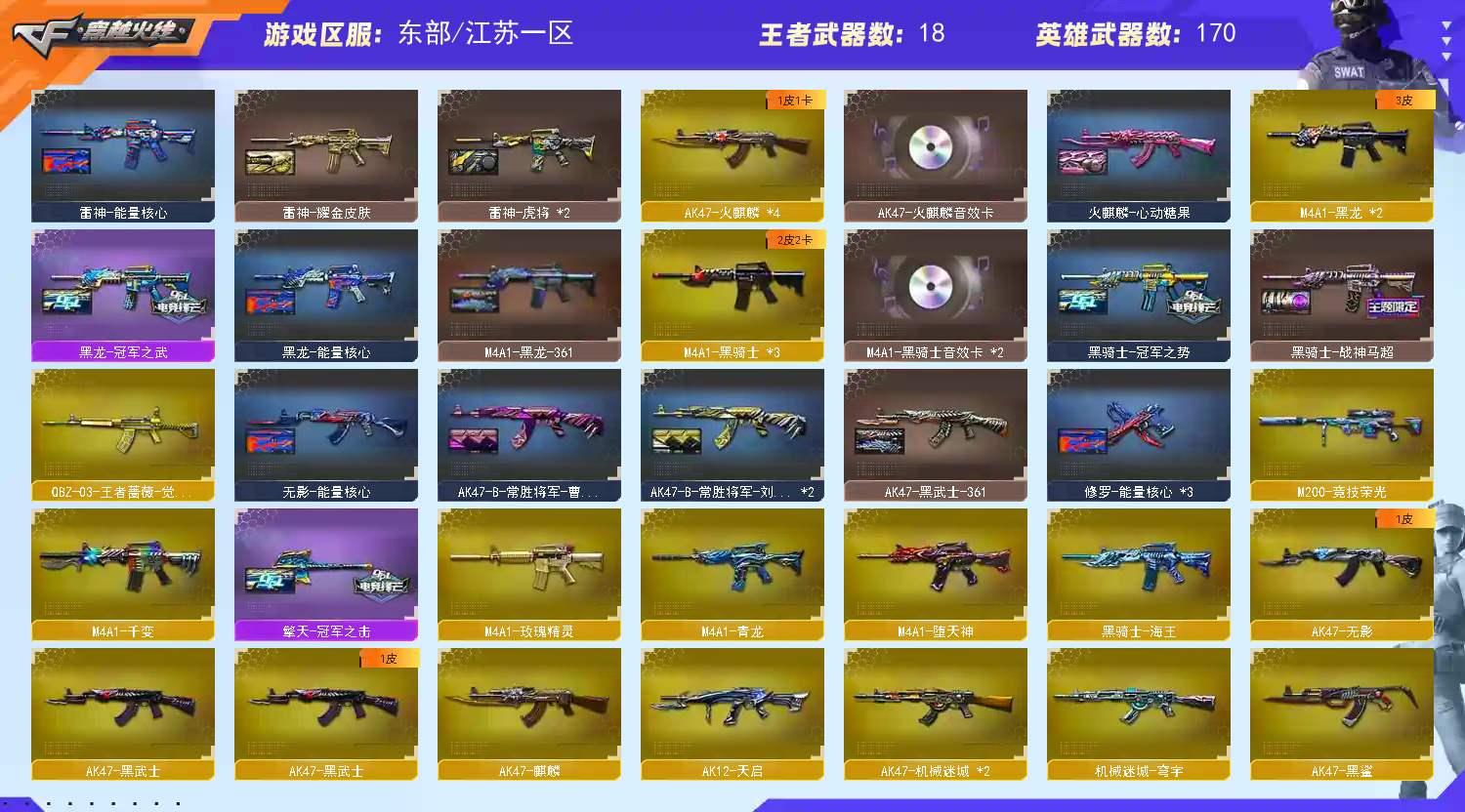 多四防角色,各种皮肤武器光效玩偶道具,欢迎来体验!武器太多,截不了那么多图!【此号全部装备太多截不了太多图,还有很多神器未截图,普通CF点武器也是一百多个就不截图了(满背包满道具爆破、生化、挑战武器应有尽有多个玩偶主流武器多光效),主流枪械都有皮肤】