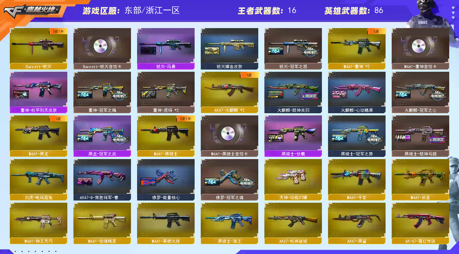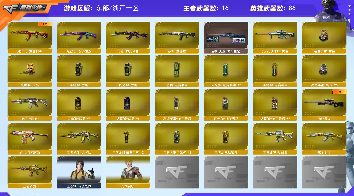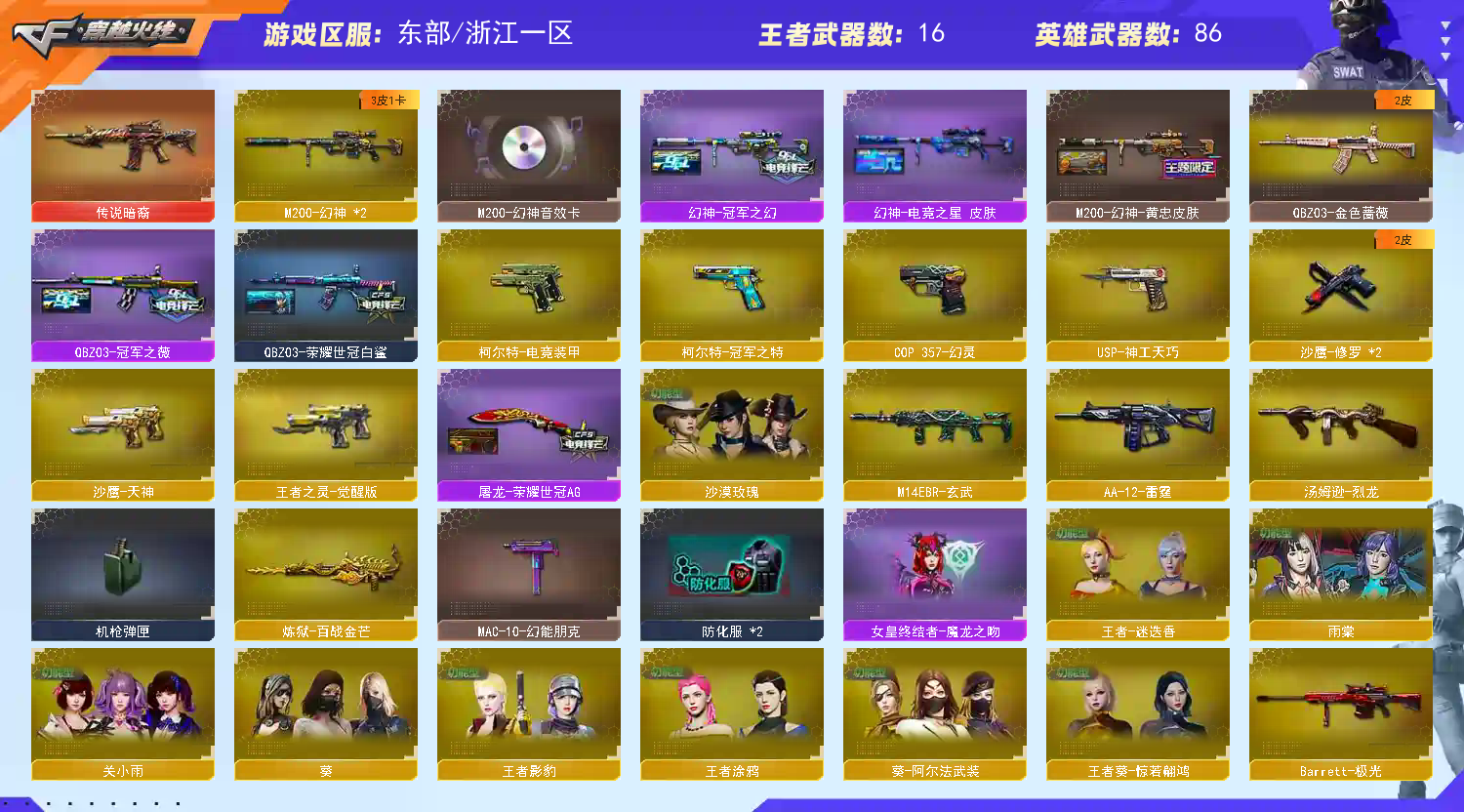 【m200幻神*2+音效卡+冠军之幻+黄忠+冠军之特+冠军之刃*2】【传说暗裔】【qbz金色蔷薇+冠军之薇+荣耀世冠白鲨】【玄武】【神工天巧套】【火麒麟+冠军之心】【黑龙+冠军之武】【雷神+卡+冠军之魄】【黑骑士+卡+冠军之势】【毁灭+卡+冠军之怒】【极光】 【武器:武圣 神工天巧 海王 王者冰魄 王者青龙 王者龙血 白虎电玩蓝兔 天龙 烈龙】 【10手呛:修罗*2 沙鹰天神 武圣 柯尔特电竞装甲 cop幻灵 usp神工天巧 天神动感闪耀 王者之灵 冠军之特】 【12刀具:屠龙*3 麒麟刺*3 斩神刀雷暴 幻灵之峰 神工天巧 王者之刺 王者云击】 【7雷套: 幻灵雷*5 雷暴雷 电竞装甲雷】 【小人呛:火麒麟灵狐 雷神呛娘雷安娜】 【音效卡:幻神音效卡 雷神音效卡 黑骑士音效卡 毁灭音效卡 】 【四防角色:王者葵惊若翩鸿 王者影豹】
