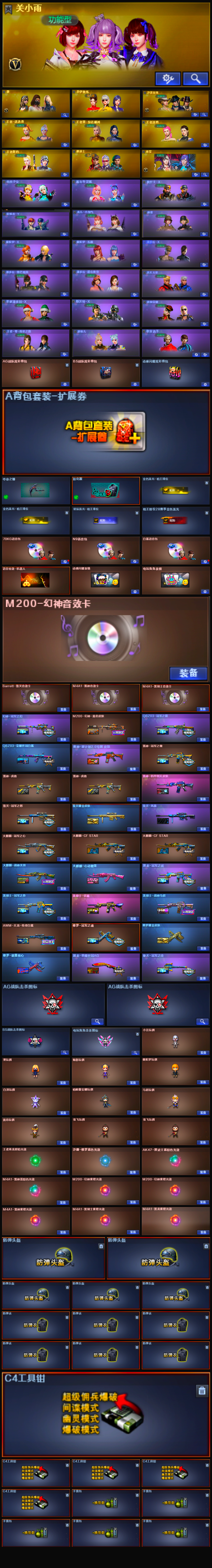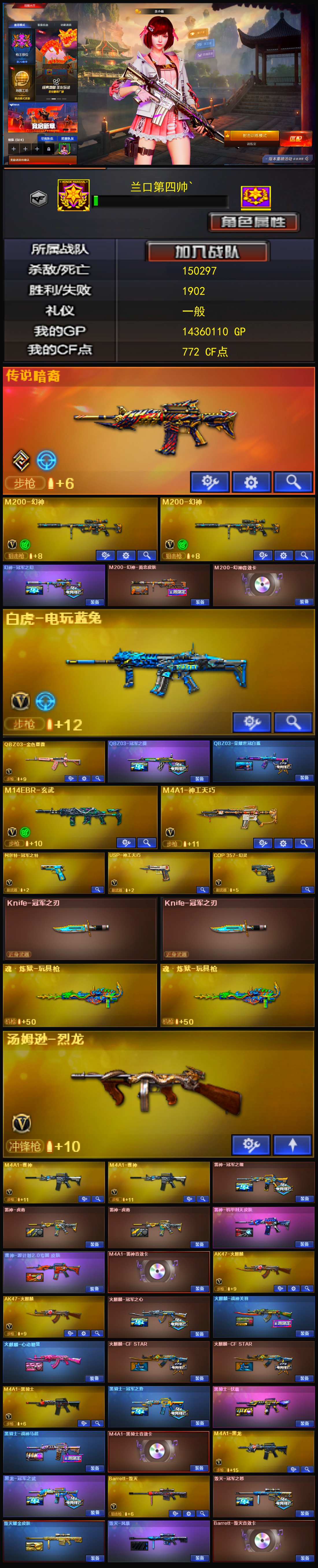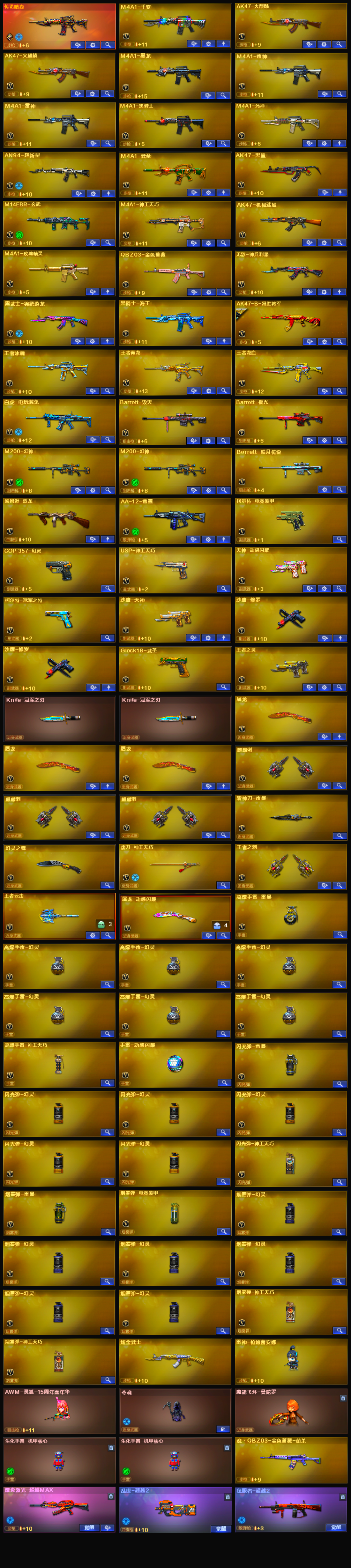 【m200幻神*2+音效卡+冠军之幻+黄忠+冠军之特+冠军之刃*2】【传说暗裔】【qbz金色蔷薇+冠军之薇+荣耀世冠白鲨】【玄武】【神工天巧套】【火麒麟+冠军之心】【黑龙+冠军之武】【雷神+卡+冠军之魄】【黑骑士+卡+冠军之势】【毁灭+卡+冠军之怒】【极光】 【武器:武圣 神工天巧 海王 王者冰魄 王者青龙 王者龙血 白虎电玩蓝兔 天龙 烈龙】 【10手呛:修罗*2 沙鹰天神 武圣 柯尔特电竞装甲 cop幻灵 usp神工天巧 天神动感闪耀 王者之灵 冠军之特】 【12刀具:屠龙*3 麒麟刺*3 斩神刀雷暴 幻灵之峰 神工天巧 王者之刺 王者云击】 【7雷套: 幻灵雷*5 雷暴雷 电竞装甲雷】 【小人呛:火麒麟灵狐 雷神呛娘雷安娜】 【音效卡:幻神音效卡 雷神音效卡 黑骑士音效卡 毁灭音效卡 】 【四防角色:王者葵惊若翩鸿 王者影豹】