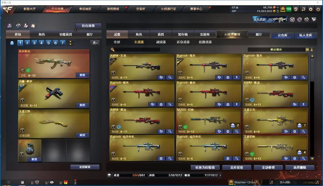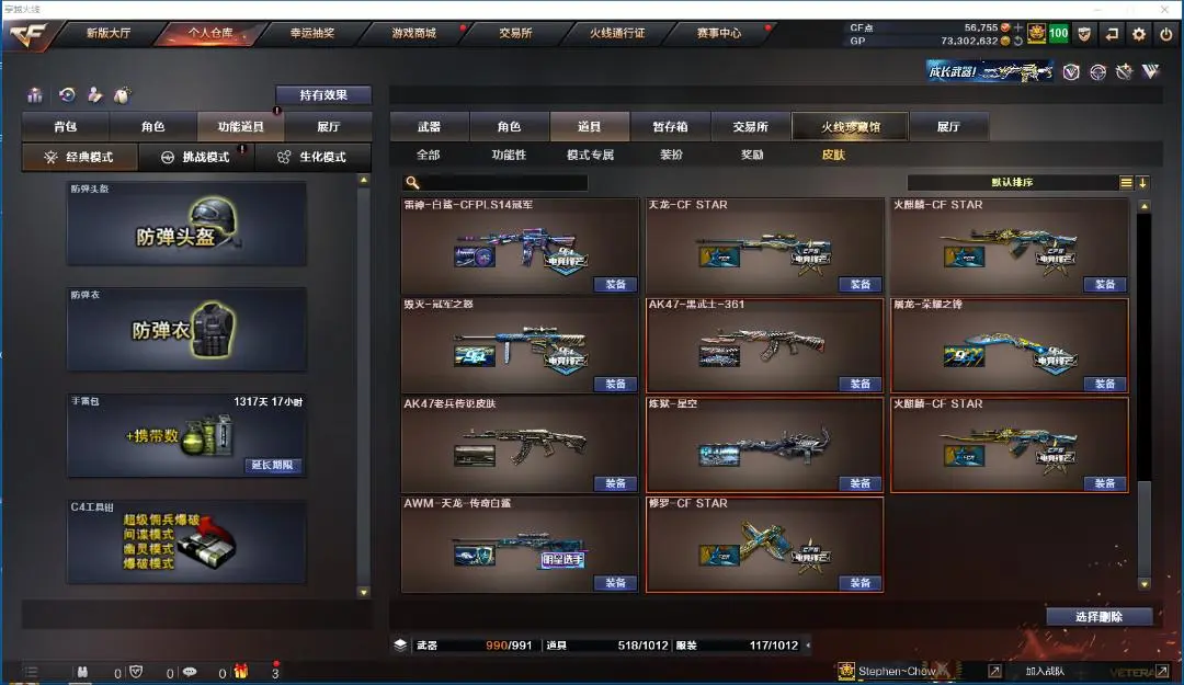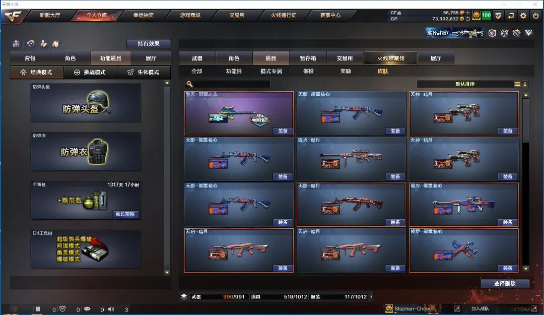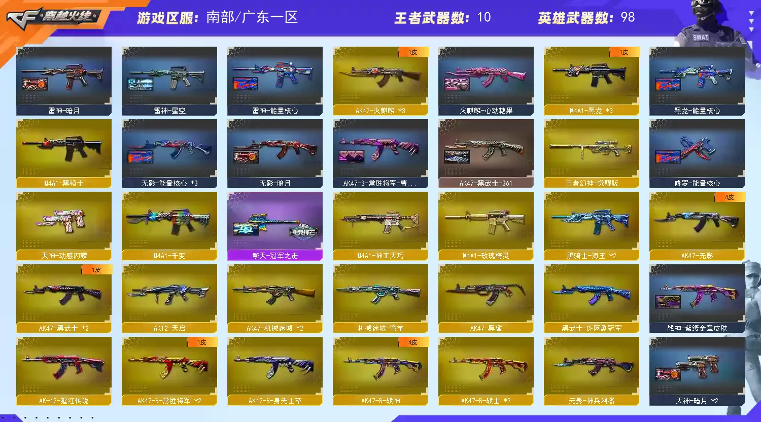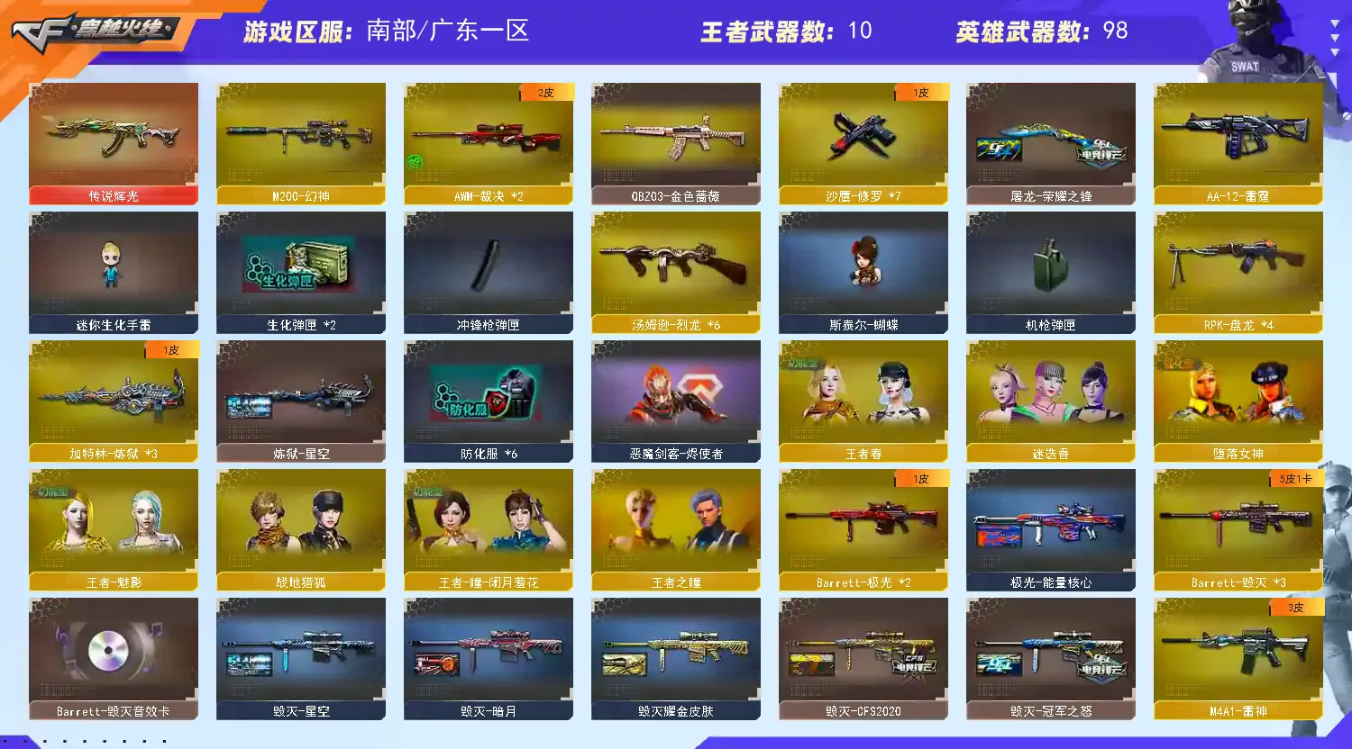 王者幻神 传说辉光 幻神 金色蔷薇 六烈龙+蝴蝶 王者之魄 玫瑰精灵 雷神+动感闪耀音效卡+星空皮肤+白鲨皮肤 毁灭+音效卡+冠军之怒皮肤+星空皮肤+CF2022皮肤+AGS15皮肤 火麒麟+皮肤 无影 死神 黑骑士 龙血 神工天巧 擎天-冠军之击皮肤 屠龙+荣耀之锋皮肤 防弹衣+防弹头盔+手雷包+C4钳子 迷你深渊冰龙刀