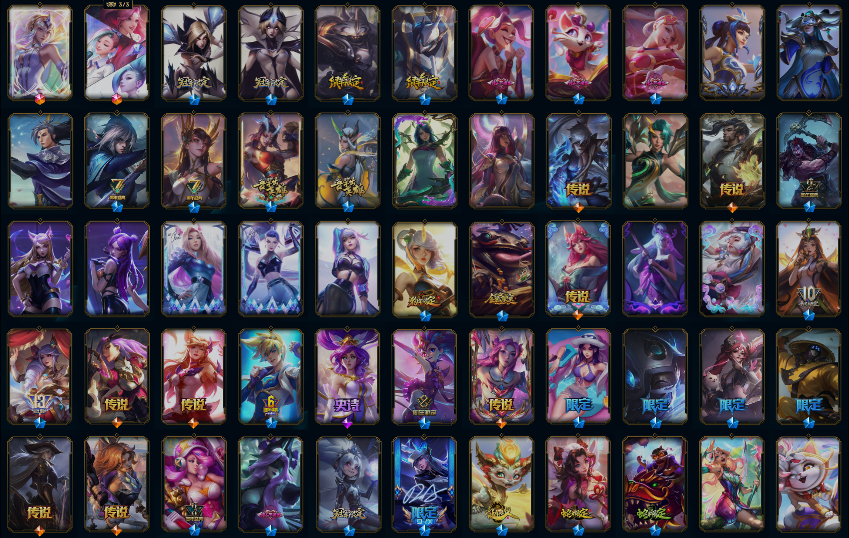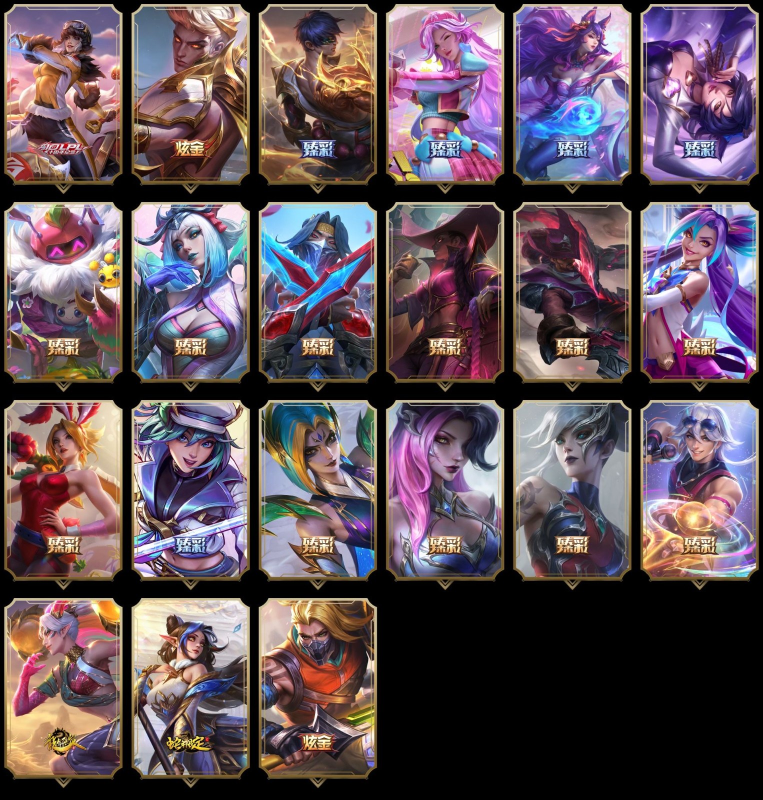 【重要皮肤】殿堂传奇阿狸 双城之战2指挥官凯特琳至臻 暗星女王黛安娜至臻 魔域梦魇泽丽至臻 幻灵狮心蕾欧娜至臻 北极星钢影卡蜜尔至臻 魔女阿卡丽至臻 玉剑传说琴仙子至臻 DRX亚托克斯至臻 花仙使者卡特琳娜至臻 绝息圣堂厄运小姐至臻 剪纸仙灵希维尔至臻 青花瓷丽桑卓至臻 太空律动魔音海妖娜美至臻 海珀利安小队X09星环灵风迦娜至臻 星之守护者辛德拉至臻 海之歌萨勒芬妮至臻 幻灵战斗猫金克丝至臻 青花瓷拉克丝至臻 神凰行者烈羽焰凰霞至臻 女帝黛安娜至臻 太空律动璐璐至臻 魔女婕拉至臻 真实伤害亚索至臻 真实伤害赛娜至臻 灵魂莲华提莫至臻 灵能特工伊泽瑞尔至臻 源计划逆流塞拉斯至臻 暗星墨菲特至臻 黑夜使者凯隐至臻 KDA二代卡莎至臻 KDA一代卡莎至臻 KDA伊芙琳至臻 战斗学院拉克丝至臻 烈焰美人薇恩至臻 电玩女神凯特琳至臻 魅惑女巫厄运小姐至臻 星之守护者妮蔻至臻 绒毛菲兹至臻 黑夜使者李青至臻 超级COSPLAY粉丝妮蔻 殿堂传奇乐芙兰 海克斯科技瑟庄妮 海克斯科技吉格斯 海克斯科技玛尔扎哈 海克斯科技阿木木 水晶泰坦诺提勒斯 水晶圣骑艾希 水晶圣骑蕾欧娜 黎明使者卡尔玛 摄魂使者薇恩 胜利剑圣易 胜利女神娑娜 胜利女神希维尔 胜利之王泰达米尔 胜利巨口克格莫 战熊骑士瑟庄妮 创星之灵璐璐 荣誉使者玛尔扎哈 养蜂人辛吉德 勇敢的心德莱厄斯 电玩女神厄运小姐 电玩女神阿狸 星之守护者伊泽瑞尔 玉剑传说无影 玉剑传说舞剑仙 神凰行者幽羽玄凰萨勒芬妮 女帝格温 玉剑传说神机花火 玉剑传说无劫 玉剑传说舞龙卫 玉剑传说星仙子 星之守护者佐伊 灵能特工易 点心宝贝阿木木 点心宝贝萨勒芬妮 点心宝贝辛德拉 剪纸仙灵嘉文四世 剪纸仙灵烬 剪纸仙灵娜美 天龙之子斯莫德 剪纸仙灵加里奥 招财进宝提莫 春晖神女拉克丝 南天之怒沃里克 玉净夜叉凯特琳 纳财大帝塔姆 神龙之翼库奇 王国机神苍狼瑟提 王国机神白虎贾克斯 胜利女神瑟庄妮 胜利机器人布里茨 胜利女神奥莉安娜 胜利枪神卢锡安 胜利之剑亚托克斯 怦然心动凯特琳 甜心宝贝娑娜 觅心萝莉金克丝 觅心猫猫悠米 觅心猎手薇恩 幽梦玫瑰辛德拉 北极星守望者佐伊 冬季仙境卡尔玛 冰雪女神辛德拉 魄罗骑士瑟庄妮 夺命美人卡特琳娜 平安夜女神娑娜 魅惑女巫妮蔻 魅惑女巫迦娜 死亡誓约劫 克烈古拉伯爵 南瓜头王子阿木木 勇敢的心德莱厄斯 海之歌永恩 泳池派对凯特琳 泳池派对嘉文四世 泳池派对厄运小姐 泳池派对菲奥娜 送披萨的小姐姐希维尔 制胜金靴李青 制胜金球拉莫斯 T1金克丝 DRX凯特琳 EDG佐伊 iG卡莎 iG乐芙兰 SKTT1辛德拉 SKTT1娜美 SKTT1阿利斯塔 SKTT1瑞兹 SKTT1雷克顿 SSW锤石 SSW图奇 SSW辛吉德 SKTT1劫 暗杀星蒙多 暗杀星努努和威朗普 暗杀星慎 Fnatic迦娜 冰雪节辛吉德 防暴士兵辛吉德 防暴天使凯尔 鬼影森森茂凯 鬼影重重魔腾 胡桃夹子萨科 惊悚派对费德提克 警用试作体K9内瑟斯 魅惑女巫娜美 魅惑女巫悠米 密林猎手提莫 女猎手希维尔 圣诞精灵崔丝塔娜 圣诞开心鬼提莫 圣诞狂欢基兰 圣诞老人古拉加斯 圣诞玩偶波比 圣诞驯鹿克格莫 外星装甲库奇 卧虎藏龙贾克斯 无头骑士赫卡里姆 喜庆之树茂凯 邪恶圣诞老人维迦 幸福女神乐芙兰 雪默丁格 野兽猎人德莱文 勇者阿狸 征服者诺提勒斯 暗影沃里克 魅惑女巫菲奥娜 魅惑女巫辛德拉 阿木木主人不要我了 波比的巧克力工坊 都铎王朝图奇 十五周年纪念希维尔 十周年纪念安妮 源代码乐芙兰 神凰行者瑞羽圣凰艾尼维亚 胜利凤凰艾尼维亚 大元素使拉克丝 KDAALLOUT萨勒芬妮独立音乐人 KDAALLOUT萨勒芬妮明日新星 KDAALLOUT萨勒芬妮超级巨星 绝息圣堂洛 魔女娜美