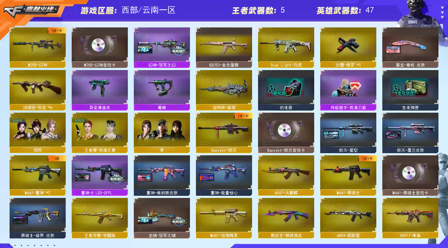 【亮点解析 幻神三件套】【m200幻神+音效卡+冠军之幻】【6烈龙 炼狱 死亡之眼】【scar白虎】【qbz金色蔷薇】【火麒麟】【雷神+s18冠军】【黑骑士+卡】【毁灭+卡+cfs2018】 【武器:超新星 王者之心 王者之武 王者芳薇 天龙 王者之光】 【6手呛:修罗*5 修罗古蛇迷踪】 【7刀具:屠龙*2 龙啸 擎天 麒麟刺 尼泊尔雷霆 斩神刀雷暴 幻灵之峰】 【雷套:雷暴雷 幻灵雷】 【小人呛:朱雀蛇隐宗】 【音效卡:幻神音效卡 黑骑士音效卡 毁灭音效卡 】 【四防角色:司雨