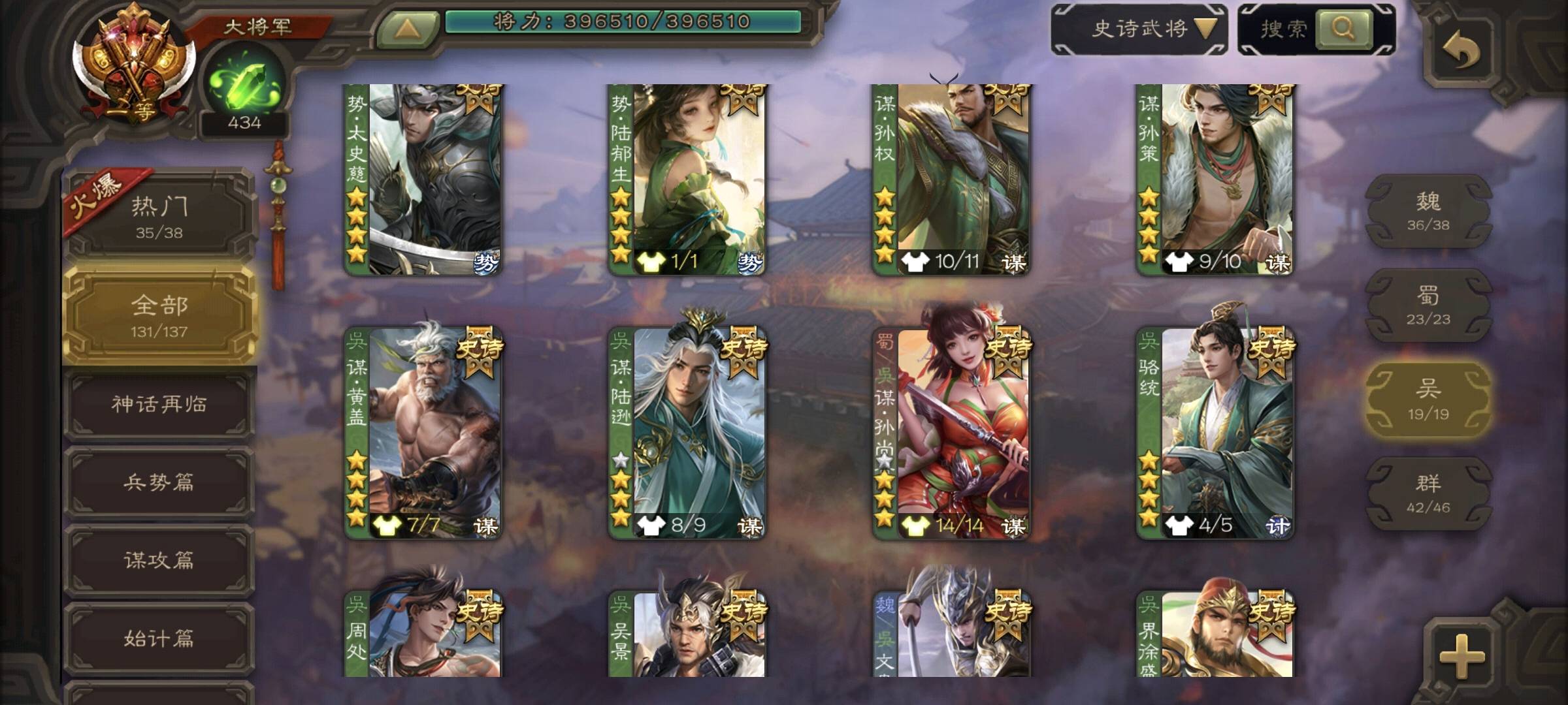 群——左慈,许攸,谋貂蝉,杜预,刘璋,界左慈,沮授,界李儒,张让,麹义,陶谦,士燮,司马徽,卑弥呼,刘焉,王允,苏飞,公孙康,兀突骨,祢衡,庞德公,郑玄,星甘宁,张仲景,黄甫嵩,界沮授,审配,徐荣,陈登,张琪瑛,灵雎,杨彪,裴秀,十常侍,星黄忠,星魏延,谋公孙瓒,星董卓,势于吉
