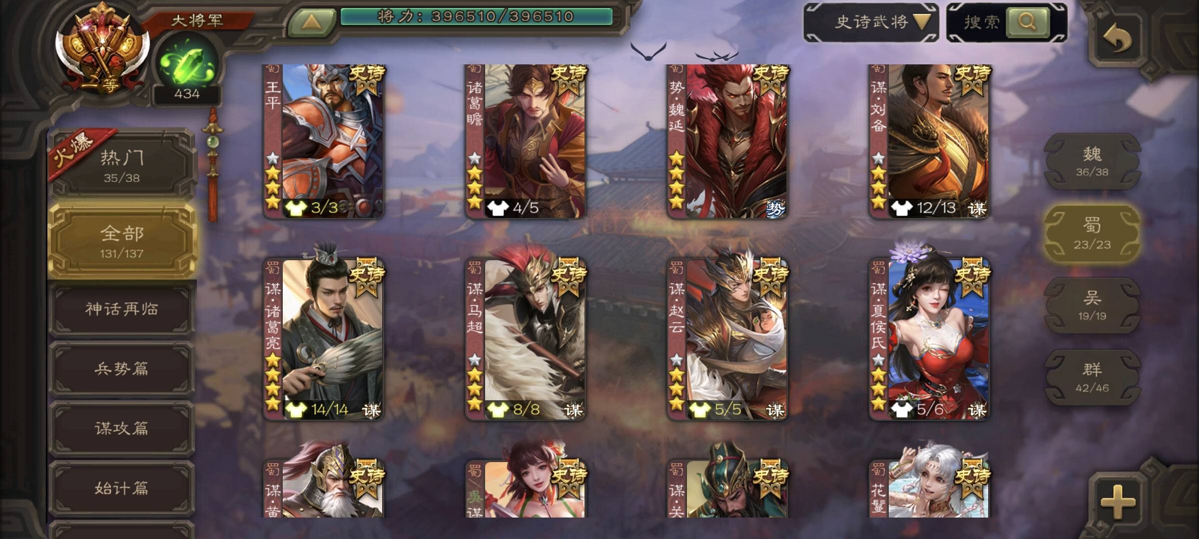 蜀——王平,诸葛瞻,谋马超,谋赵云,谋夏侯氏,花鬘,界黄忠,马云騄,张星彩,董允,赵襄,关索,沙摩柯,周群,谯周,谋刘备,某黄忠,谋孙尚香,鲍三娘,傅佥,谋诸葛亮,谋关羽,势魏延