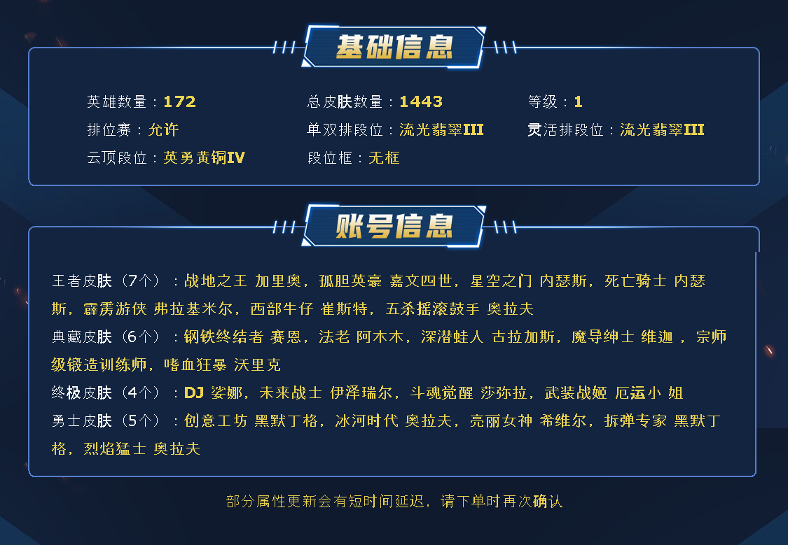 ~~喜欢记得收藏~~可排位~~1405皮全英雄丨947原皮458炫彩~~租之前尽量查一下游戏ID,确保段位是您需要的,避免浪费您的时间~~请勿挂机逃跑故意送人头,谢谢合作,谢谢~~