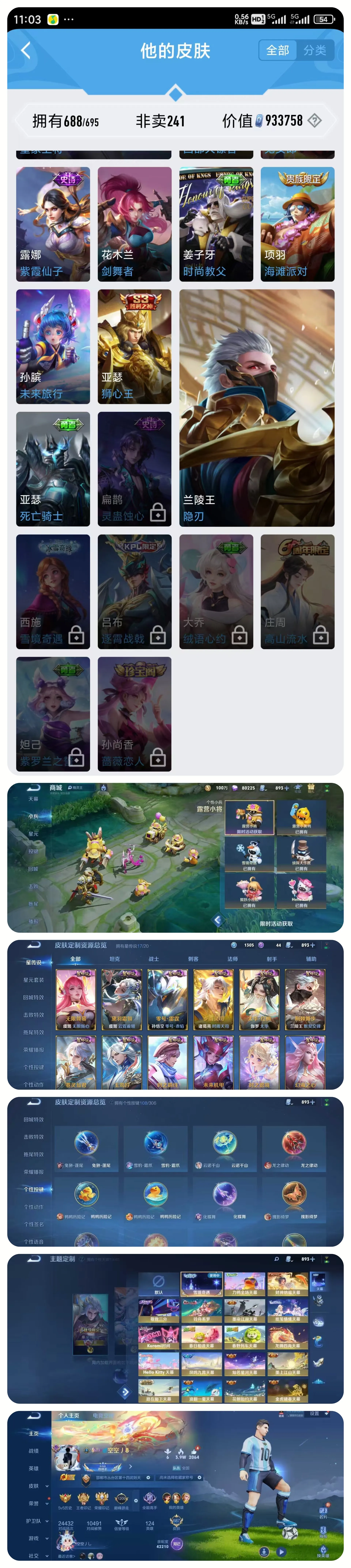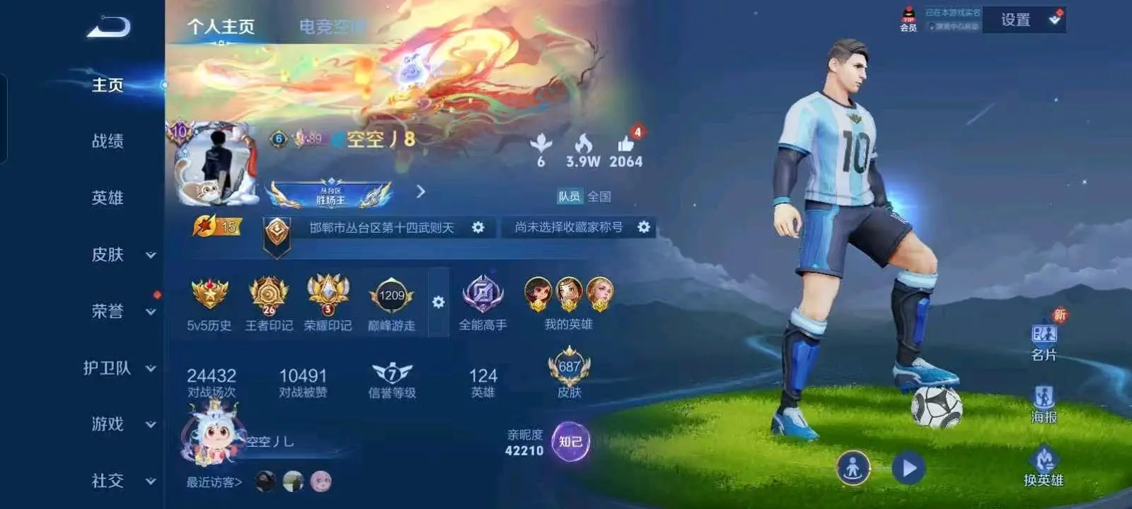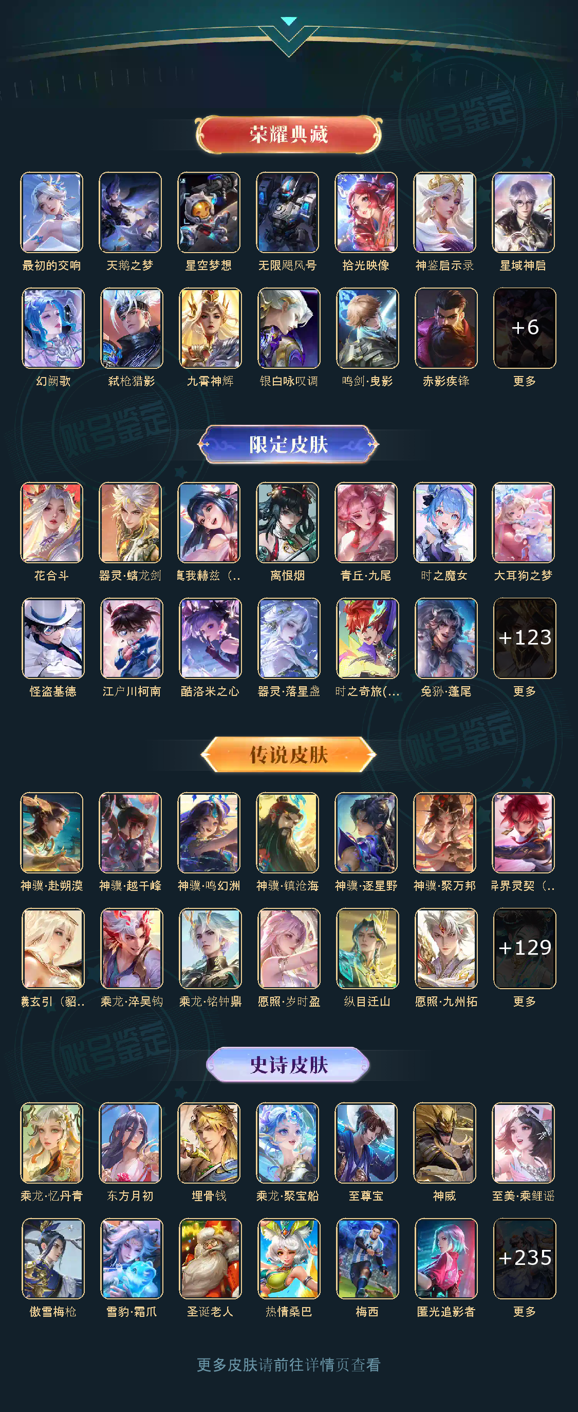 贵族等级V10荣耀贵族,英雄数量126,典藏皮肤数19,皮肤数量782,冰锋战神/街头霸王/天鹅之梦/纯白花嫁/天魔缭乱/至尊宝/杀手不太冷/真爱至上/圣诞老人/王者之锤/大秦宣太后/凤求凰/热情桑巴/逐梦之影/武陵仙君/神奇女侠/星空梦想/梅西/无限飓风号/黄金狮子座/一生所爱/全息碎影/大圣娶亲/冰霜恋舞曲/青龙志/白虎志/朱雀志/活力突击/太华/久胜战神/飞衡/梁祝/倪克斯神谕/白鹤梁神女/匿光追影者/鸣剑·曳影/遇见胡旋/龙胆/星域神启/李逍遥/武圣/奔雷神使/孙行者/玉兔公主/补天/异界灵契/神威/启示之音/傲雪梅枪/淬星耀世/时雨天司