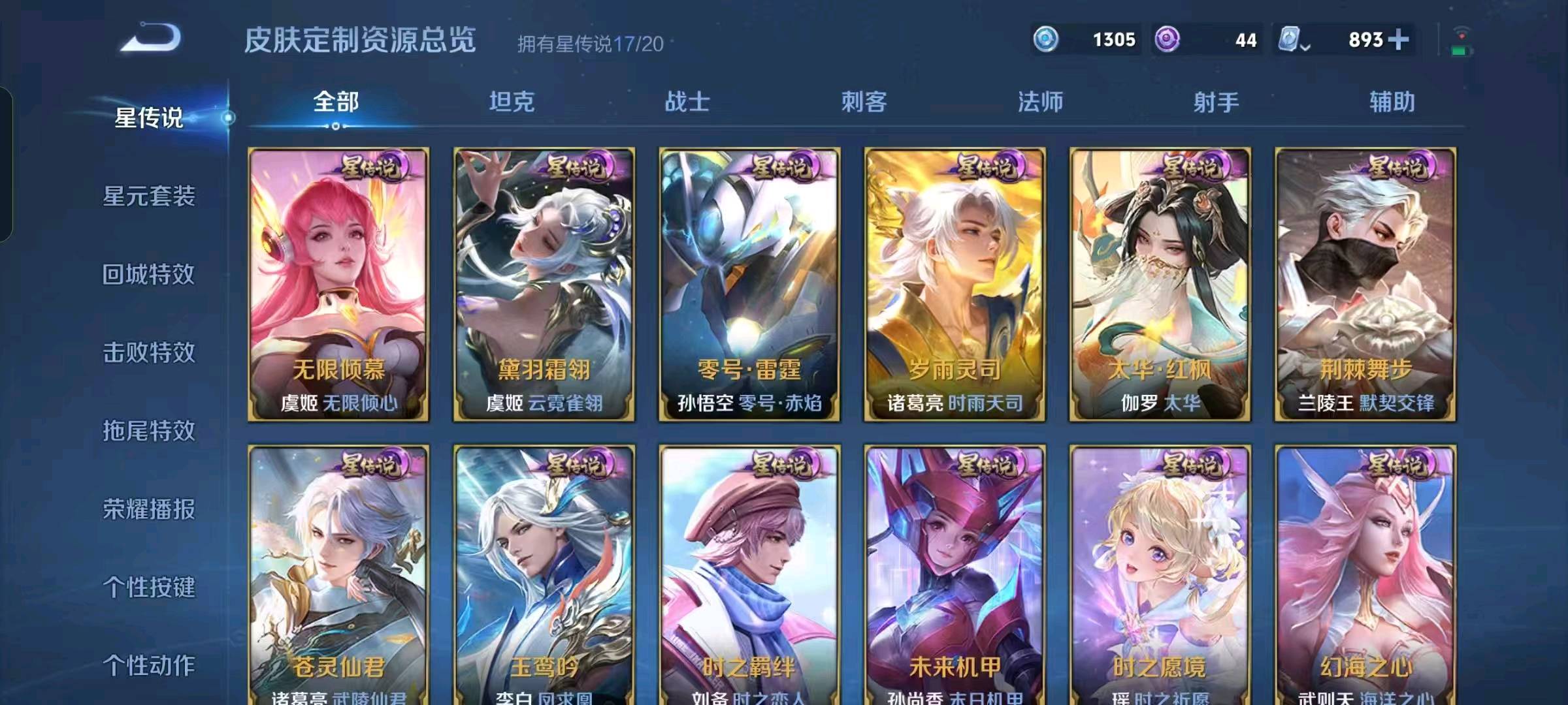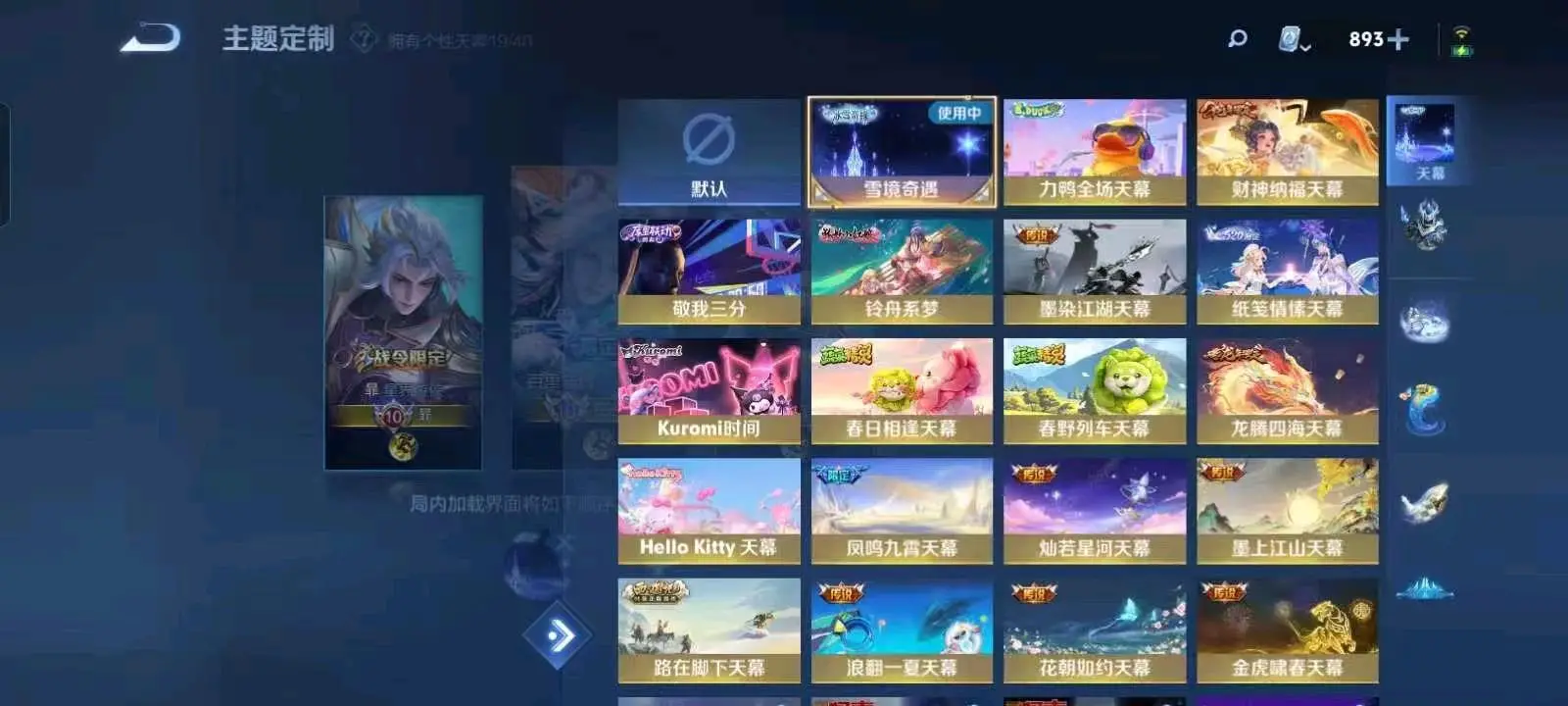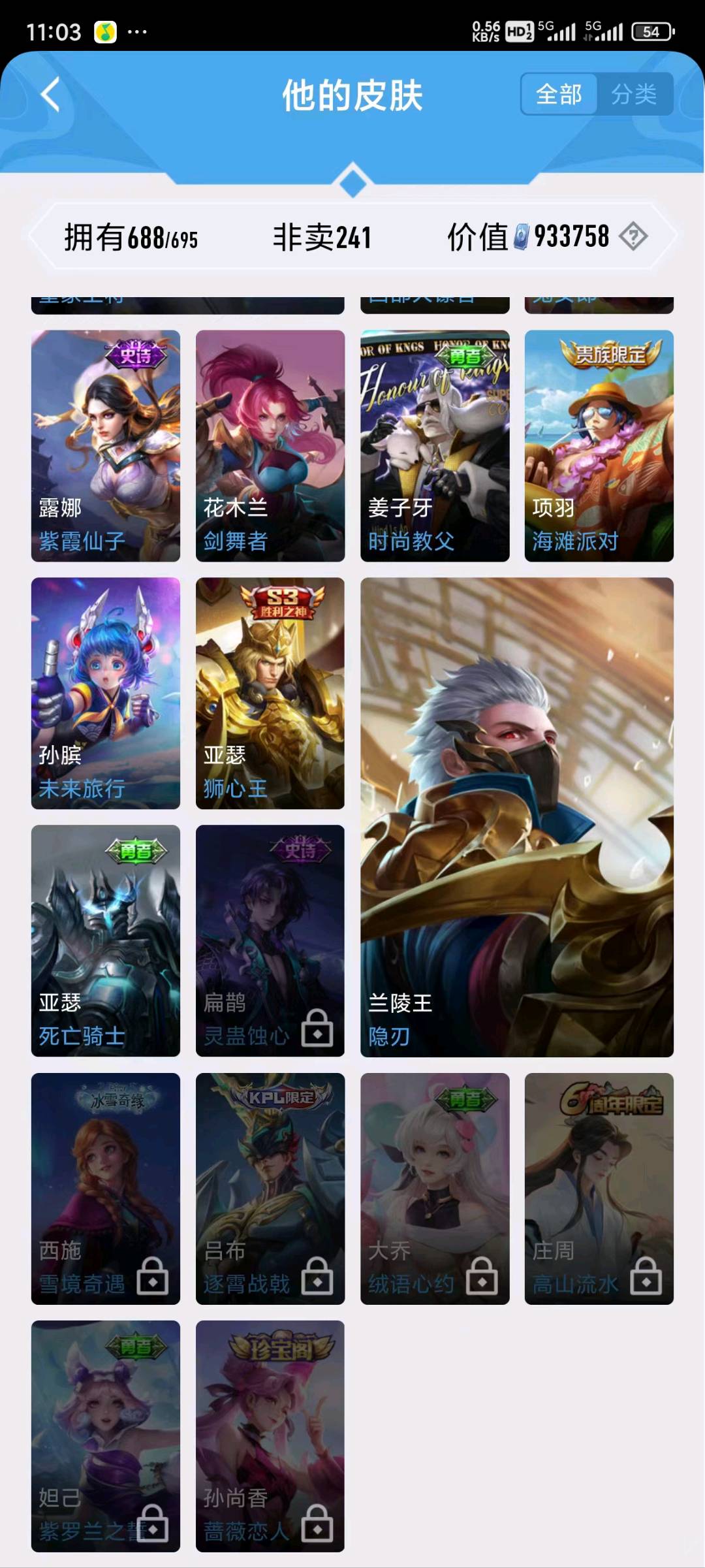 贵族等级V10荣耀贵族,英雄数量126,典藏皮肤数19,皮肤数量782,冰锋战神/街头霸王/天鹅之梦/纯白花嫁/天魔缭乱/至尊宝/杀手不太冷/真爱至上/圣诞老人/王者之锤/大秦宣太后/凤求凰/热情桑巴/逐梦之影/武陵仙君/神奇女侠/星空梦想/梅西/无限飓风号/黄金狮子座/一生所爱/全息碎影/大圣娶亲/冰霜恋舞曲/青龙志/白虎志/朱雀志/活力突击/太华/久胜战神/飞衡/梁祝/倪克斯神谕/白鹤梁神女/匿光追影者/鸣剑·曳影/遇见胡旋/龙胆/星域神启/李逍遥/武圣/奔雷神使/孙行者/玉兔公主/补天/异界灵契/神威/启示之音/傲雪梅枪/淬星耀世/时雨天司