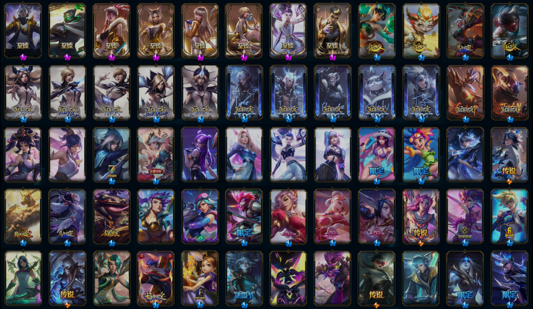 【传说皮肤】欧米伽小队幽灵特工 影执事劫 星之守护者拉克丝 冰川巨兽墨菲特 黎明使者锐雯 冰霜亚龙希瓦娜 青花瓷伊泽瑞尔 战斗学院伊泽瑞尔 苹果机器人布里茨 神王盖伦 星之守护者阿卡丽 神龙尊者圣龙李青 宇航员诺提勒斯 源计划超体莫德凯撒 金牌主播德莱文 源计划净化薇恩 源计划联合艾希 光明哨兵格雷福斯 恶魔之刃泰达米尔 光明哨兵薇恩 至尊魔女莫甘娜 西部魔影卢锡安 星之守护者洛 源计划泯灭雷克顿 烈焰雄心崔丝塔娜 双重冰晶艾尼维亚 黎明使者永恩 黎明使者索拉卡 星之守护者卡莎 提莫约德尔人的一大步 第三类接触黑默丁格 泳池派对吉格斯 最终BOSS维迦 焰尾妖狐阿狸 血石领主弗拉基米尔 战斗学院凯特琳 红色男爵库奇 魔幻卡牌崔斯特 真实伤害艾克 未来战士凯特琳 枯萎之壤泽拉斯 丧尸布兰德 上古战魂魔腾 女主播迦娜 鬼魂新娘莫甘娜 大天使长米迦勒凯尔 银河魔装机神兰博 女皇艾希 腥红之月鬼武姬阿卡丽 女警狙击凯特琳 战场女武神凯尔 约德尔国队长提莫 神拳李青 电玩女神娑娜 邪鸦魅影乐芙兰 地狱之门卫士加里奥 屠龙勇士潘森 暗星锤石 黯晶凤凰艾尼维亚 星之守护者霞 铁哥们儿奥拉夫 炼狱魔犬内瑟斯 绅士科加斯 律政大亨蒙多 黑夜使者亚索 黯黑魔龙希瓦娜 苍穹之光韦鲁斯 女校长菲奥娜 钢铁之翼凯尔 霸天异形卡兹克