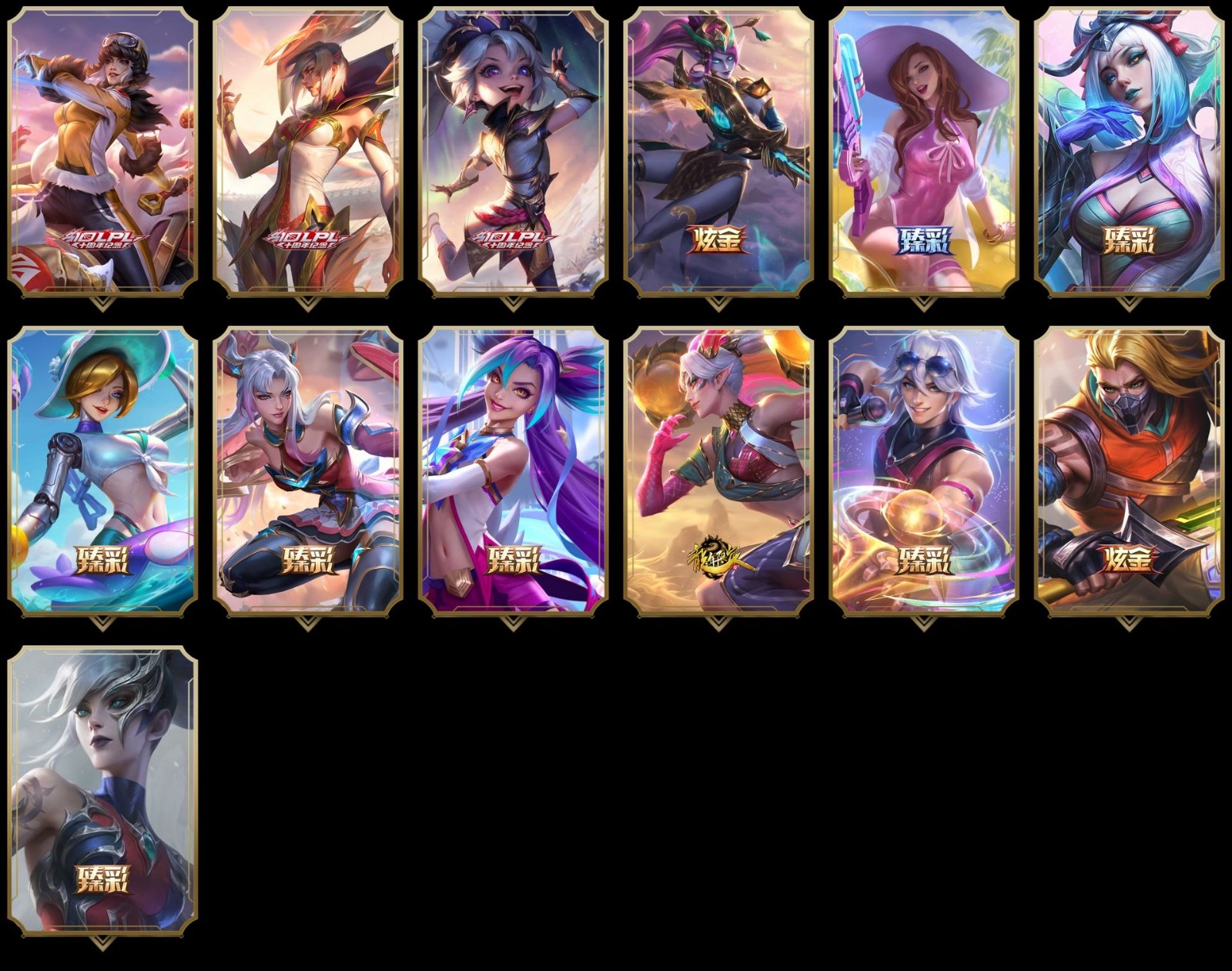 【重要皮肤】黑色玫瑰假面舞会卡特琳娜至臻 魔域梦魇泽丽至臻 T1杰斯至臻 天龙之子伊泽瑞尔至臻 玉剑传说琴仙子至臻 绝息圣堂厄运小姐至臻 剪纸仙灵希维尔至臻 青花瓷丽桑卓至臻 北极星使者沃里克至臻 灵魂莲华易至臻 星之守护者辛德拉至臻 星之守护者艾克至臻 西部魔影猎天使恶魔泰隆至臻 幻灵战斗猫金克丝至臻 青花瓷拉克丝至臻 神凰行者烈羽焰凰霞至臻 魅惑女巫莫甘娜至臻 女帝黛安娜至臻 太空律动璐璐至臻 魔女婕拉至臻 魔女乐芙兰至臻 奥术师佐伊至臻 未来战士卢锡安至臻 真实伤害亚索至臻 真实伤害赛娜至臻 灵魂莲华提莫至臻 灵能特工伊泽瑞尔至臻 福牛守护者菲奥娜至臻 源计划逆流塞拉斯至臻 源计划阴劫至臻 王国机神玄武盖伦至臻 神龙尊者炎龙瑟提至臻 黑夜使者凯隐至臻 征服者贾克斯至臻 飞升战神潘森至臻 焰执事布兰德至臻 KDA二代卡莎至臻 KDA一代卡莎至臻 KDA卡莎2022至臻 KDA阿狸至臻 KDA伊芙琳至臻 KDA伊芙琳2022至臻 KDA阿卡丽至臻 战斗学院拉克丝至臻 电玩女神凯特琳至臻 电玩女神凯特琳2022至臻 魅惑女巫厄运小姐至臻 星之守护者妮蔻至臻 源计划正义艾瑞莉娅至臻 源计划正义艾瑞莉娅2022至臻 真实伤害奇亚娜至臻 绒毛菲兹至臻 绒毛菲兹2022至臻 玉剑传说武剑仙至臻 玉剑传说武剑仙2022至臻 腥红之月亚托克斯至臻 腥红之月亚托克斯2022至臻 未来战士锤石至臻 未来战士锤石2022至臻 黑夜使者李青至臻 黑夜使者李青2022至臻 灰烬骑士莫德凯撒 灰烬骑士派克 灰烬杀手塞拉斯 海克斯科技雷克顿 海克斯科技斯维因 海克斯科技吉格斯 海克斯科技玛尔扎哈 海克斯科技阿利斯塔 海克斯科技阿木木 海克斯科技拉莫斯 海克斯科技崔丝塔娜 水晶掠夺者卡兹克 黎明使者卡尔玛 恐惧新星德莱厄斯 零之枪骑赫卡里姆 摄魂使者薇恩 胜利之王泰达米尔 安妮梦游仙境 星之守护者伊泽瑞尔 玉剑传说无影 玉剑传说无劫 玉剑传说翼剑仙 星之守护者佐伊 银龙裁决泰隆 天龙之子卡莎 天龙之子斯莫德 替父从军花木兰 碧玉之牙卡西奥佩娅 你看见过我的熊猫吗安妮 北辰之威内瑟斯 南天之怒沃里克 美猴王孙悟空 玉净夜叉凯特琳 紫金罗刹莫甘娜 广寒仙子嫦娥 纳财大帝塔姆 福牛守护者安妮 福牛守护者厄斐琉斯 福牛守护者德莱厄斯 胜利女神瑟庄妮 胜利机器人布里茨 胜利枪神卢锡安 胜利之剑亚托克斯 怦然心动凯特琳 甜心之羽霞 甜心宝贝娑娜 穿心之剑菲奥娜 觅心魔灵奥莉安娜 北极星神黛安娜 北极星守望者佐伊 寒冬精灵璐璐 圣诞老人布隆 冬季仙境卡尔玛 狂心冰王图奇 冰雪女神辛德拉 魄罗骑士瑟庄妮 平安夜女神娑娜 圣诞糖果棒厄运小姐 魅惑女巫奈德丽 海之歌永恩 泳池派对凯特琳 泳池派对佐伊 泳池派对辛德拉 泳池派对奥莉安娜 泳池派对塔莉垭 泳池派对塔里克 泳池派对布隆 电玩战魂赫卡里姆 御星魔矢艾希 DRX凯特琳 EDG厄斐琉斯 EDG佛耶戈 EDG格雷福斯 EDG悠米 EDG佐伊 DWG烬 FPX锤石 FPX薇恩 FPX李青 FPX普朗克 FPX墨菲特 iG卡蜜尔 iG洛 iG卡莎 iG艾瑞莉娅 iG乐芙兰 iG菲奥娜 SSG霞 SSG纳尔 SKTT1娜美 SKTT1艾克 SKTT1瑞兹 SKTT1伊莉丝 SKTT1雷克顿 SSW泰隆 SSW辛吉德 SKTT1贾克斯 SKTT1劫 暗杀星蒙多 暗杀星伊泽瑞尔 暗杀星慎 Fnatic迦娜 Fnatic库奇 Fnatic嘉文四世 Fnatic卡尔萨斯 冰雪节格雷福斯 冰雪节玛尔扎哈 冰雪节辛吉德 防暴士兵辛吉德 钢铁之翼艾尼维亚 冠军之刃锐雯 冠军之刃锐雯2016 冠军之血希瓦娜 春晖大帝锤石 鬼影森森茂凯 鬼影重重魔腾 海贼瑞兹 胡桃夹子萨科 惊悚派对阿木木 惊悚派对费德提克 警用试作体K9内瑟斯 蓝色忧郁崔斯特 密林猎手提莫 南瓜头费德提克 圣诞精灵崔丝塔娜 圣诞开心鬼提莫 圣诞狂欢努努和威朗普 圣诞老人古拉加斯 圣诞玩偶波比 糖果使徒费德提克 外星装甲库奇 无头骑士赫卡里姆 喜庆之树茂凯 幸福女神乐芙兰 雪默丁格 野兽猎人瑟庄妮 勇者奈德丽 征服者卡尔玛 冠军之箭艾希 地底世界崔斯特 十周年纪念安妮 源代码乐芙兰 胜利凤凰艾尼维亚 未来战士伊泽瑞尔