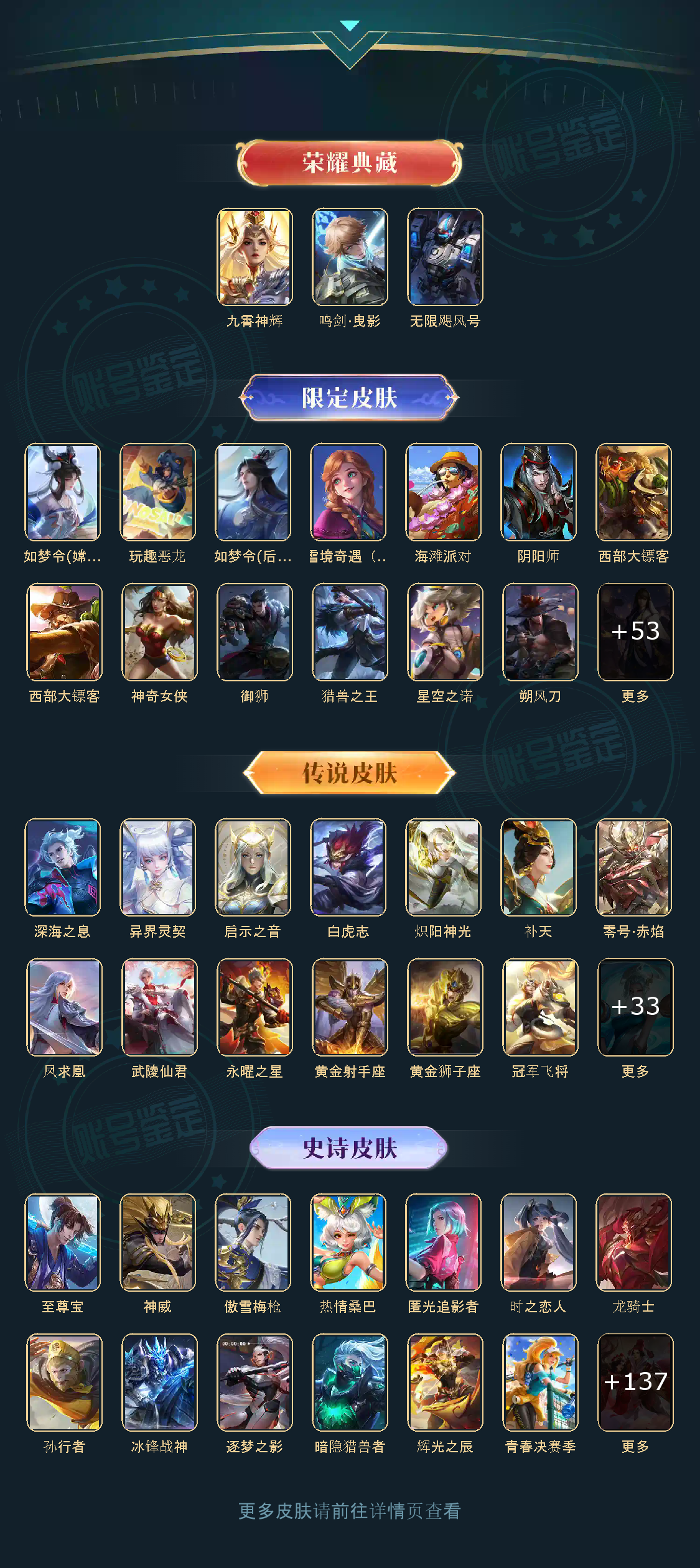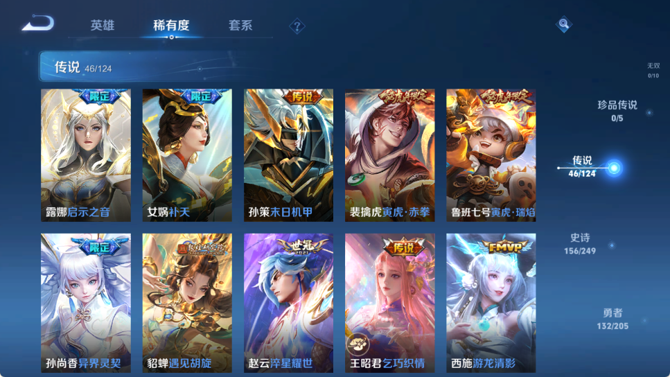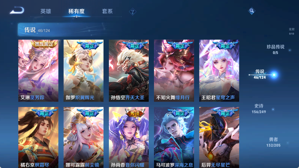贵族等级V10,英雄数量122,典藏皮肤数3,皮肤数量416,冰锋战神/街头霸王/至尊宝/凤求凰/热情桑巴/逐梦之影/武陵仙君/神奇女侠/无限飓风号/黄金狮子座/一生所爱/大圣娶亲/青龙志/白虎志/朱雀志/太华/久胜战神/飞衡/梁祝/匿光追影者/鸣剑·曳影/遇见胡旋/龙胆/武圣/奔雷神使/孙行者/玉兔公主/补天/异界灵契/神威/启示之音/傲雪梅枪/淬星耀世/时雨天司