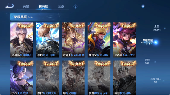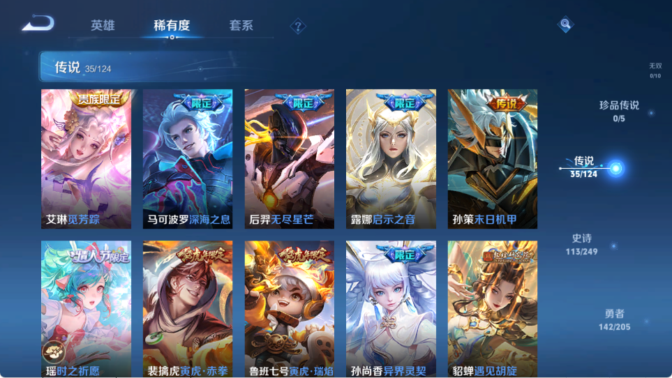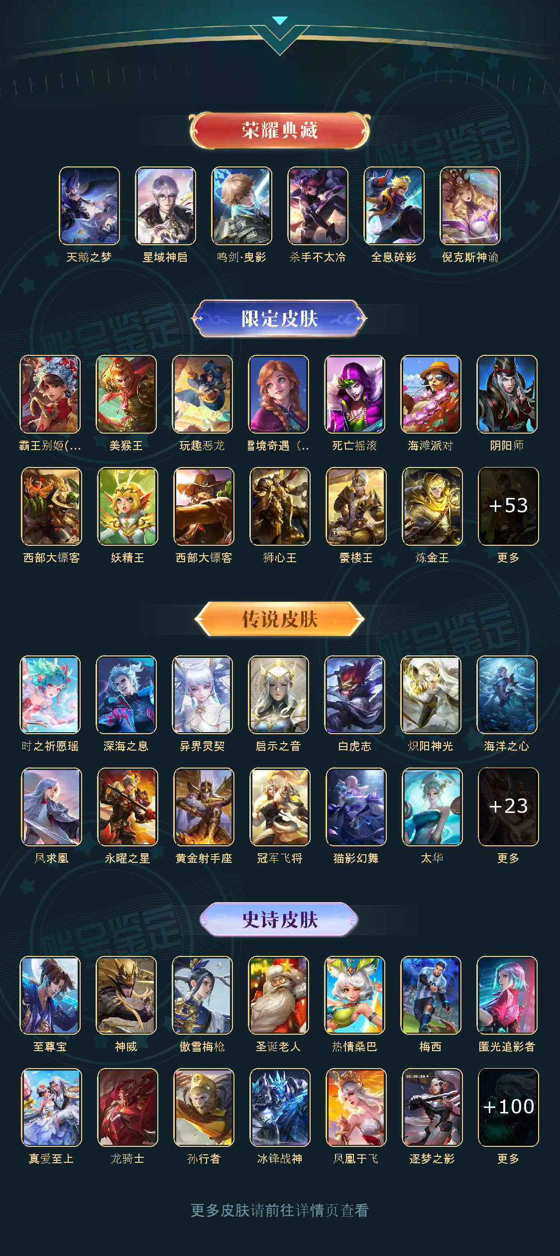 贵族等级V10,英雄数量123,典藏皮肤数6,皮肤数量393,天鹅之梦/全息碎影/倪克斯神谕/鸣剑·曳影/星域神启/启示之音/淬星耀世