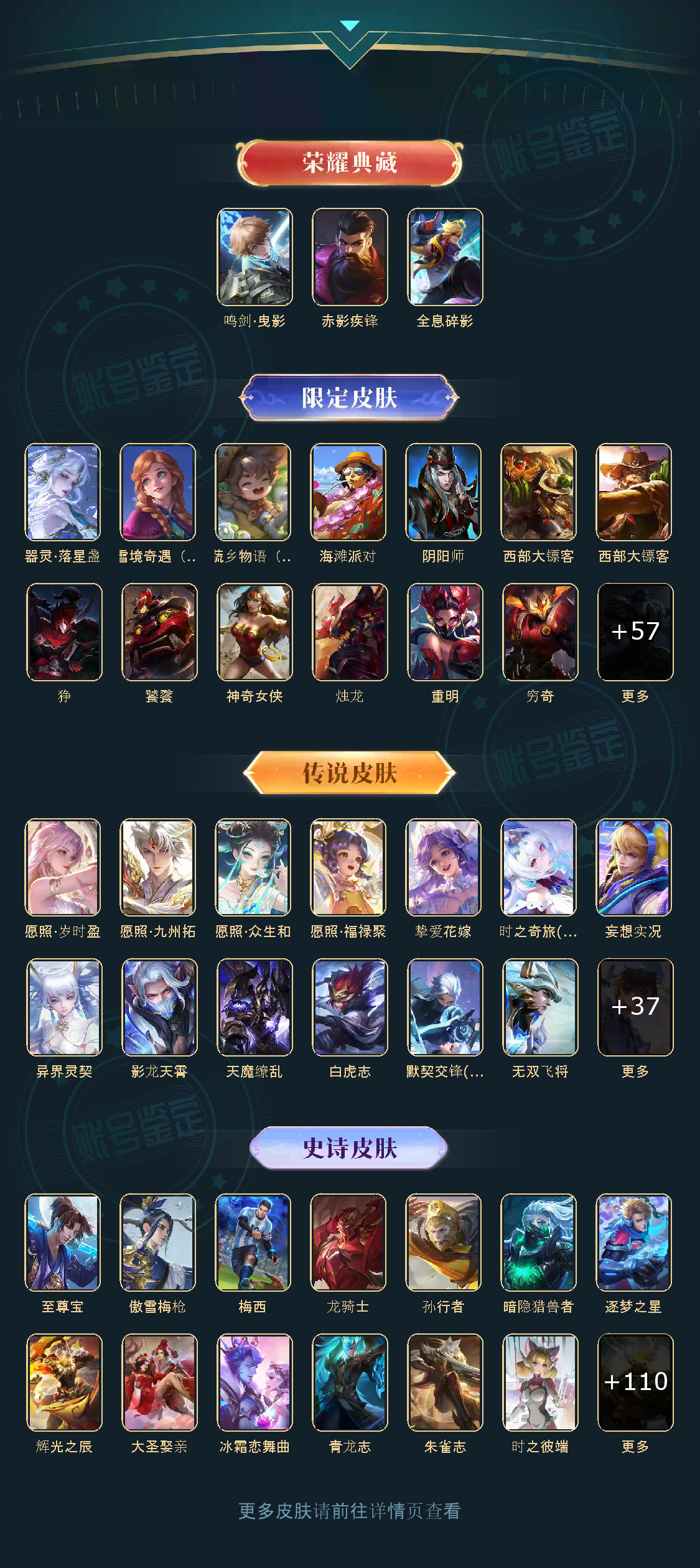 贵族等级V10,英雄数量123,典藏皮肤数3,皮肤数量407,全息碎影/鸣剑·曳影/补天/异界灵契