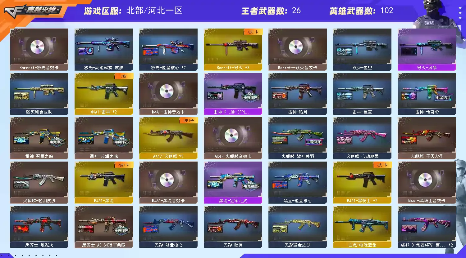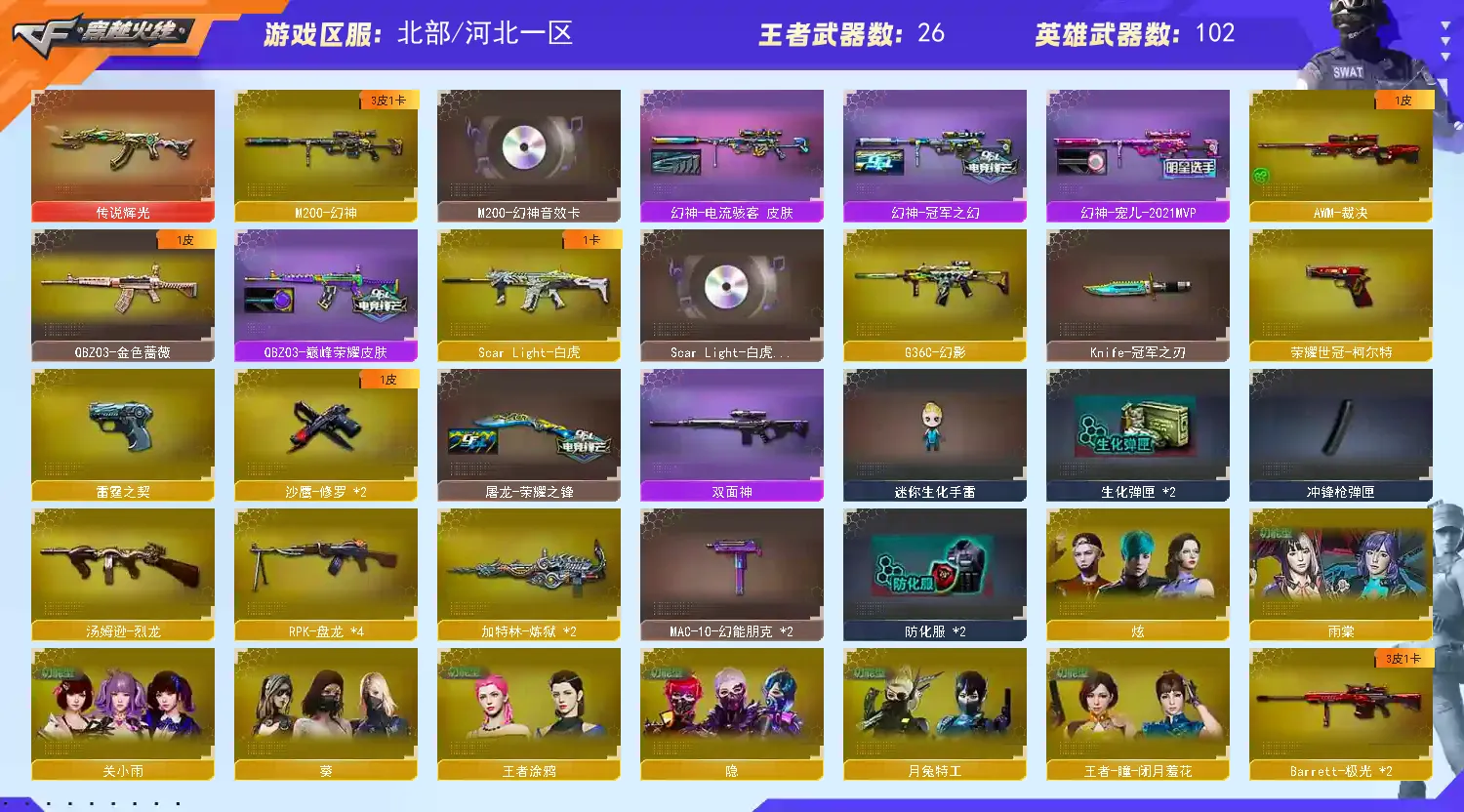 【幻神三件套!!!】【传说武器!!!】【m200幻神+幻神音效卡+宠儿皮肤+冠军之幻皮肤+电流骇客皮肤+冠军之刃】 【王者星霆】 【传说辉光】【白虎+白虎音效卡】【qbz03金色蔷薇+巅峰荣耀皮肤】 【4盘龙+2炼狱+2烈龙】【g36c幻影】 【荣耀世冠火麒麟】 【王者之心 王者之魄 雷霆王者 王者之怒】【火麒麟+火麒麟音效卡】 【黑龙+黑龙音效卡+冠军之武皮肤】 【黑骑士+黑骑士音效卡+s4典藏皮肤】 【毁灭+毁灭音效卡+格雷呛娘姐妹皮肤+cfpls15冠军皮肤】 【千变 无影 黑武士 超新星 武圣 黑鲨 龙血 朱雀 锦绣游龙 热带奇洋 猎神 烈火 动感闪耀 猩红传说 战神 海王 常胜将军 白虎电玩 天龙 极光 裁决 暗月传说】——【沙鹰修罗 cop357雷霆 天神动闪耀 荣耀世冠柯尔特】——【冠军之刃 屠龙 龙啸 擎天 麒麟刺 尼泊尔雷霆 斩神刀 麒麟刺堕天神 擎天竞技荣光 屠龙动感闪耀 龙啸热带奇洋 王者之锋 王者之啸 荣耀世冠龙啸】——【雷霆投掷武器套装*4 雷暴投掷武器套装 堕天神投掷武器套装 竞技荣光投掷武器套装 雷霆王者投掷武器套装*4】——【雷神精英刀锋 火麒麟灵狐 毁灭孙三炮 ak47魔将】——【角色】【4防(王者瞳闭月羞花 王者涂鸦)】 【关小雨 葵 隐 雨棠 月兔特工 炫】