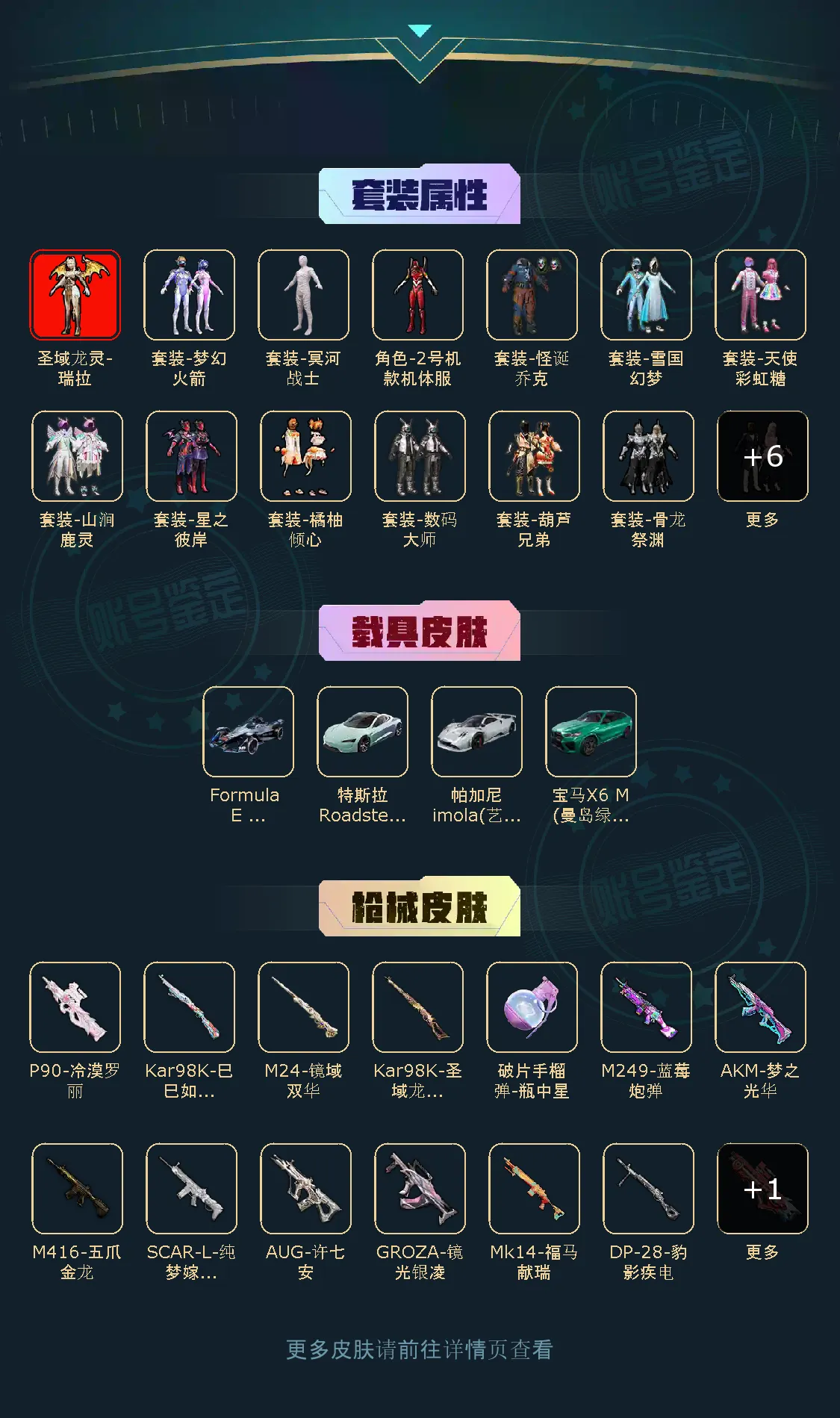 【粉色枪皮】M416-五爪金龙/AKM-梦之光华/SCAR-L-纯梦嫁纱/GROZA-镜光银凌/AUG-许七安/Kar98K-巳巳如意/Kar98K-圣域龙灵]/M24-镜域双华/P90-冷漠罗丽/P90-能量风暴/M249-蓝莓炮弹/破片手榴弹-瓶中星球