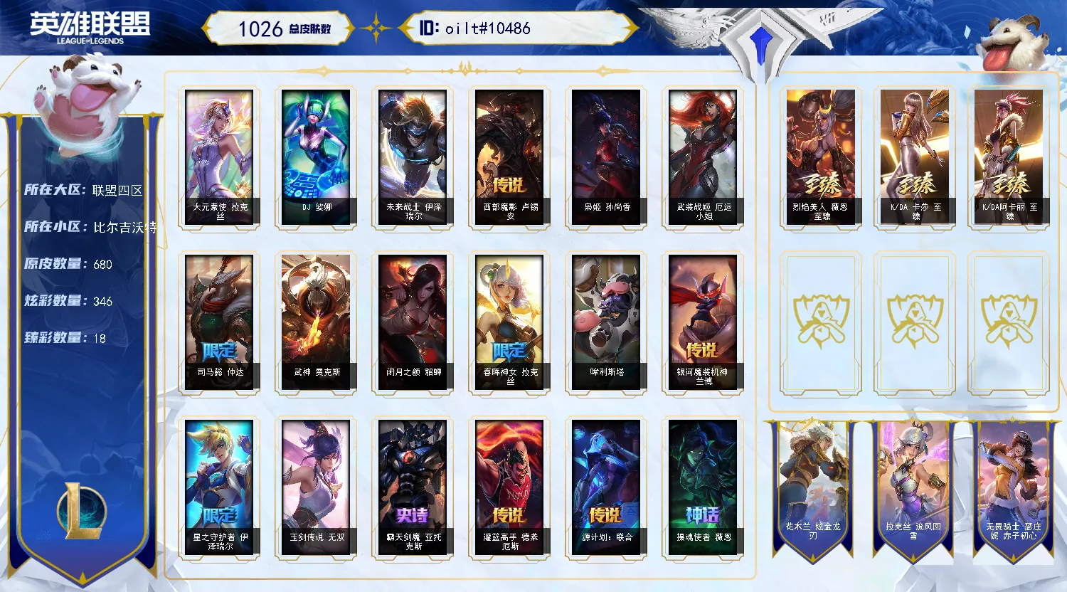 1050皮肤多限定可排位全英雄摄魂薇恩至臻卡莎恐惧新星斩星魔剑鳄霸鸡里奥花木兰广寒仙子觅心卢锡安