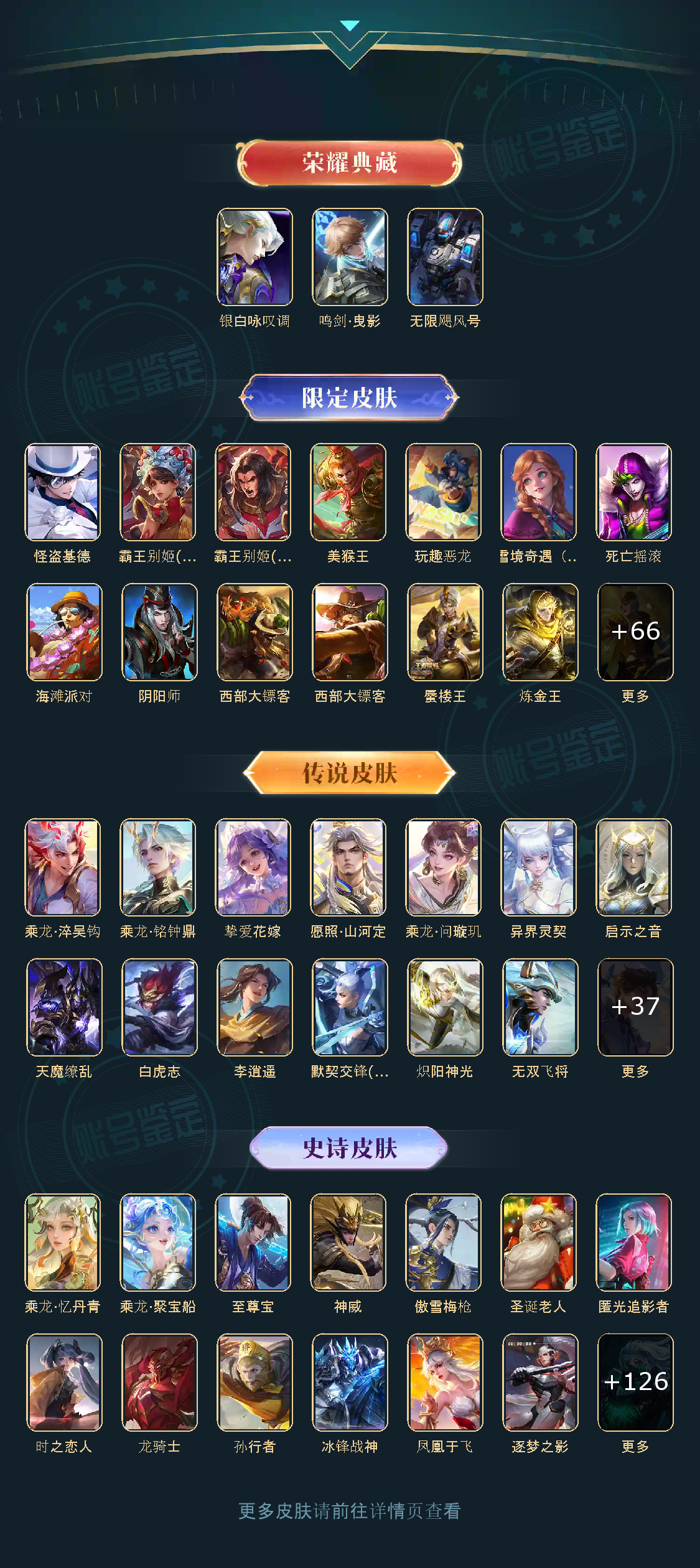 贵族等级V10,英雄数量124,典藏皮肤数3,皮肤数量437,冰锋战神/街头霸王/天魔缭乱/至尊宝/圣诞老人/王者之锤/凤求凰/逐梦之影/武陵仙君/无限飓风号/黄金狮子座/大圣娶亲/冰霜恋舞曲/青龙志/白虎志/久胜战神/飞衡/梁祝/匿光追影者/鸣剑·曳影/龙胆/李逍遥/孙行者/玉兔公主/补天/异界灵契/神威/启示之音/傲雪梅枪/淬星耀世/时雨天司