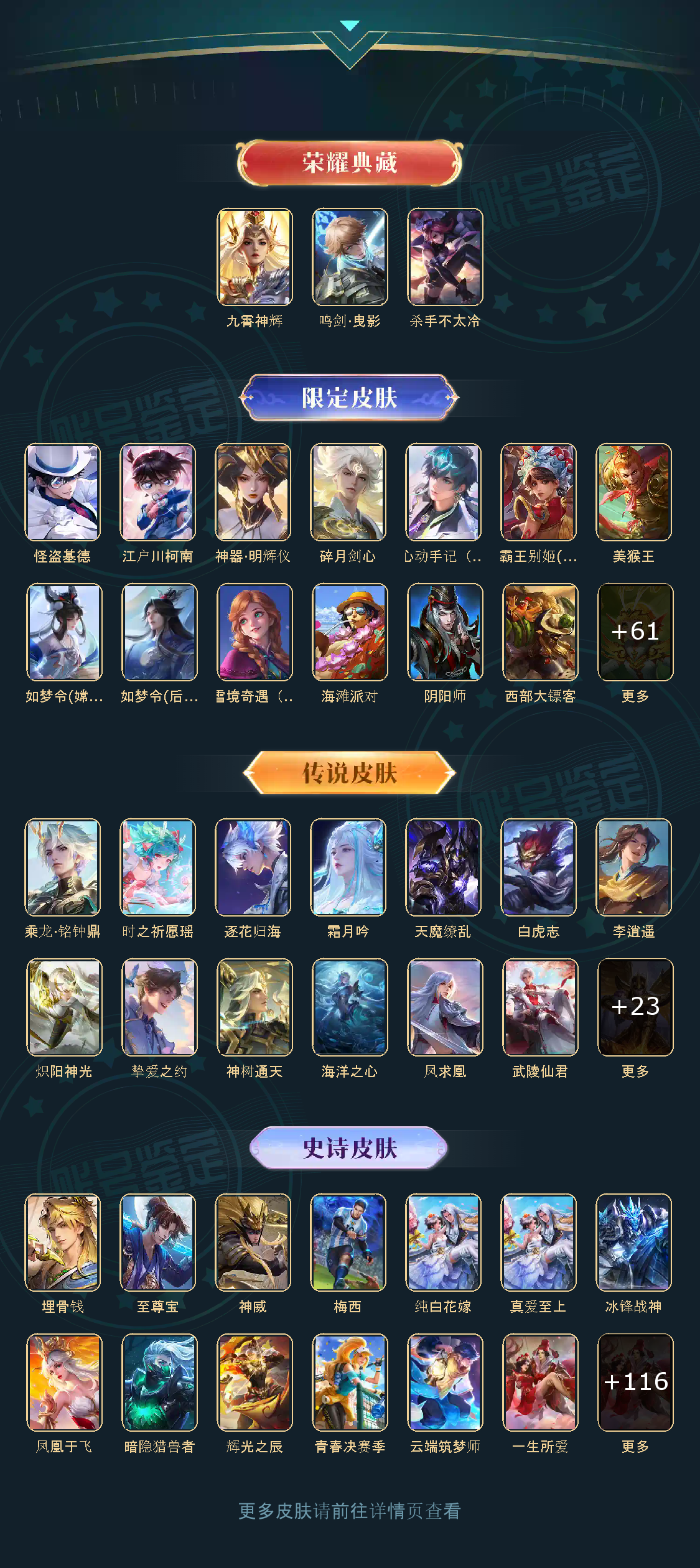 贵族等级V10,英雄数量123,典藏皮肤数3,皮肤数量400,冰锋战神/街头霸王/纯白花嫁/天魔缭乱/至尊宝/杀手不太冷/真爱至上/凤求凰/武陵仙君/梅西/一生所爱/大圣娶亲/冰霜恋舞曲/青龙志/白虎志/朱雀志/飞衡/梁祝/白鹤梁神女/鸣剑·曳影/李逍遥/神威/淬星耀世