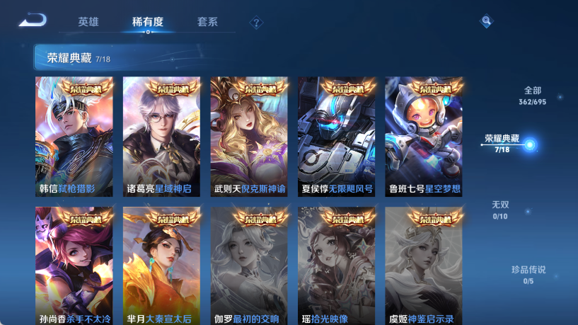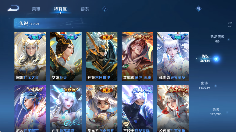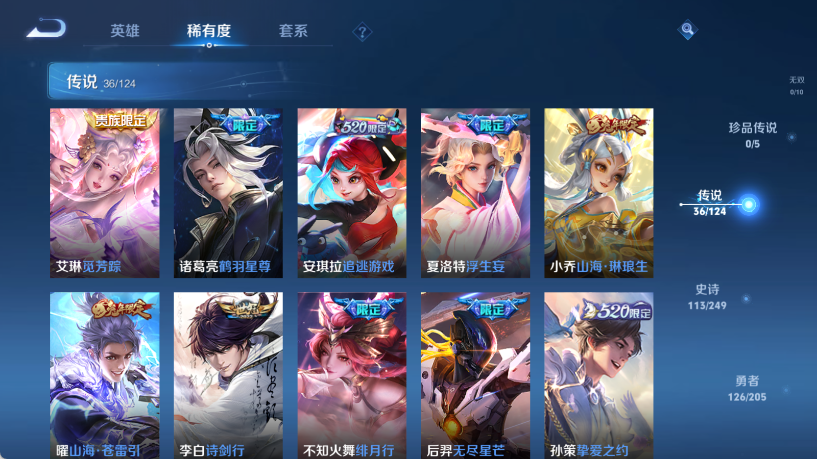 贵族等级V10,英雄数量123,典藏皮肤数7,皮肤数量376,冰锋战神/街头霸王/纯白花嫁/天魔缭乱/杀手不太冷/大秦宣太后/星空梦想/无限飓风号/黄金狮子座/冰霜恋舞曲/太华/久胜战神/梁祝/倪克斯神谕/白鹤梁神女/匿光追影者/龙胆/星域神启/奔雷神使/补天/异界灵契/启示之音/傲雪梅枪/淬星耀世/时雨天司