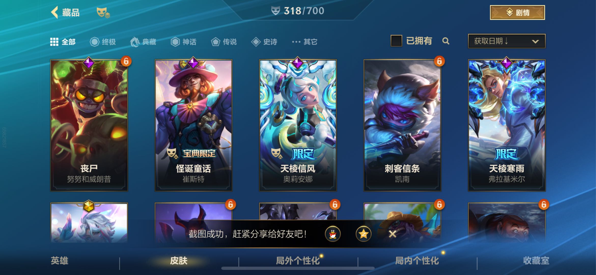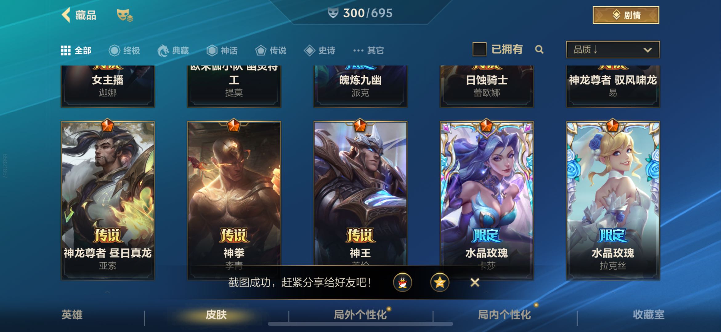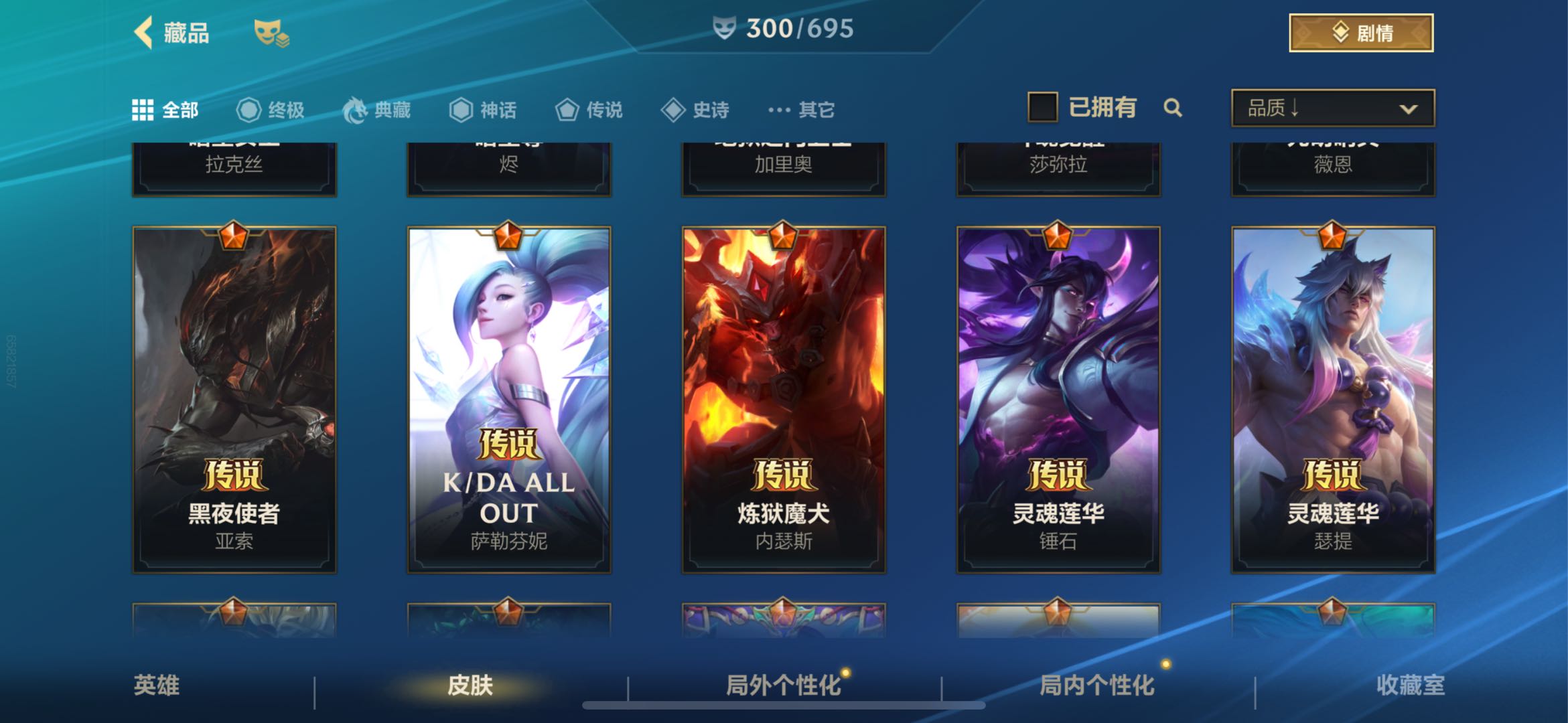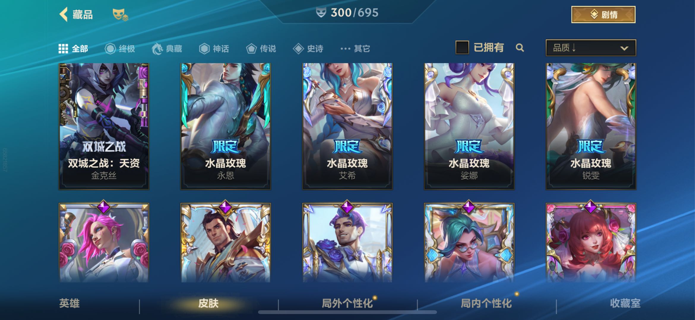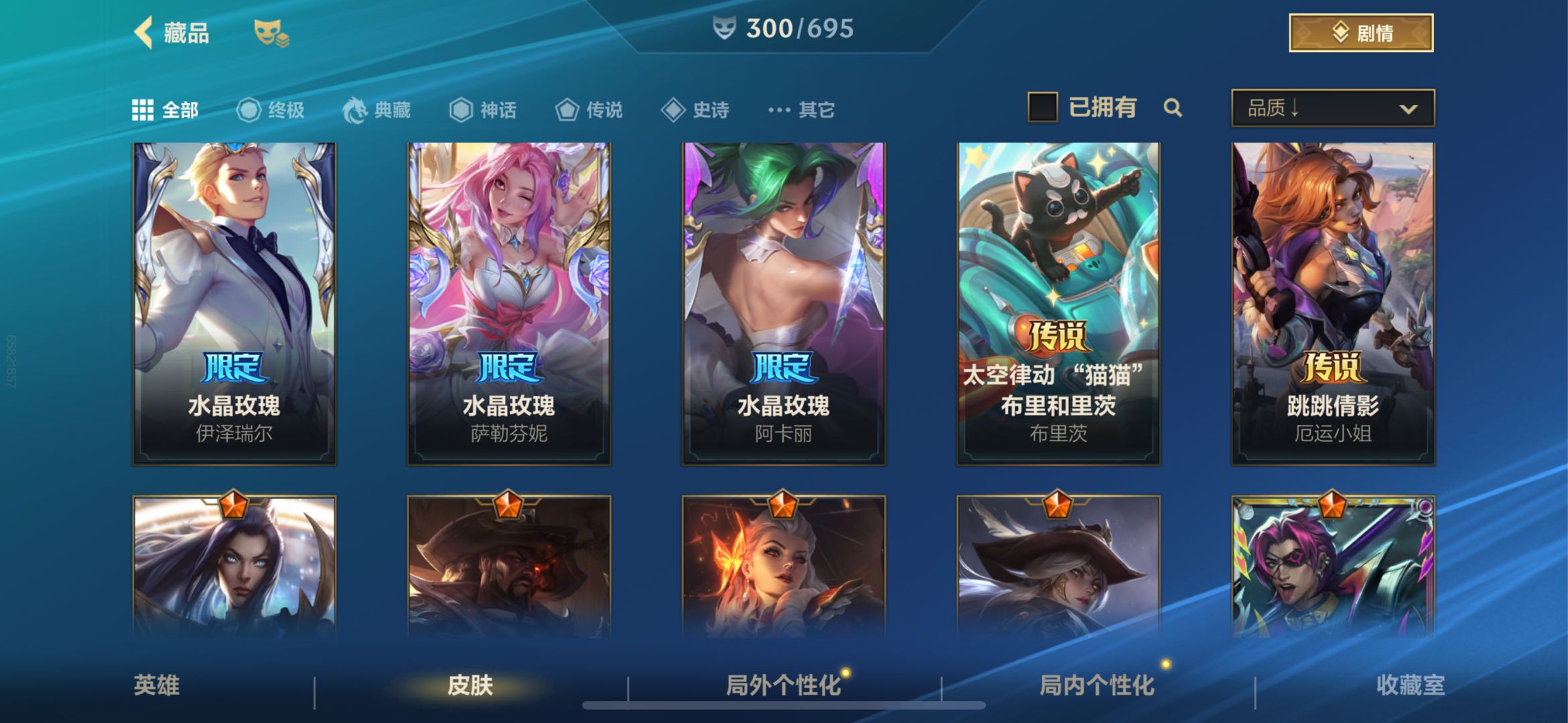【传说皮肤】42 水晶玫瑰卡莎 魄炼九幽派克 暗星女王拉克丝 暗星尊烬 地狱之门卫士加里奥 斗魂觉醒莎弥拉 光明哨兵薇恩 黑夜使者亚索 KDAALLOUT萨勒芬妮 炼狱魔犬内瑟斯 灵魂莲华瑟提 灵魂莲华锤石 女主播迦娜 欧米伽小队幽灵特工提莫 日蚀骑士蕾欧娜 神龙尊者驭风啸龙易 神拳李青 神王盖伦 水晶玫瑰拉克丝 水晶玫瑰伊泽瑞尔 水晶玫瑰萨勒芬妮 水晶玫瑰阿卡丽 太空律动猫猫布里和里茨布里茨 跳跳倩影厄运小姐 未来战士凯特琳 西部魔影卢锡安 西部魔影大小姐蕾欧娜 西部天使艾希 心之钢凯隐 星域游侠崔斯特 星之守护者卡莎 星之守护者金克丝 星之守护者落霞 驯龙炮手崔丝塔娜 源计划毁灭派克 源计划净化薇恩 源计划联合艾希 源计划林易 源计划泯灭雷克顿 月蚀骑士蕾欧娜 战斗学院凯特琳 战斗学院伊泽瑞尔【史诗皮肤】143 金玉贺吉艾瑞莉娅 翼翼飞花洛 福纳康宁伊芙琳 源计划征伐德莱厄斯 源计划匿影图奇 我羽饰骑士崔丝塔娜 梦境绅探凯南 双城之战天资金克丝 水晶玫瑰艾希 水晶玫瑰弗拉基米尔 猎梦吞噬体卡兹克 满弓镇魂韦鲁斯 永恒之森洛 运筹帷幄斯维因 雷霆丹心卡蜜尔 小蜜蜂努努和威朗普 劲道美味阿木木 玉剑传说翼剑仙凯尔 神龙尊者炎龙瑟提 涂鸦小队泽丽 涂鸦小队古拉加斯 秀逸墨羽霞 黯晶巨鳄雷克顿 暗星韦鲁斯 暗星墨菲特 暗星奥莉安娜 奥术大师吉格斯 霸天剑魔亚托克斯 霸天战车厄加特 霸天战士雷恩加尔 霸天战鹰加里奥 冰川巨兽墨菲特 苍穹之光布兰德 晨星之翎洛 盗梦暗影锤石 盗梦者内瑟斯 地下拳王李青 地狱火加里奥 电玩女神卡莎 电玩上校库奇 斗魂觉醒卡莉丝塔 斗魂无双尼菈 斗魂无双德莱文 恶魔之刃泰达米尔 福牛守护者德莱厄斯 光明哨兵锐雯 海之歌萨勒芬妮 海之歌泽丽 寒冬精灵璐璐 黑夜使者泰达米尔 黑夜使者弗拉基米尔 禁卫机甲格雷福斯 绝代智将斯维因 雷喵喵尔雷恩加尔 黎明使者卡尔玛 猎龙勇士潘森 灵魂莲华提莫 灵魂莲华永恩 灵魂莲华崔丝塔娜 灵魂莲华莉莉娅 灵魂莲华亚索 灵能特工凯尔 灵能特工莎弥拉 魅惑女巫薇古丝 魅惑女巫莫甘娜 猛虎布隆 梦境灵探赛娜 觅心猫猫悠米 觅心射手韦鲁斯 末路管家布隆 魔女卡蜜尔 欧米伽小队鬼影蛙人菲兹 欧米伽小队魔鬼伞兵崔丝塔娜 苹果机器人布里茨 破败军团厄运小姐 破败军团希瓦娜 清剿小队金克丝 清剿小队潘森 绒毛菲兹 神龙尊者玉境灵龙卡莎 神奇先驱杰斯 圣龙奥瑞利安·索尔 水晶玫瑰娑娜 水晶玫瑰薇恩 水晶玫瑰格温 水晶玫瑰永恩 水晶玫瑰嘉文四世 水晶玫瑰蔚 水晶玫瑰杰斯 水晶玫瑰锐雯 睡衣守护者伊泽瑞尔 睡衣守护者拉克丝 死亡誓约劫 太空律动节奏幻师璐璐 太空律动舞林双子努努和威朗普 探梦奇旅艾克 天启骑士杰斯 屠龙勇士凯尔 涂鸦小队艾克 未来战士慎 未来战士锤石 我怒角维迦 无限烈焰黛安娜 西部魔影持枪女巫莎弥拉 西部魔影猎天使恶魔泰隆 西部魔影送葬人图奇 西部魔影执行人卡特琳娜 西部天使艾瑞莉娅 心之钢永恩 腥红之月烬 腥红之月黛安娜 星之守护者索拉卡 星之守护者娑娜 星之守护者璐璐 星之守护者迦娜 星之守护者奥莉安娜 星之守护者佐伊 驯龙女巫璐璐 银河魔装机神菲兹 泳池派对菲奥娜 泳池派对奥莉安娜 泳池派对格雷福斯 泳池派对凯特琳 泳池派对璐璐 泳池派对吉格斯 柚子软糖菲兹 宇航员诺提勒斯 玉剑传说苍鸾莫甘娜 玉剑传说寒潭夭夭娜美 玉剑传说舞剑仙艾瑞莉娅 玉剑传说无双菲奥娜 源代码卡蜜尔 源计划裁决蔚 源计划雷卢锡安 源计划燃泽丽 源计划山蕾欧娜 源计划天眼韦鲁斯 源计划阴劫 怨之砂派克 战场之王亚索 战斗学院阿克尚 真实伤害赛娜 奈落之炎慎【其他皮肤】97 蔷薇绅士杰斯 你看见过我的熊猫吗安妮 冠翎飞行员库奇 双城之战破枷蔚 龙冕异士烬 龙冕神策吉格斯 龙冕先锋赵信 龙冕御盾布隆 光明骑士诺提勒斯 猛龙雷克顿 五连摇滚鼓手奥拉夫 兔宝宝薇古丝 黯黑魔龙希瓦娜 暗黑女武神黛安娜 暗黑武士雷恩加尔 暗影易 暴风女神迦娜 闭月之颜貂蝉卡特琳娜 冰霜亚龙希瓦娜 苍穹之光韦鲁斯 超级英雄凯南 超武乾坤暗影阿卡丽 超武乾坤电弧凯南 冲击之刃劫 冲浪高手辛吉德 创世魔神内瑟斯 单身贵族内瑟斯 刀锋女王莫甘娜 德莱德莱德莱文 抵抗军玫瑰卡特琳娜 斗战胜佛孙悟空 鳄霸雷克顿 飞车暴走族古拉加斯 绯金鲛灵娜美 绯金丽刃菲奥娜 绯金魅影伊芙琳 绯金战斧德莱文 风执事加里奥 哥特女仆奥莉安娜 孤胆英豪嘉文四世 关羽云长泰达米尔 光明骑士贾克斯 光耀之灵璐璐 光耀之芒金克丝 光耀之刃泰达米尔 光耀之心奥莉安娜 光执事伊泽瑞尔 国王泰达米尔 海牛骑手库奇 海上霸主盖伦 海贼魅影卡特琳娜 河水之灵娜美 黑暗骑士布兰德 黑暗骑士阿利斯塔 黑暗骑士格雷福斯 极地女神艾希 绝命枪手卢锡安 莲花之令艾瑞莉娅 炼金狂士辛吉德 秘密特工赵信 觅心猎手薇恩 缪斯女神娑娜 末世天使凯尔 哞利斯塔阿利斯塔 女帝厄运小姐 女警官蔚 偶像歌手阿狸 热血班长德莱厄斯 熔火之心拉莫斯 烧烤女神蕾欧娜 狮心布隆 时之砂艾克 双城之战蔚 双城之战金克丝 死亡骑士盖伦 死亡绽放卡兹克 探戈灵魂伊芙琳 铁哥们儿奥拉夫 铁血狙击手凯特琳 兔宝宝提莫 兔宝宝菲兹 兔宝宝布里茨 兔宝宝吉格斯 王牌舰长崔斯特 王牌上将嘉文四世 王牌司