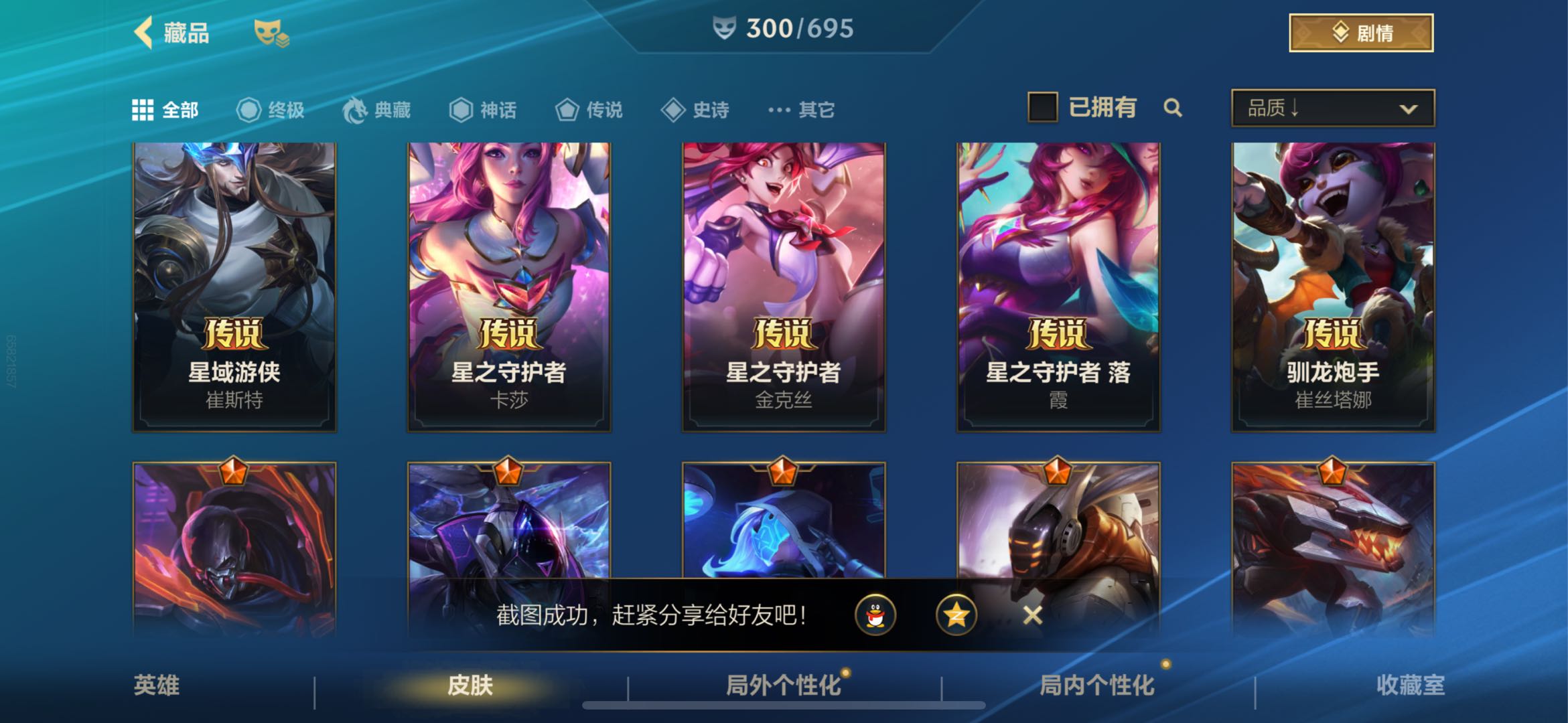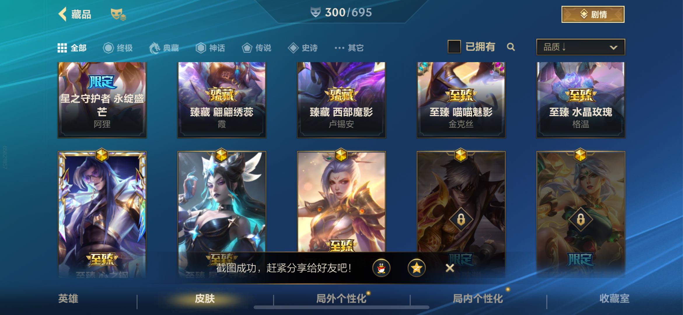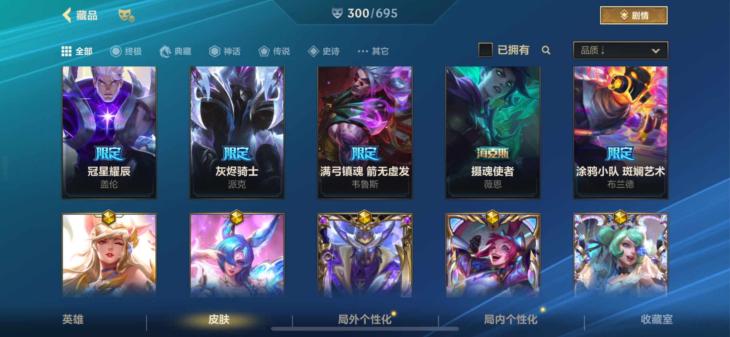 【神话皮肤】13 臻藏翩翩绣蕊霞 臻藏西部魔影卢锡安 至臻星之守护者辛德拉 至臻喵喵魅影金克丝 至臻水晶玫瑰格温 至臻心之钢永恩 至臻玉剑传说武剑仙锐雯 满弓镇魂箭无虚发韦鲁斯 涂鸦小队斑斓艺术布兰德 冠星耀辰盖伦 灰烬骑士派克 摄魂使者薇恩 星之守护者永绽盛芒阿狸