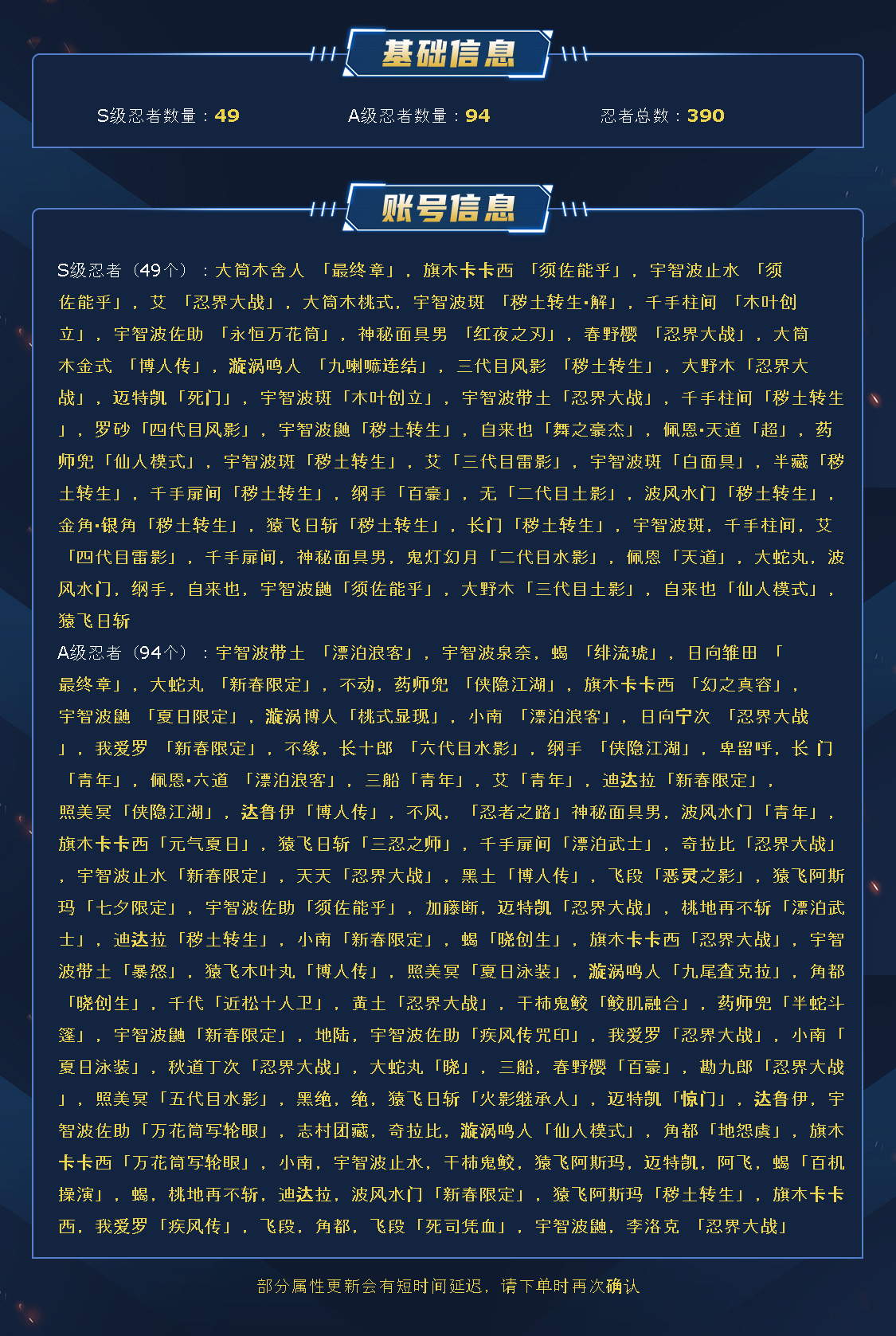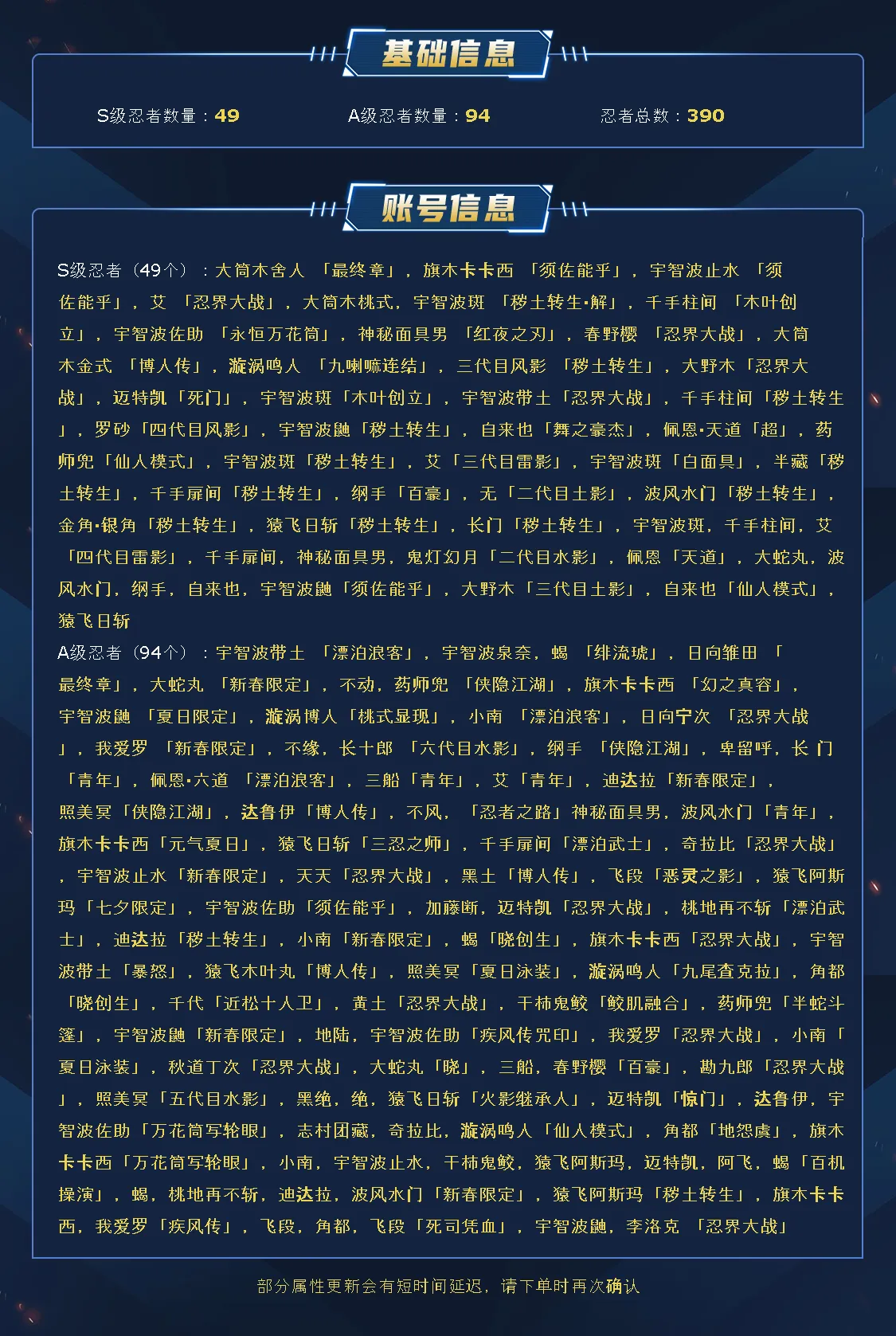 49S 93A 388忍者 宇智波带土「暴怒」/干柿鬼鲛「鲛肌融合」/宇智波佐助「疾风传咒印」/迈特凯「忍界大战」/宇智波带土「忍界大战」/宇智波斑「木叶创立」/佩恩·天道「超」青梅 宇智波带土「漂泊浪客」