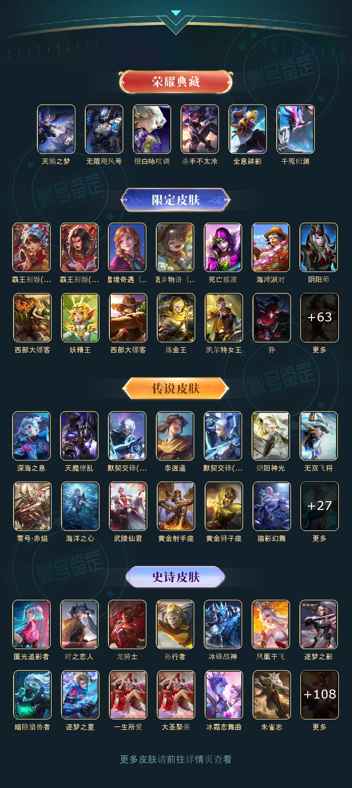 天鹅之梦,无限飓风号,银白咏叹调,天魔缭乱,默契交锋(兰陵王),李逍遥,默契交锋(花木兰),零号·赤焰,炽阳神光,匿光追影者,无双飞将,深海之息