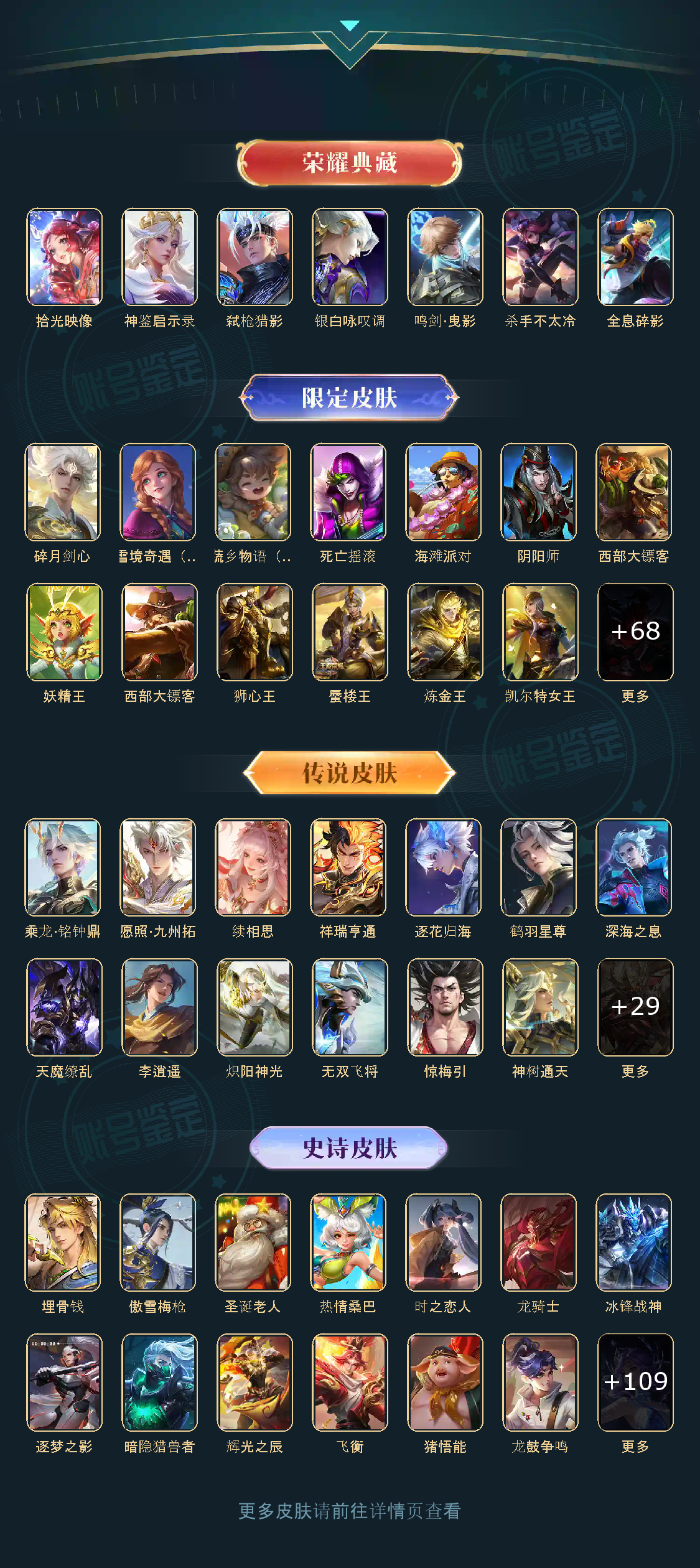 贵族等级V10,英雄数量124,典藏皮肤数7,皮肤数量414,