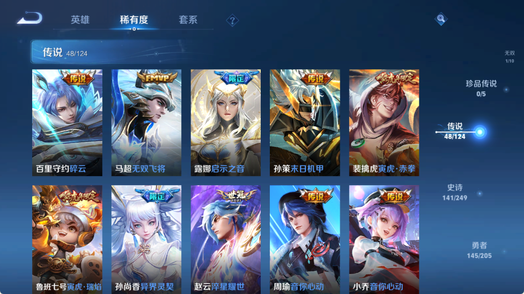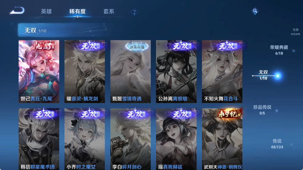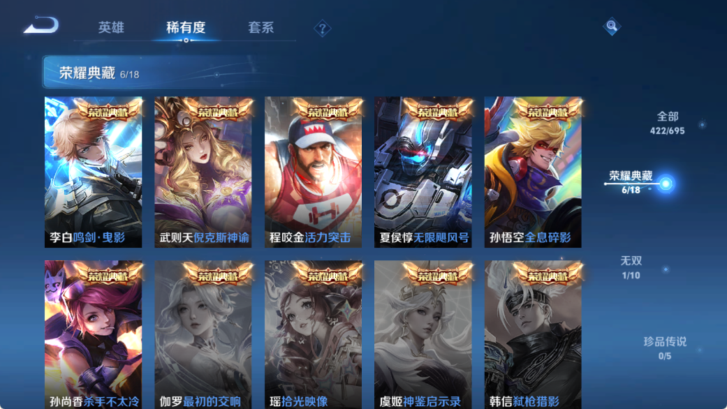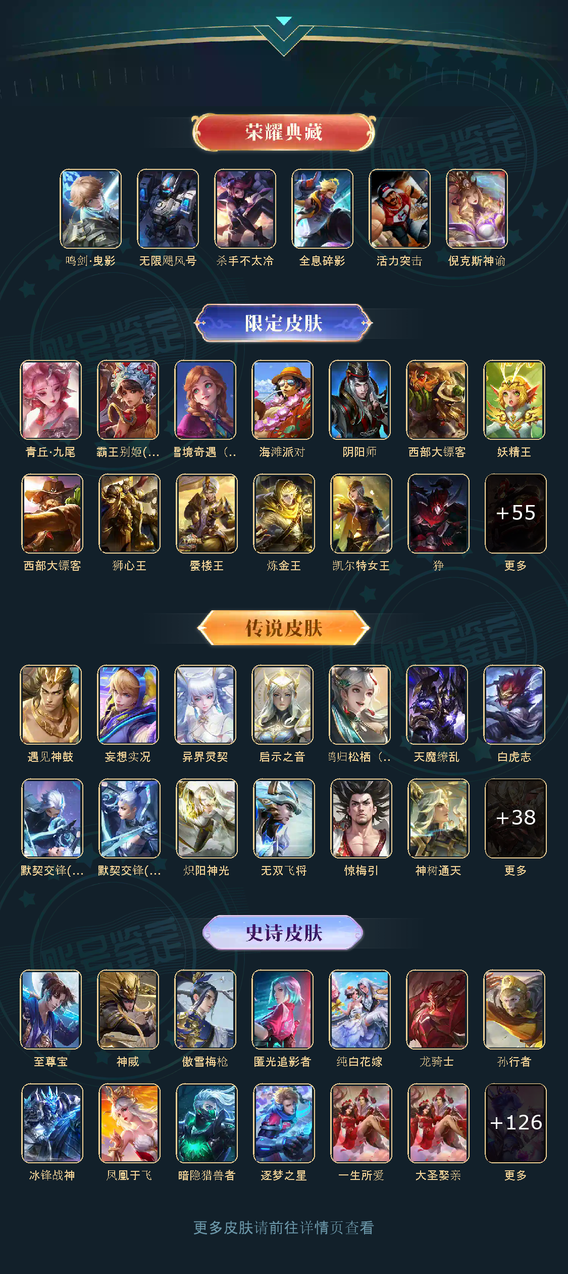 贵族等级V9,英雄数量123,典藏皮肤数6,皮肤数量422,无限飓风号/全息碎影/活力突击/倪克斯神谕/鸣剑·曳影